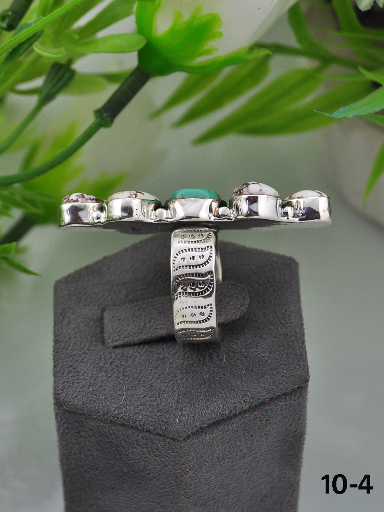 Southwest Made Multi Stone & Sterling Sliver Cluster Adjustable Ring. It measures 1 7/8 inches long and 5/8 of an inch wide. Signed by the artist and stamped sterling silver.