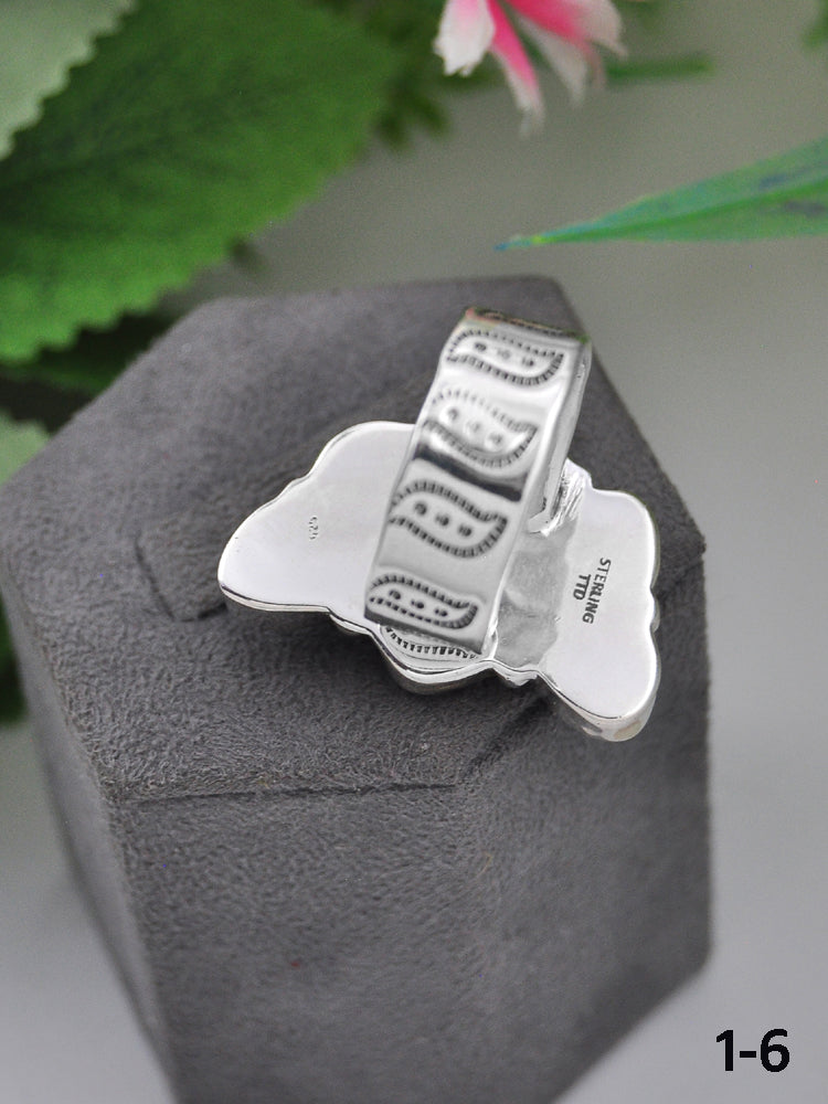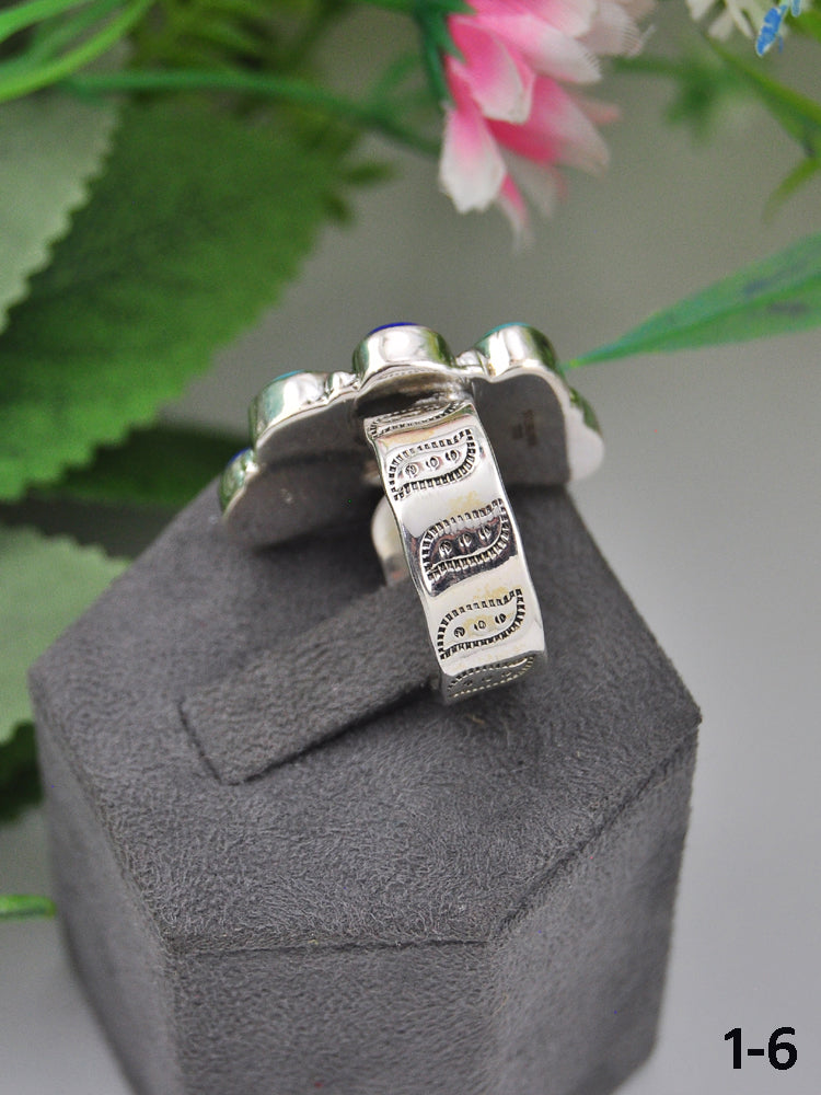 Southwest Made Multi Stone & Sterling Sliver Cluster Adjustable Ring. It measures 1 1/4 inches long and 7/8 of an inch wide. Signed by the artist and stamped sterling silver. Stones may differ due to natural stones.