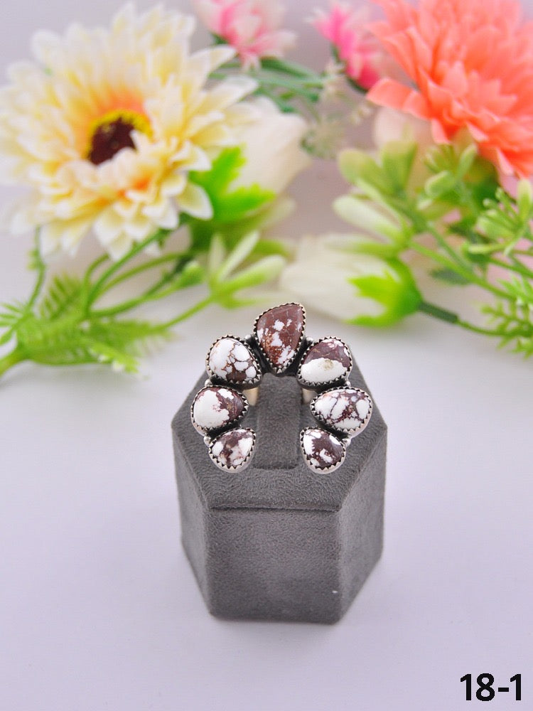 Southwest Made Wild Horse & Sterling Sliver Naja Adjustable Ring. It measures 1 1/2 inches long and 1 1/2 inches wide. Signed by the artist and stamped sterling silver. Stones may differ due to natural stones.