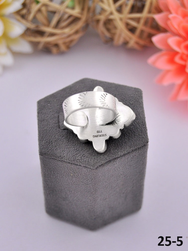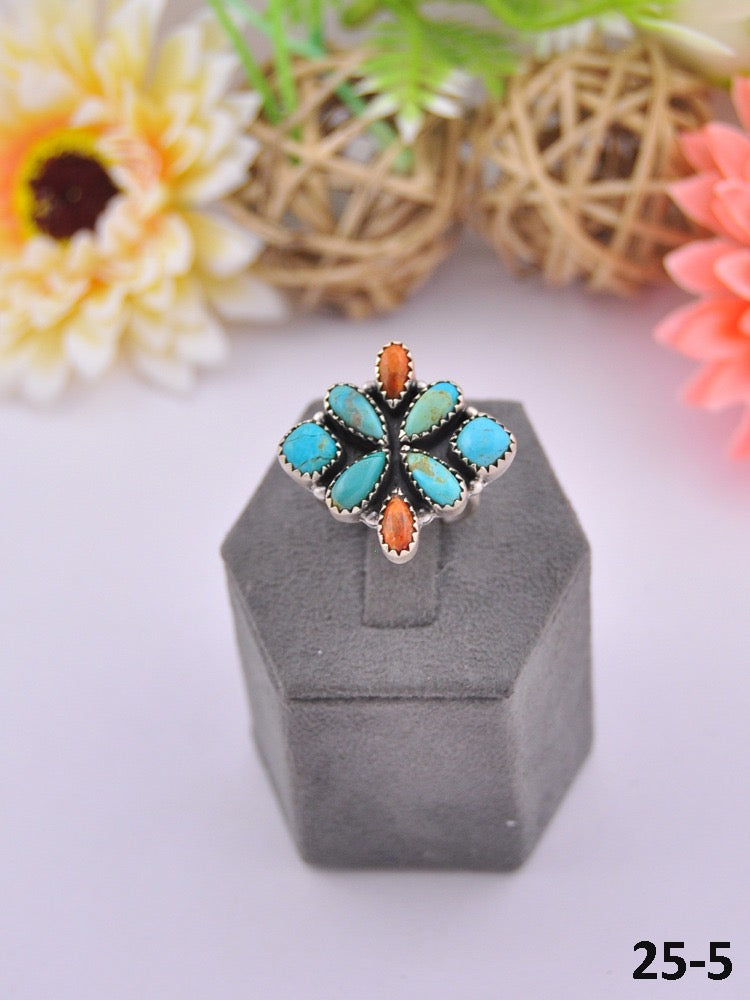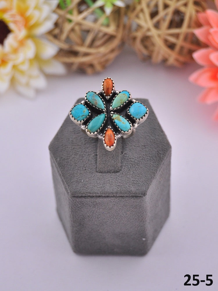 Southwest Made Multi Stone & Sterling Sliver Cluster Adjustable Ring. It measures 1 1/8 inches long and 1 1/8 inches wide. Signed by the artist and stamped sterling silver. Stones may differ due to natural stones.