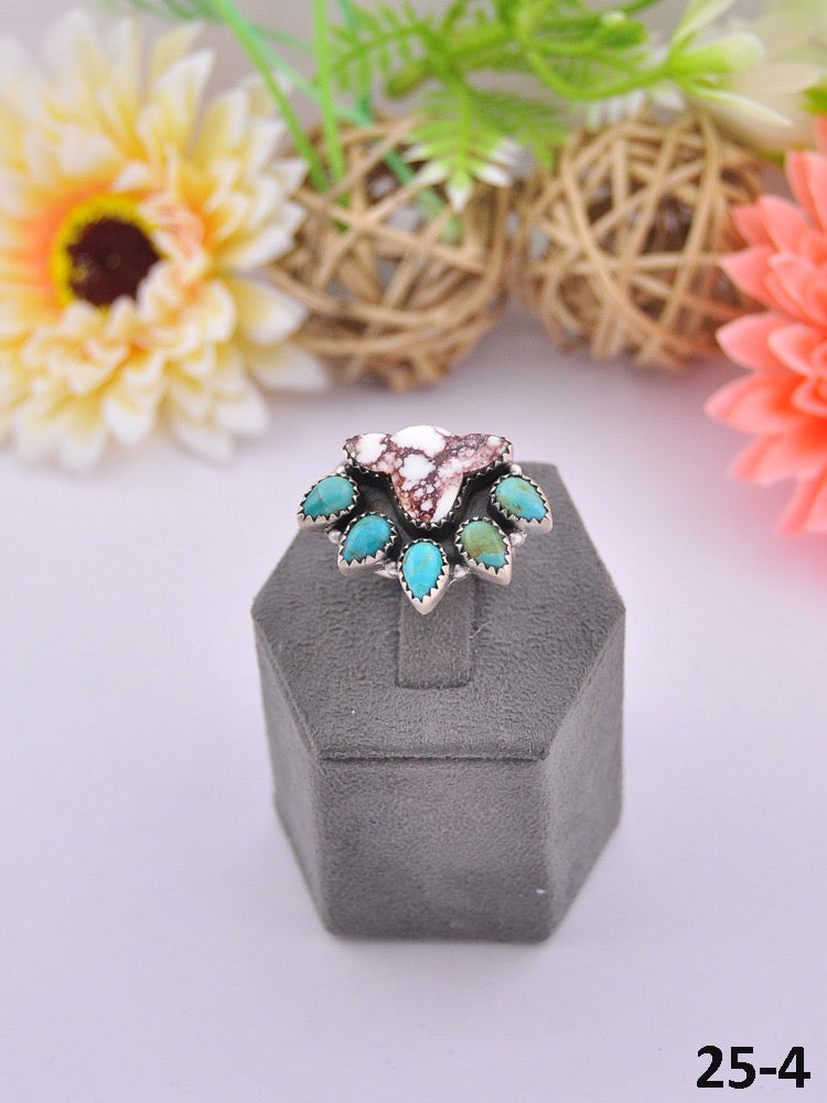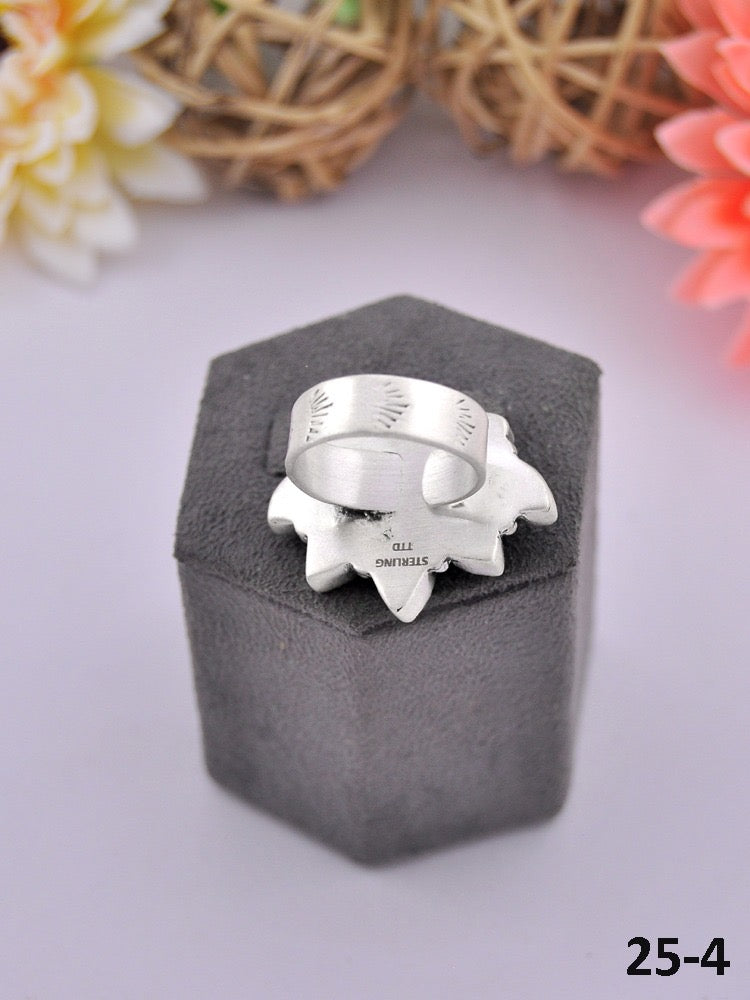 Southwest Made Multi Stone & Sterling Sliver Cluster Adjustable Ring. It measures 1 inch long and 1 1/4 inches wide. Signed by the artist and stamped sterling silver. Stones may differ due to natural stones.