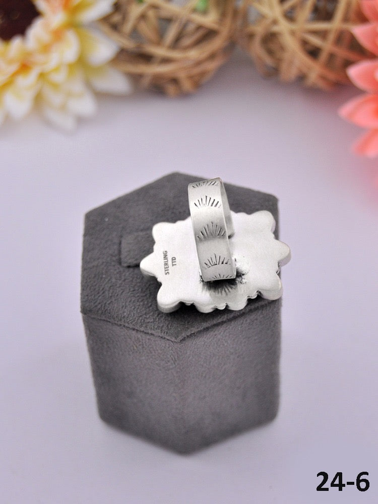 Southwest Made Multi Stone & Sterling Sliver Cluster Adjustable Ring. It measures 1 1/4 inches long and 7/8 of an inch wide. Signed by the artist and stamped sterling silver. Stones may differ due to natural stones.