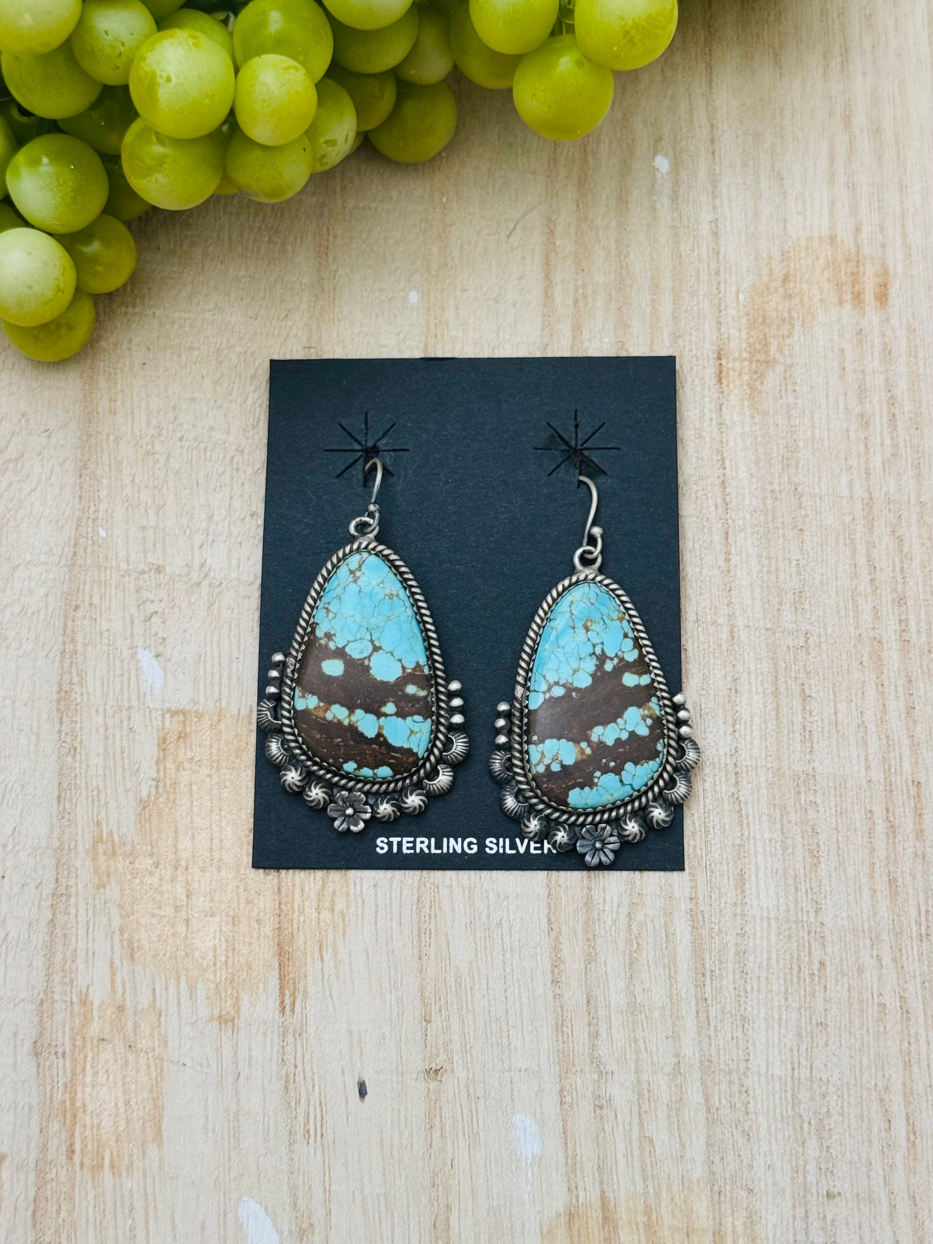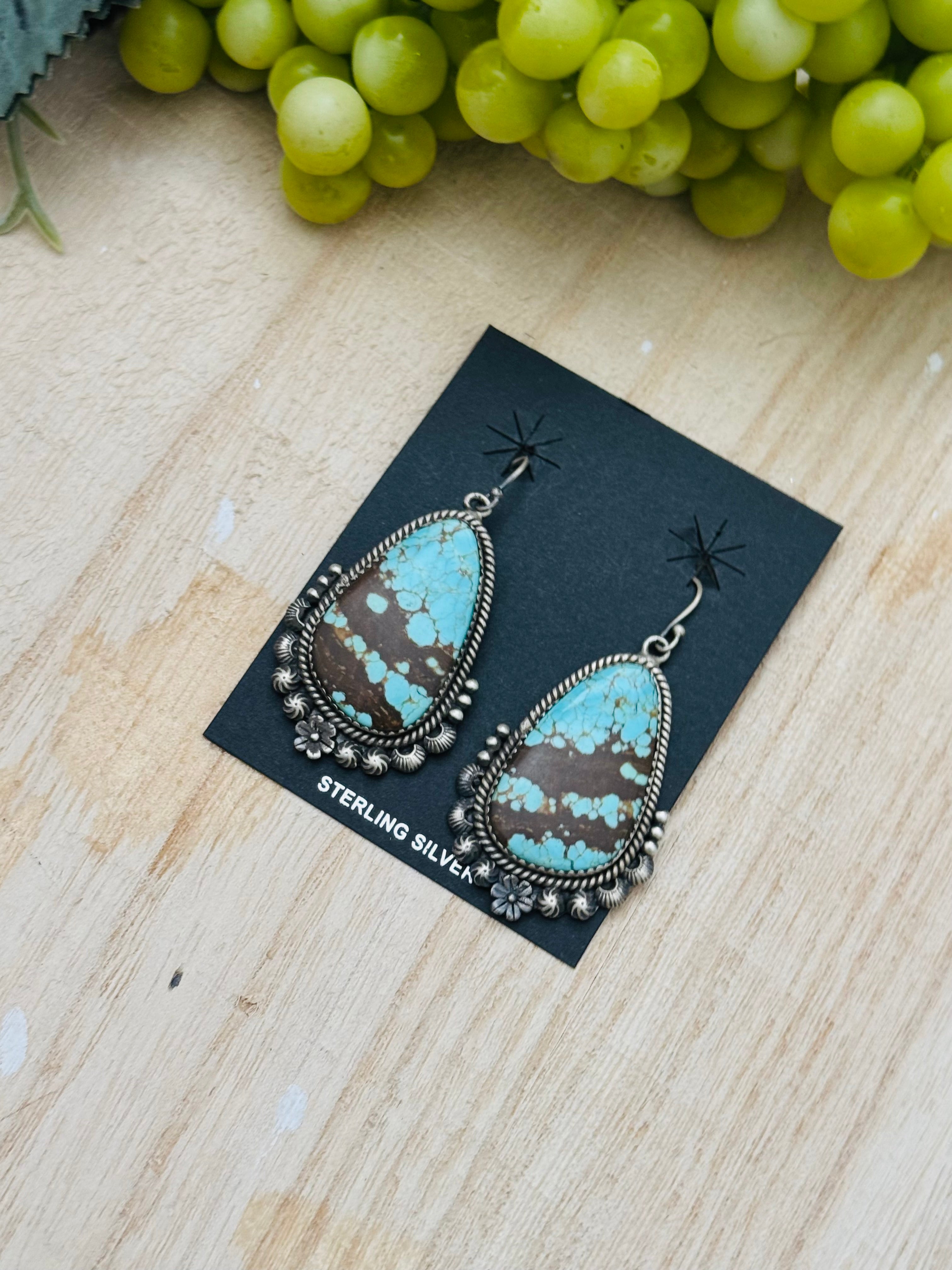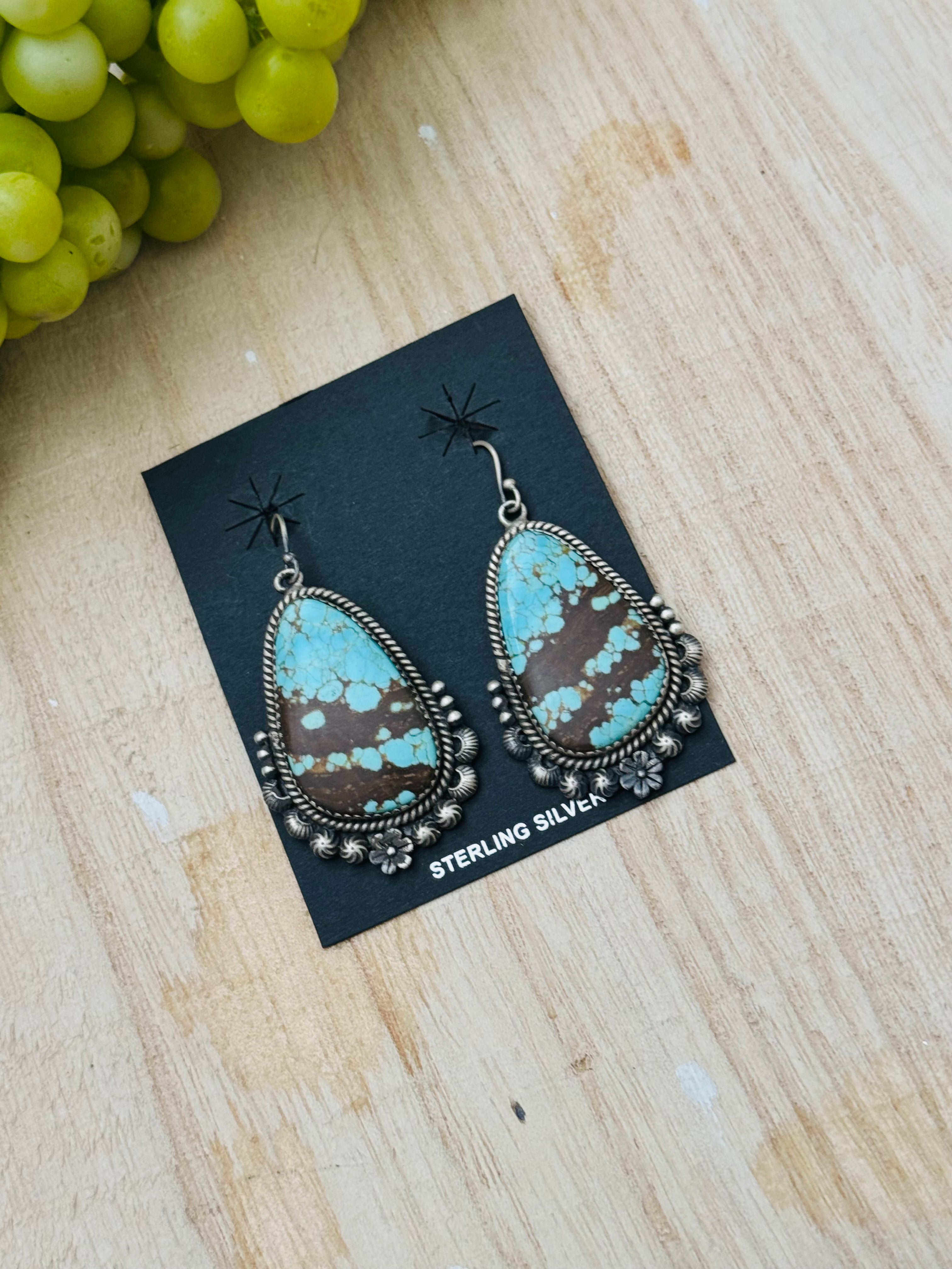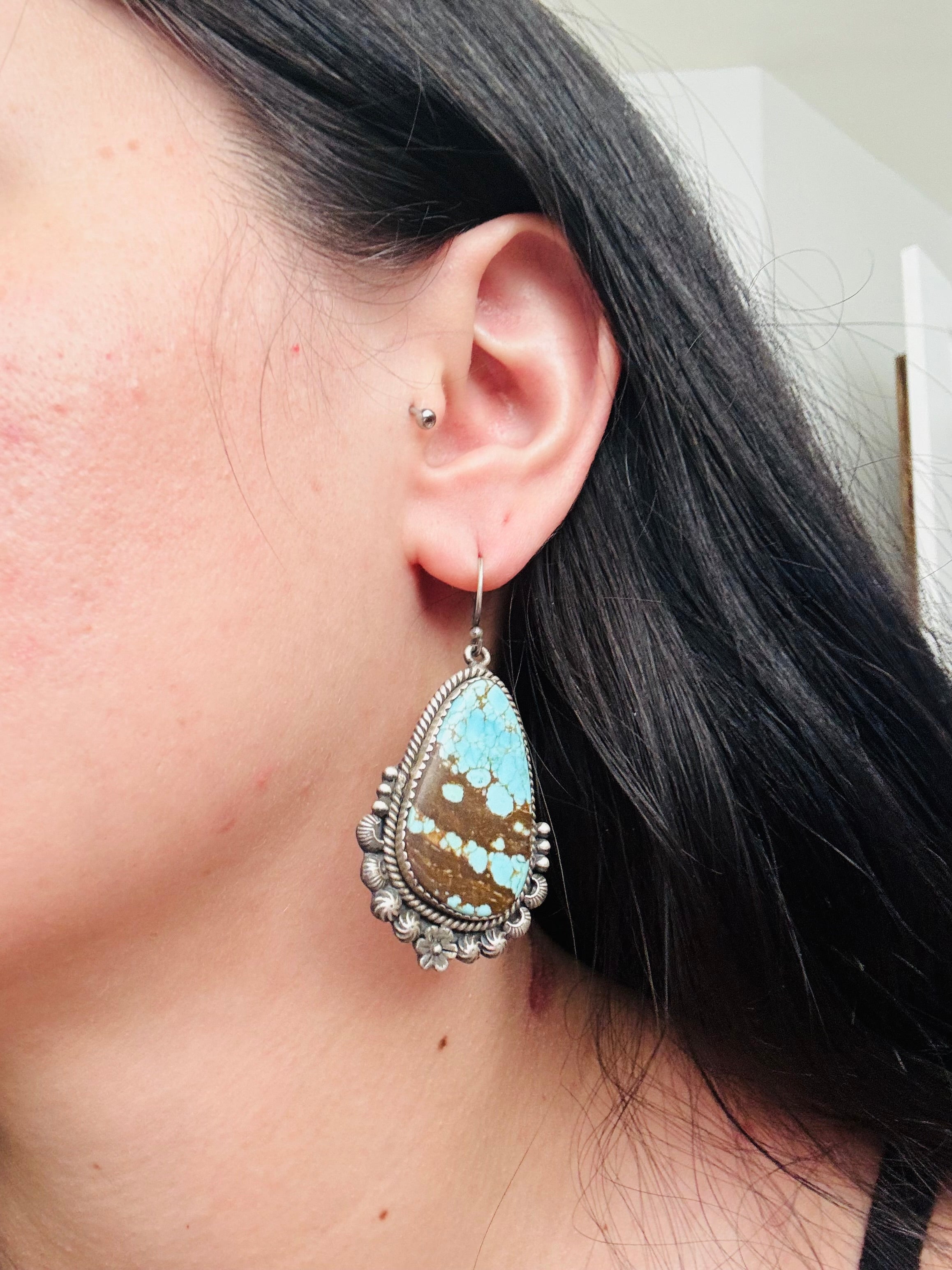 Southwest Made Number 8 Turquoise & Sterling Silver Dangle Earrings. It measures 2 1/4 inches long and 1 1/4 inches wide. Signed and Stamped.