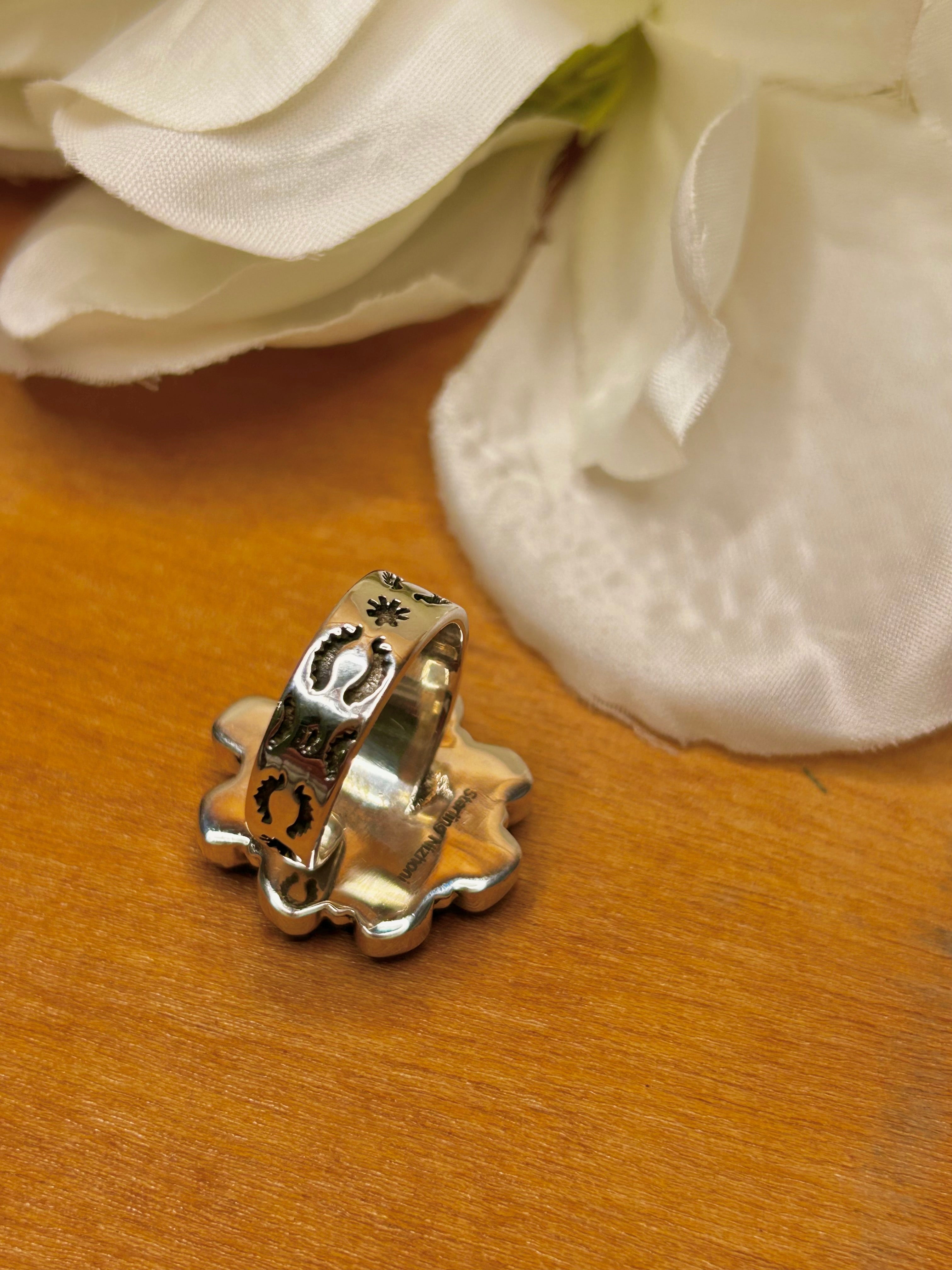 Southwest Made White Buffalo & Sterling Sliver Cluster Adjustable Ring. It measures 1 inch long and 1 inch wide. Signed by the artist and stamped sterling silver.