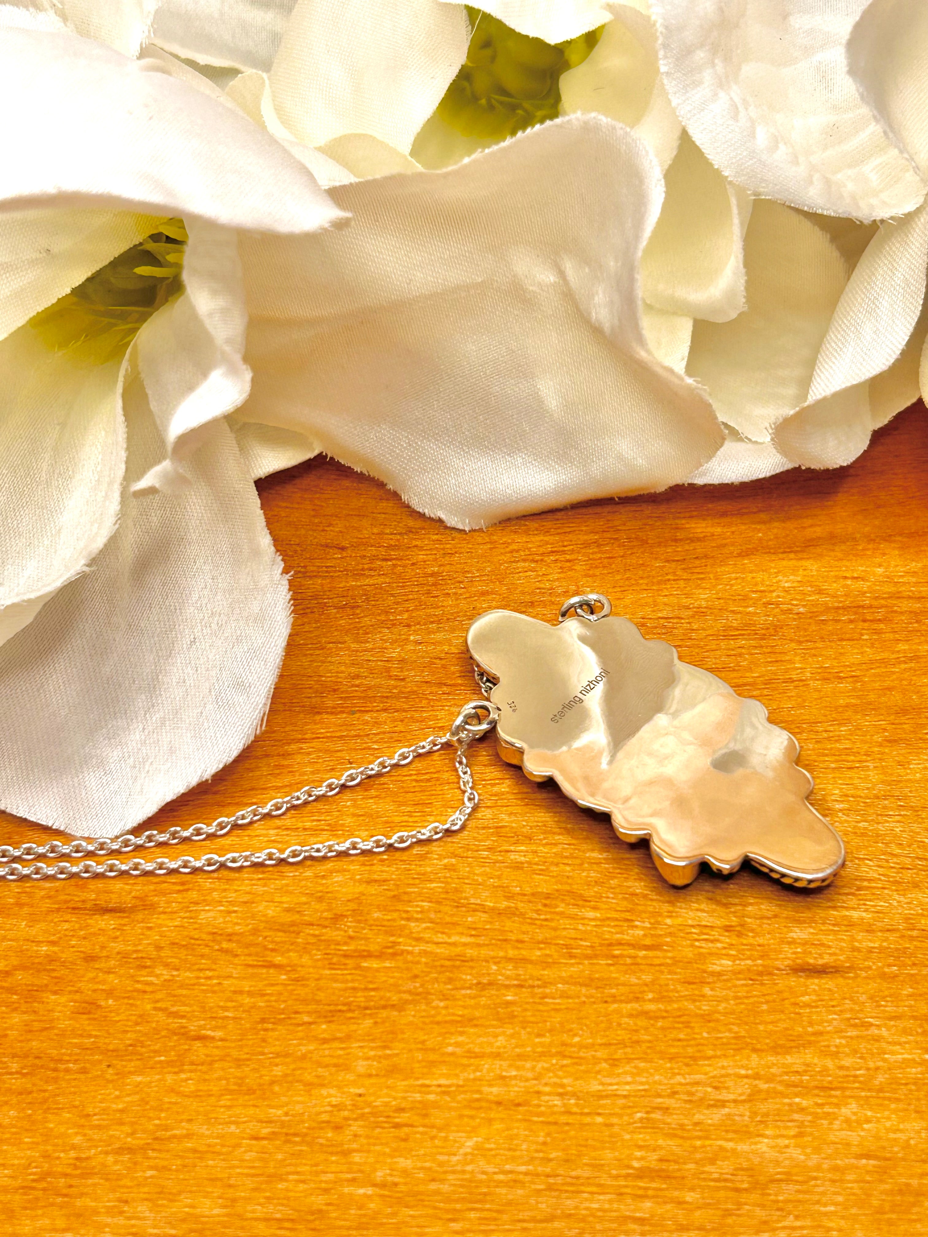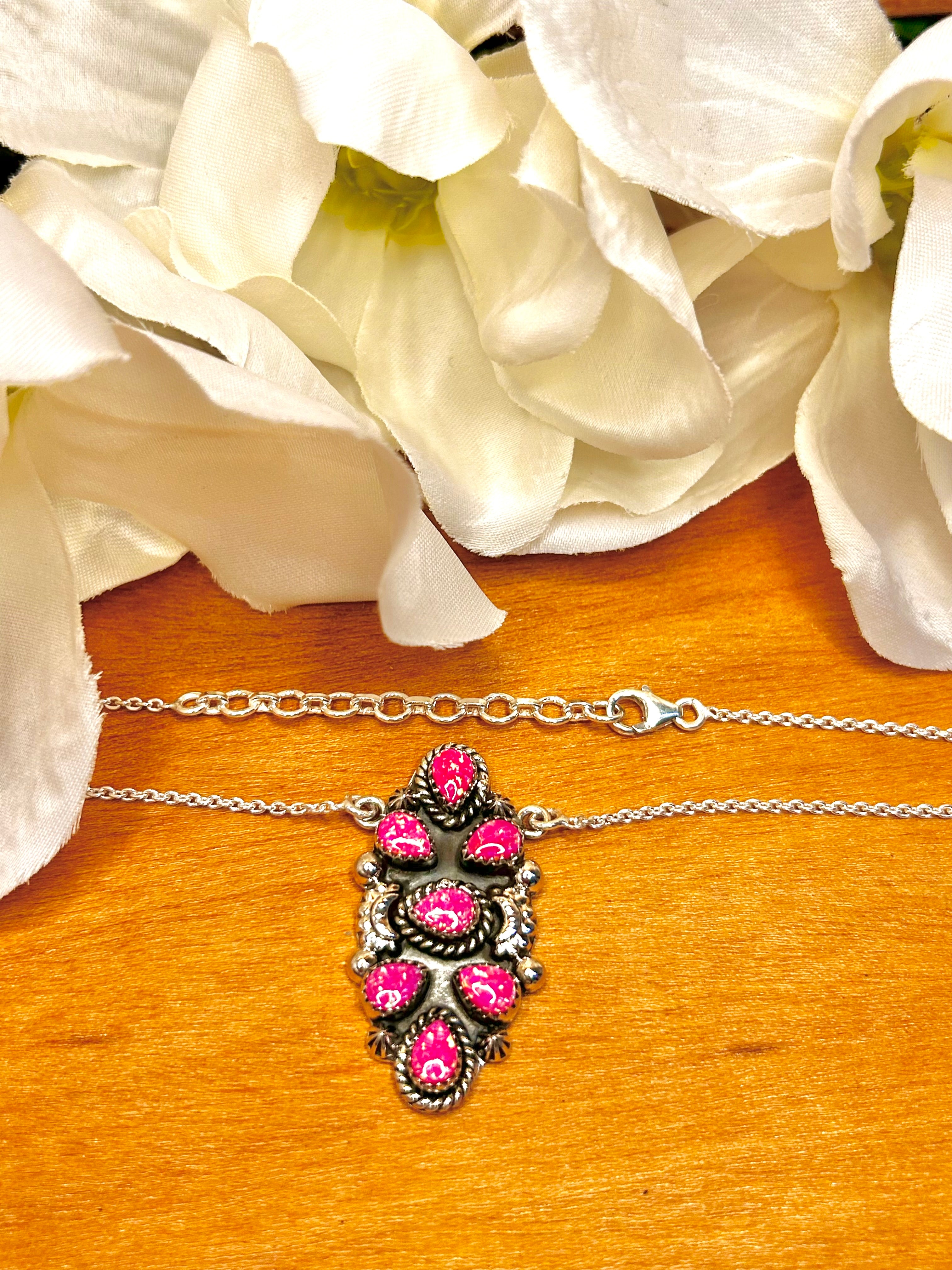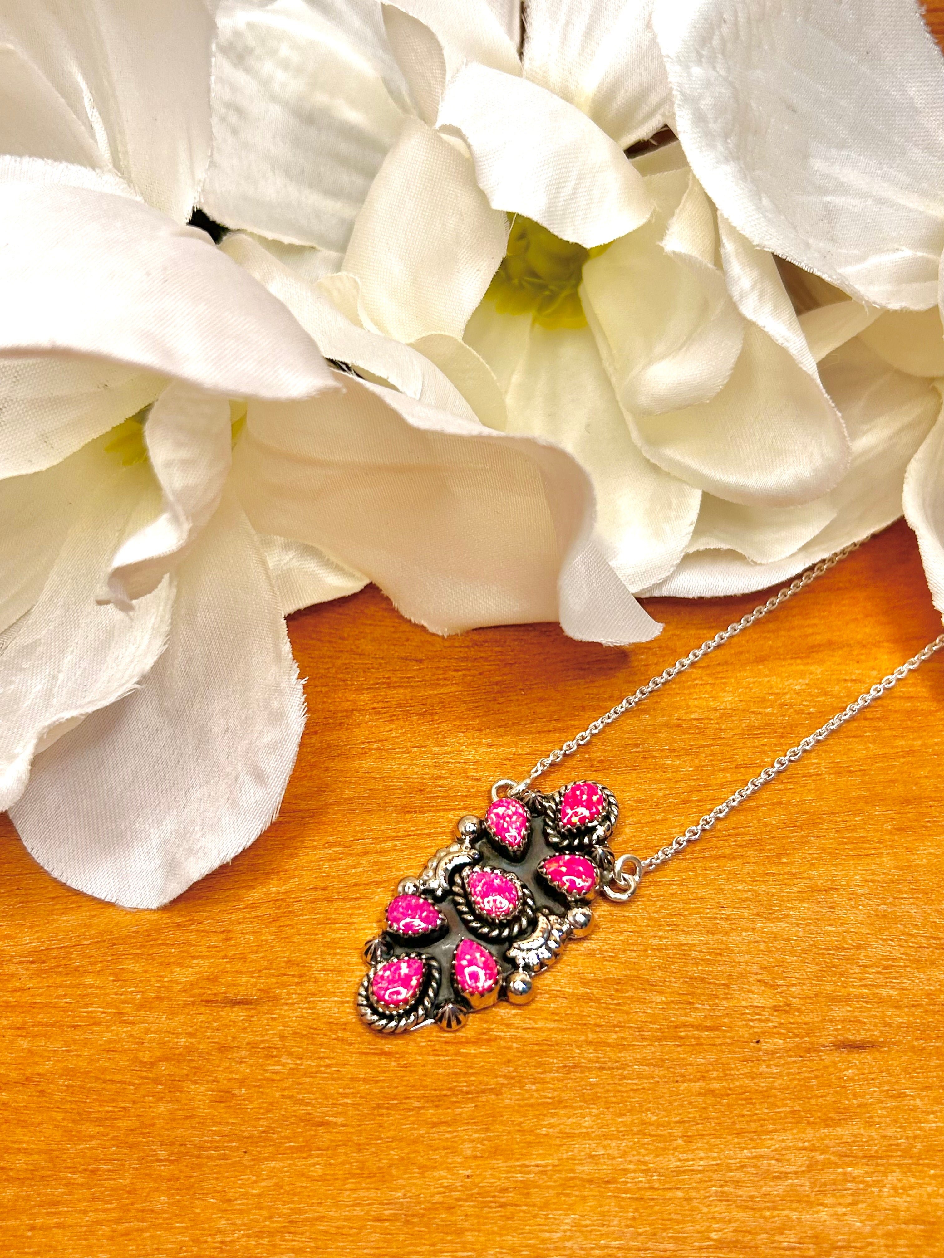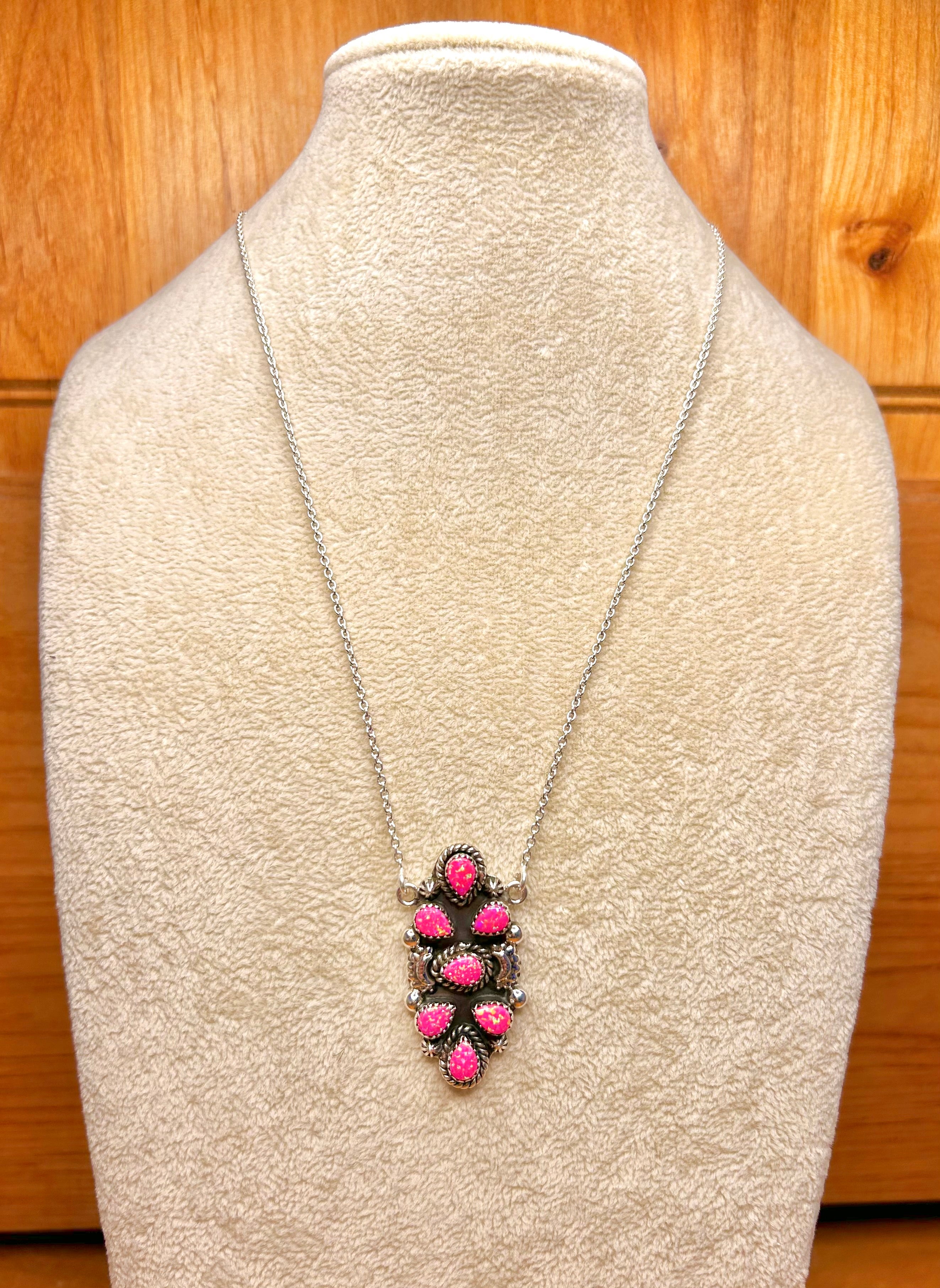Southwest Made Hot Pink Opal & Sterling Silver Cluster Necklace. It measures 22 inches long. Signed by the artist and stamped sterling silver.