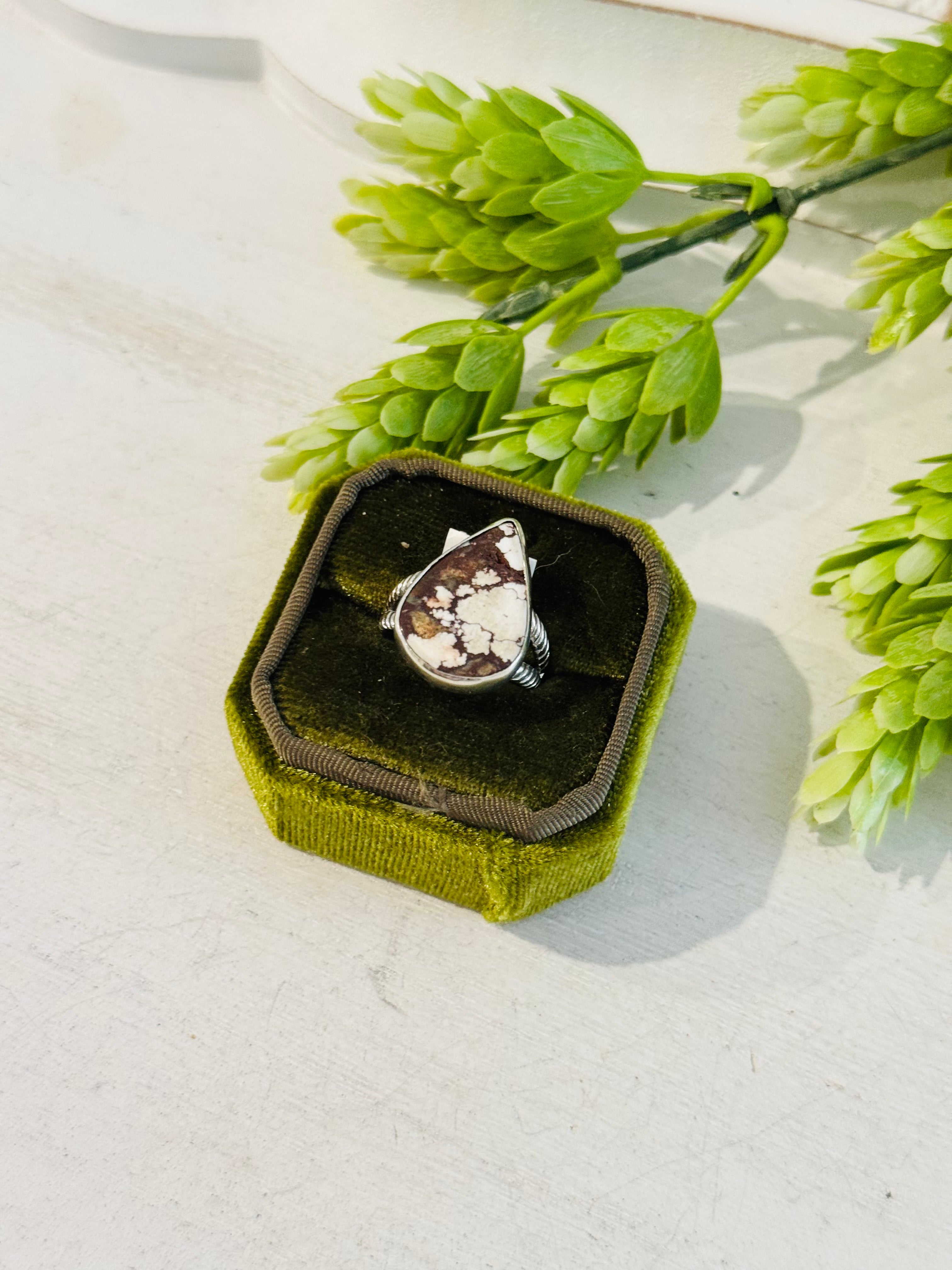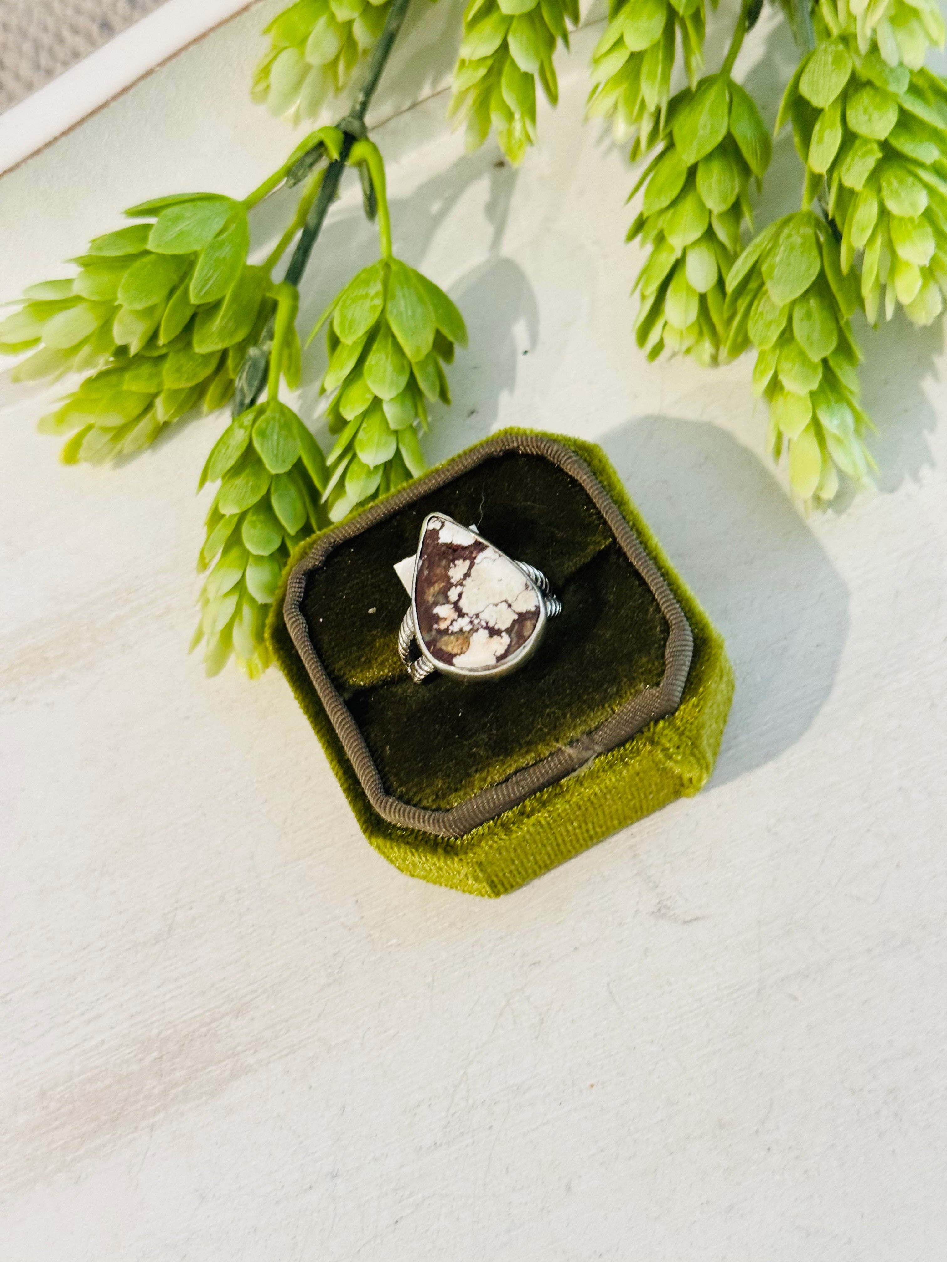 Southwest Made Wild Horse & Sterling Sliver Ring Size 7.5. It measures 7/8 of an inch long and 5/8 of an inch wide.