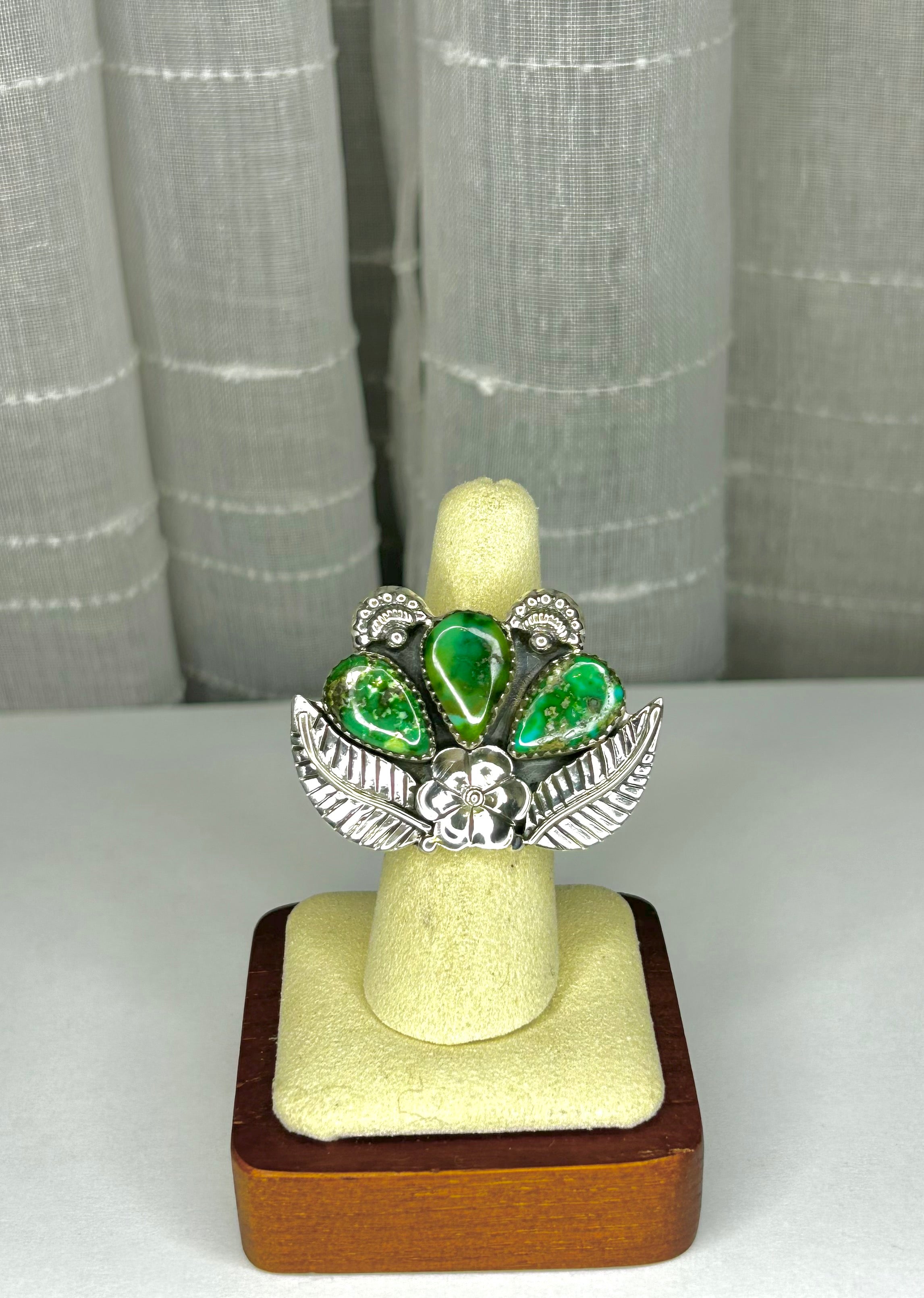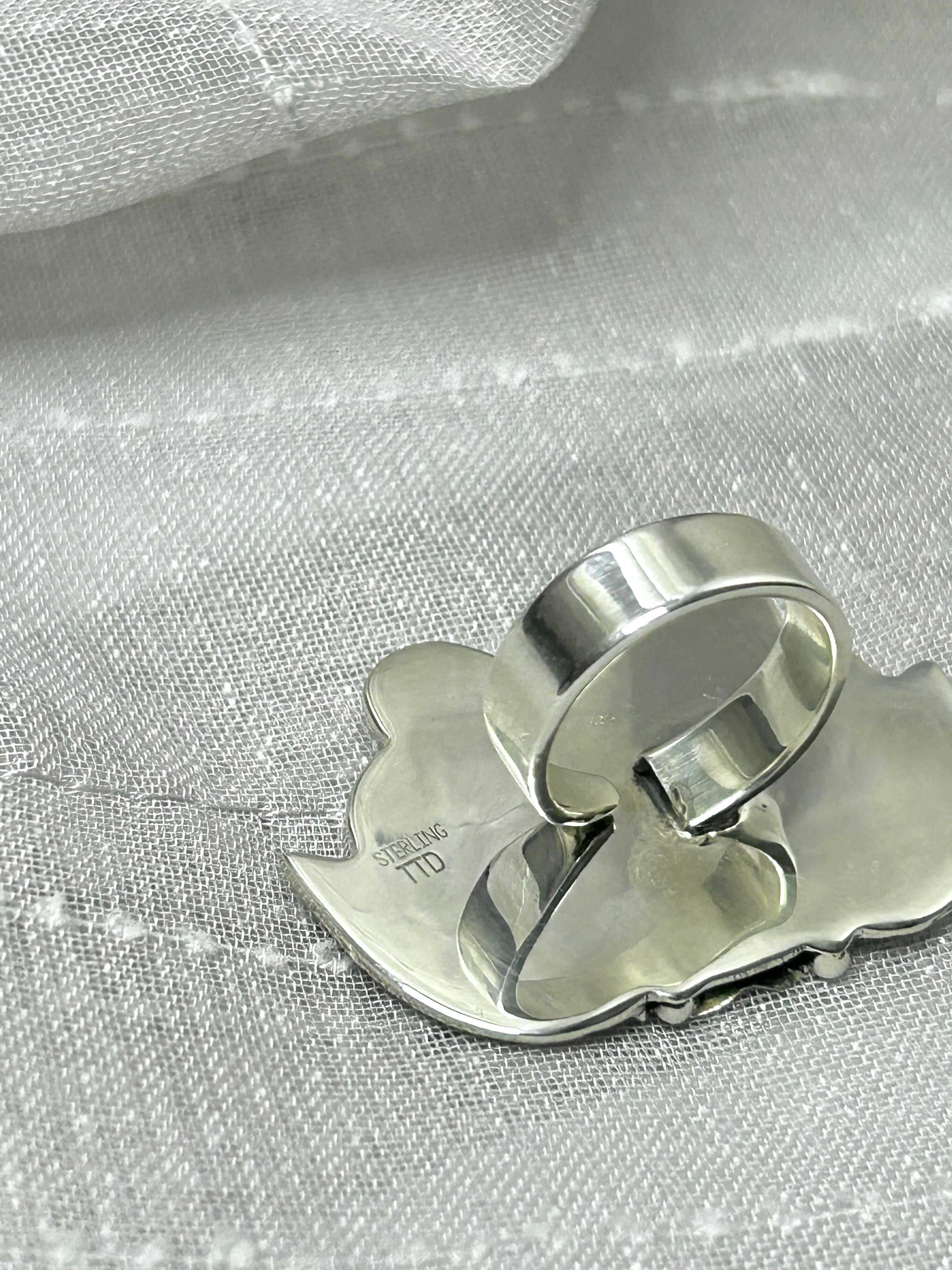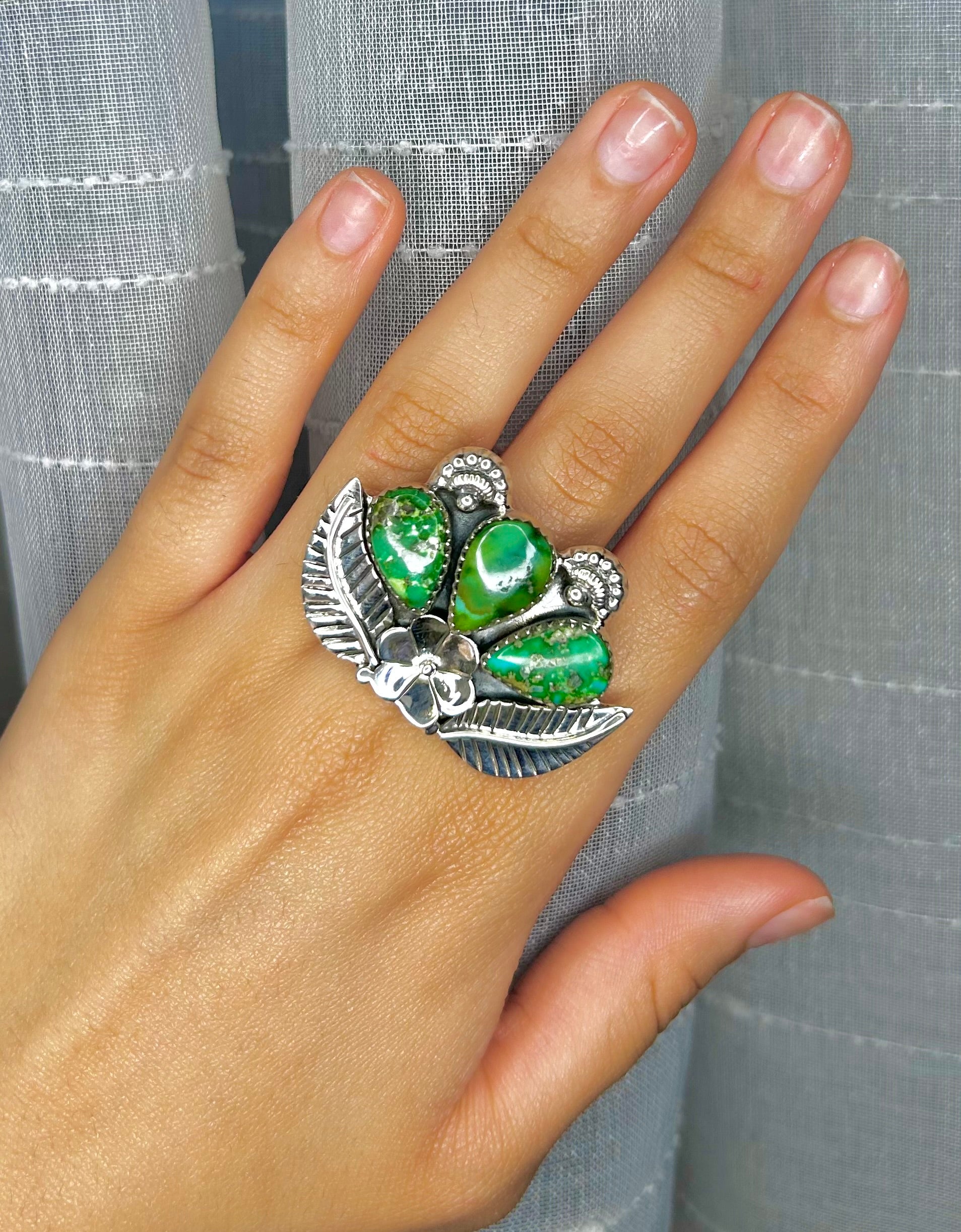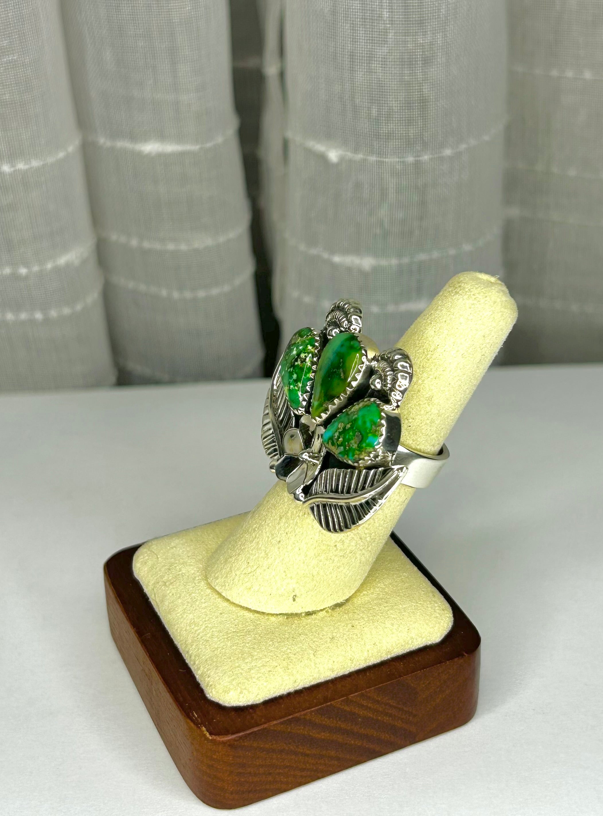 Southwest Made Sonoran Mountain Turquoise & Sterling Sliver Cluster Ring Size 7. It measures 1 3/4 inches long and 1 1/4 inches wide. Signed by the artist and stamped sterling silver.