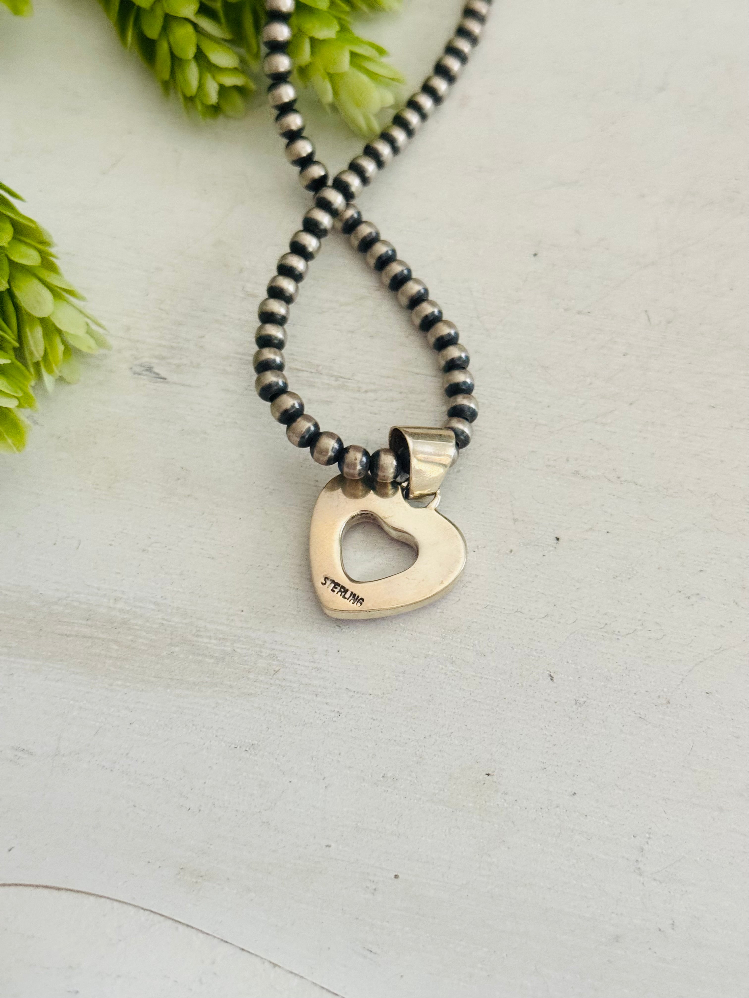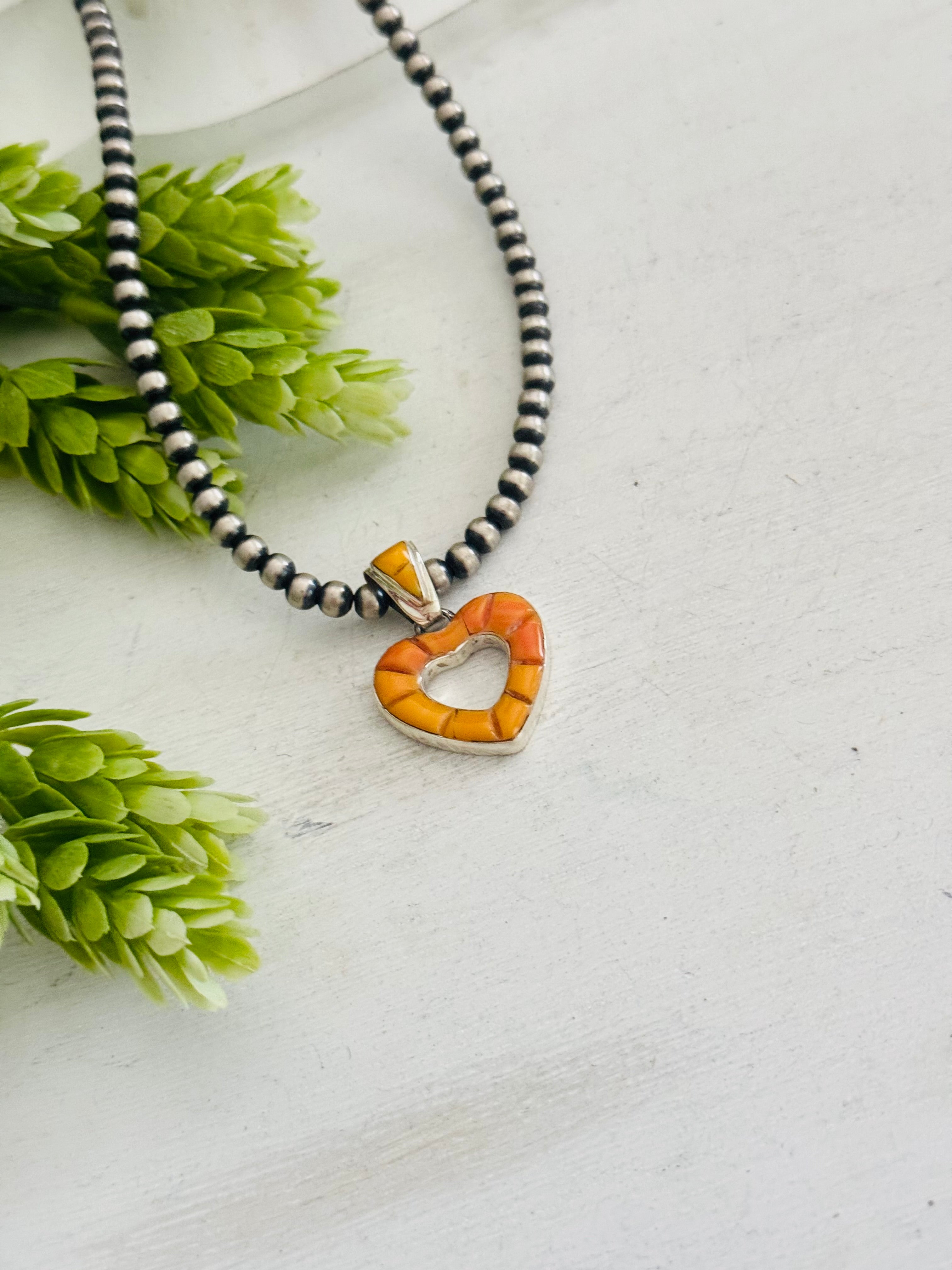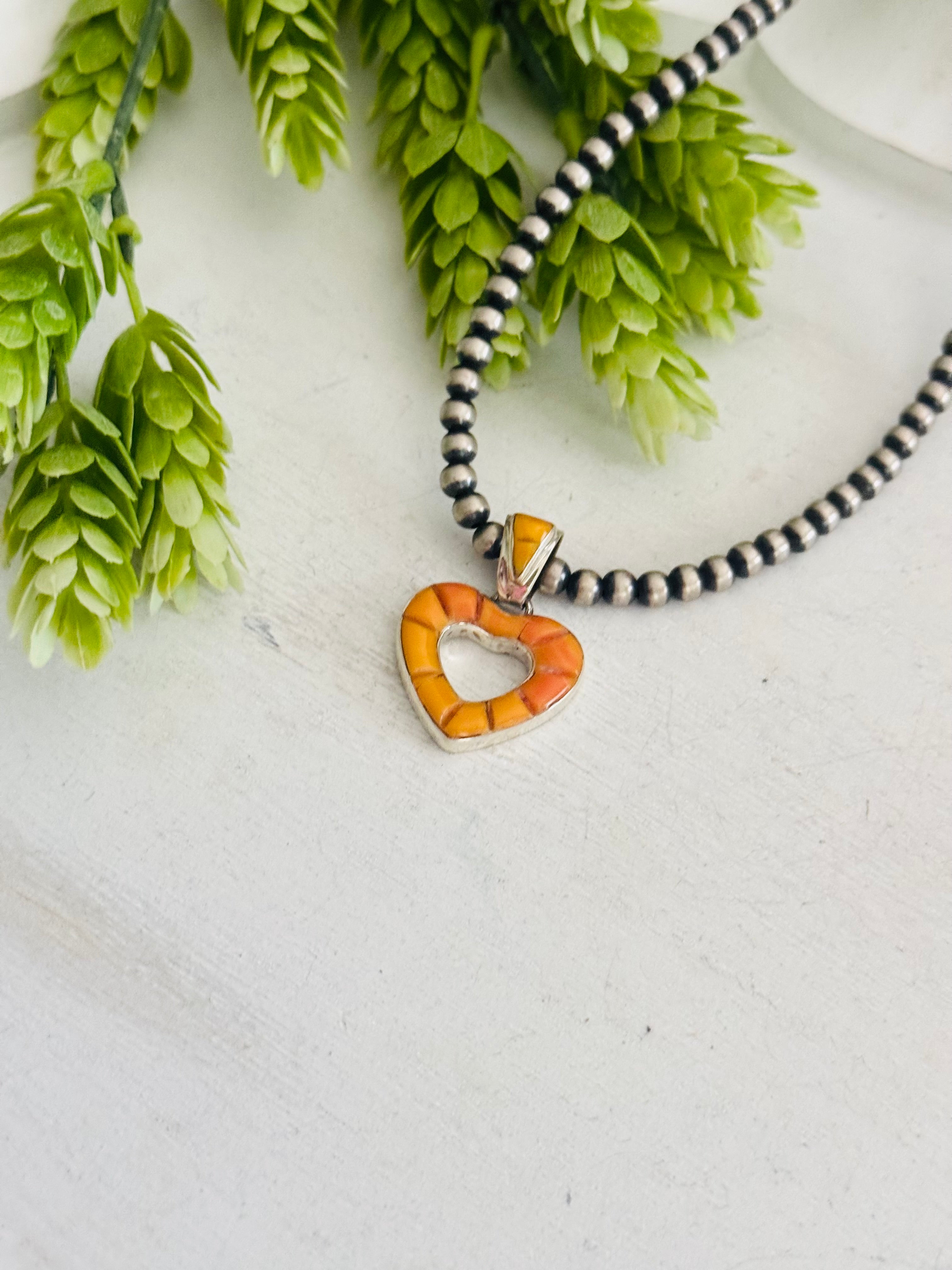 Southwest Spiny Oyster & Sterling Silver Cobblestone Heart Pendant. It measures 1 3/8 inches long and 1 inch wide. Pendant Only.