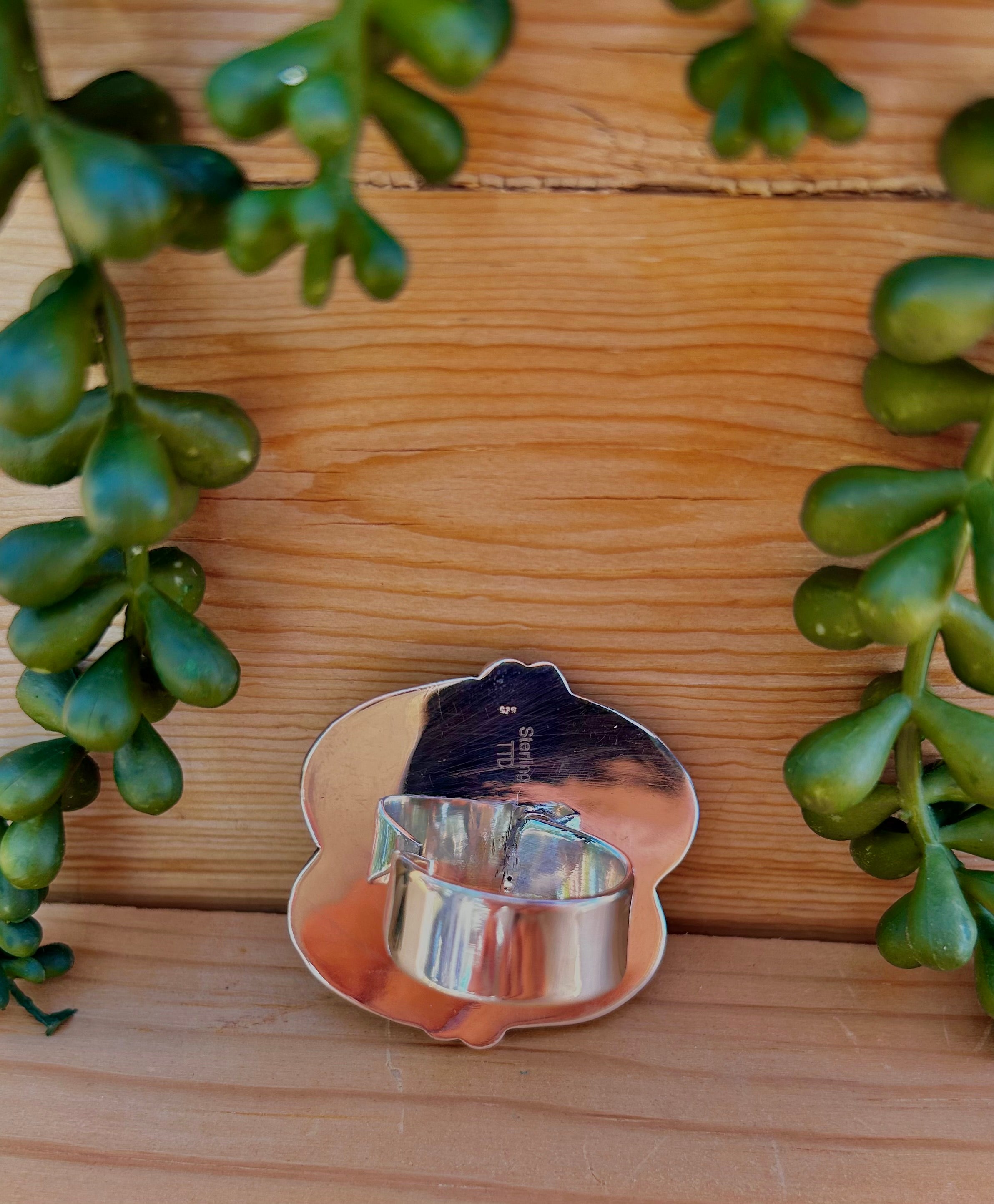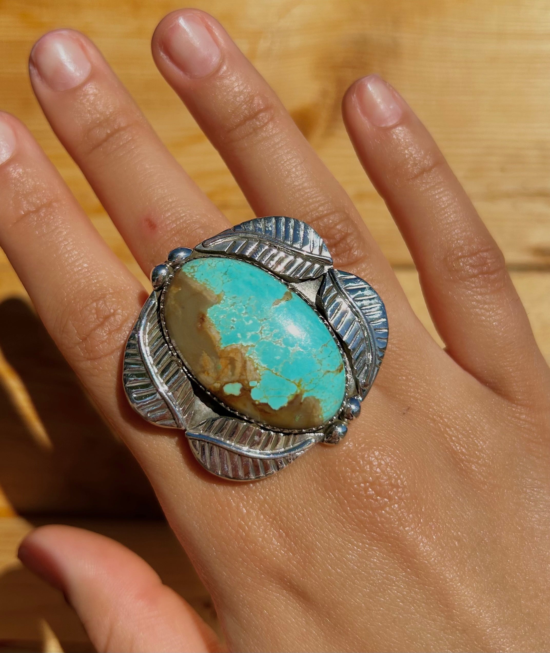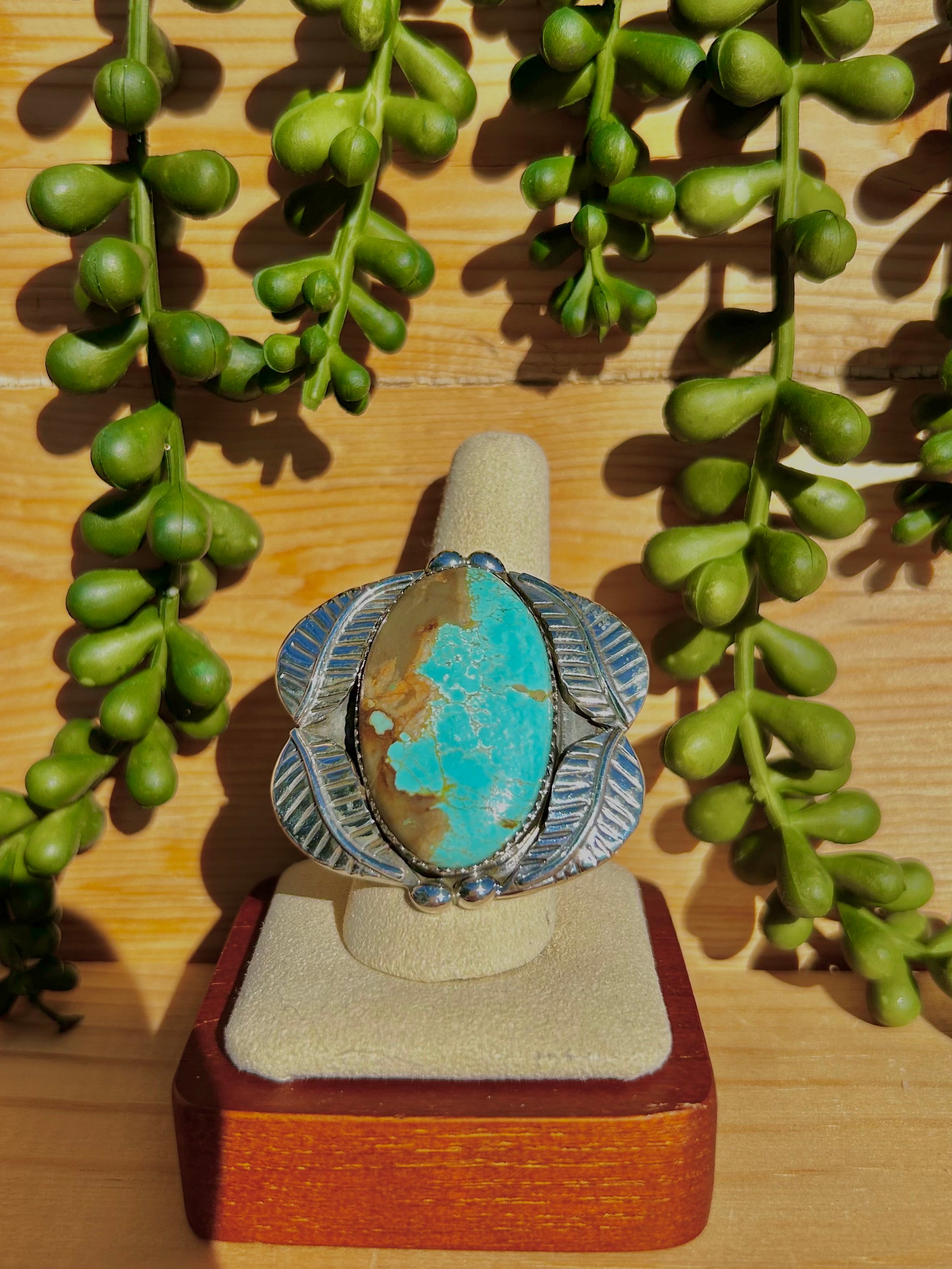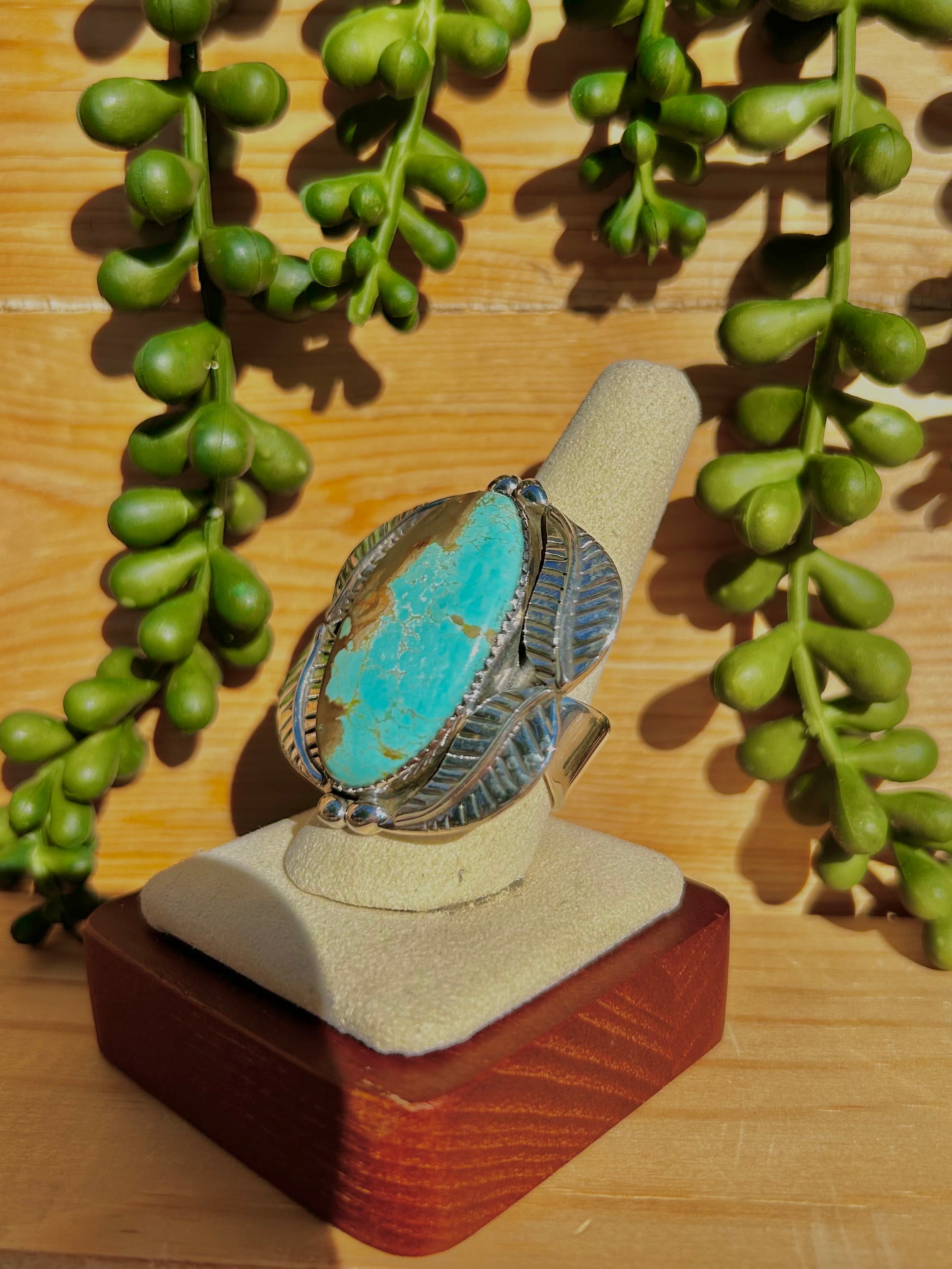 Southwest Number 8 Turquoise & Sterling Silver Ring Size 10.75. It measures 1 7/8 inches long and 1 5/8 inches wide. Signed by the artist and stamped sterling silver.