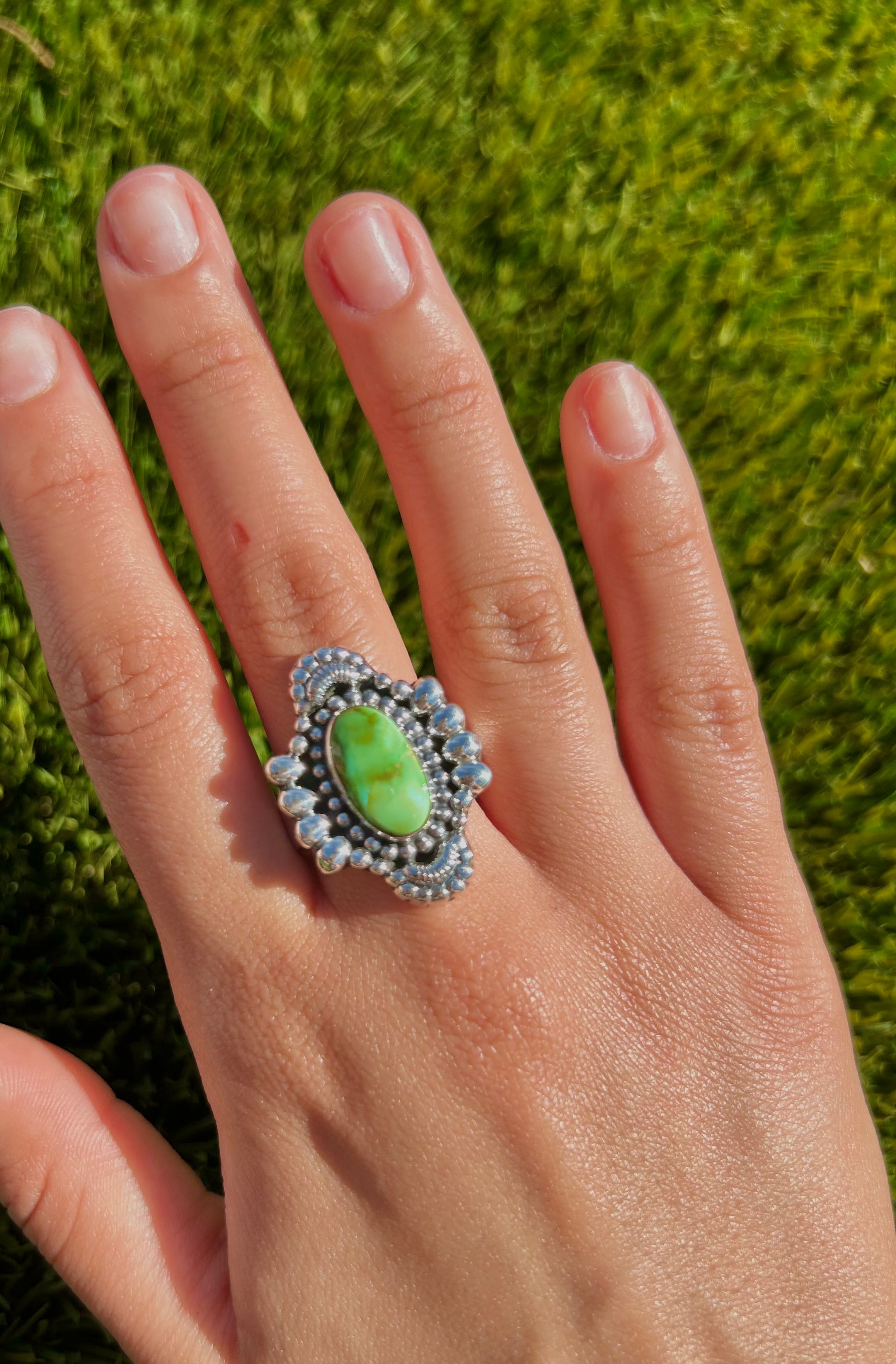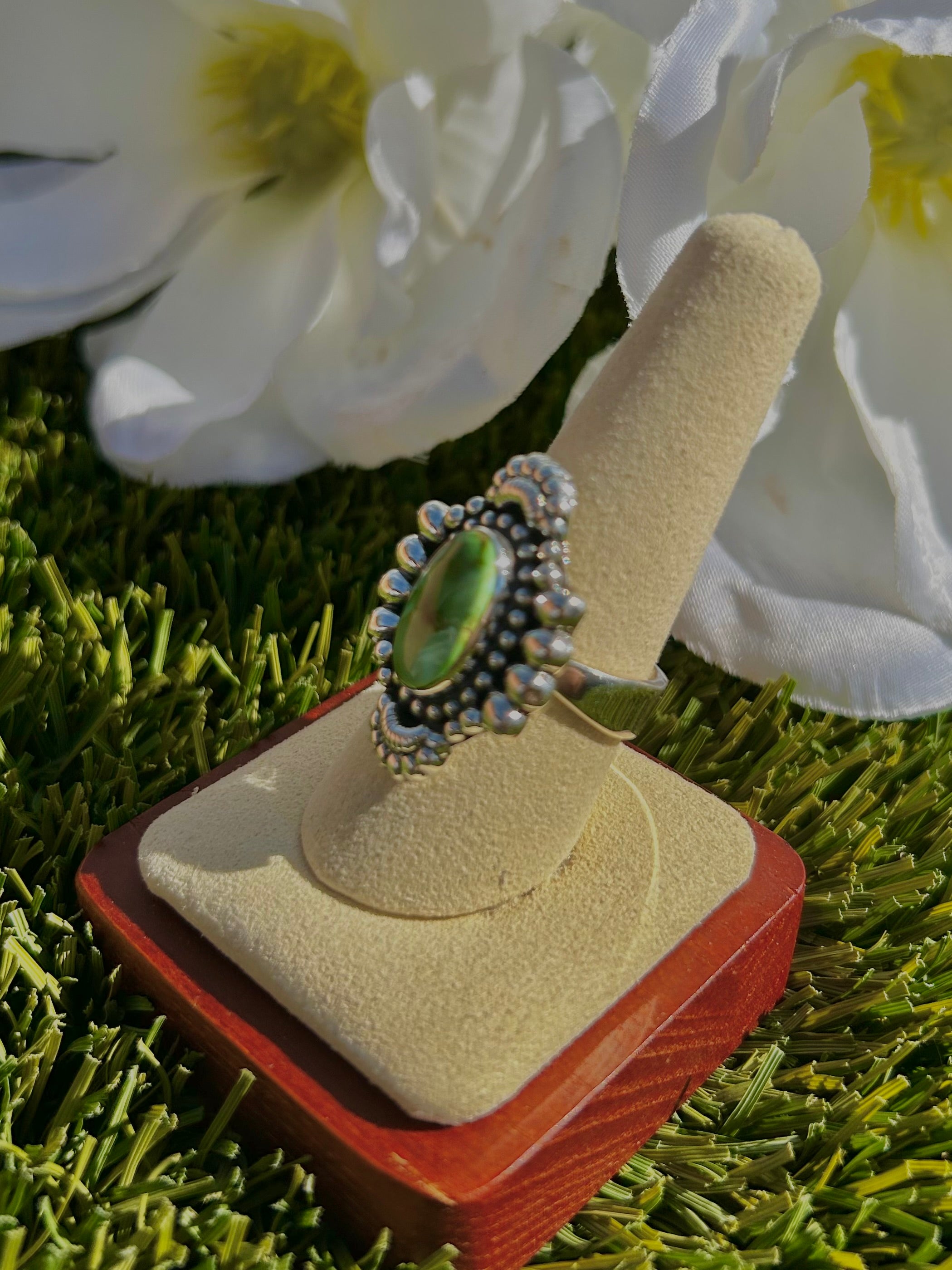 Southwest Sonoran Mountain Turquoise & Sterling Silver Ring Size 8.75. It measures 1 1/4 inches long and 7/8 of an inch wide. Signed by the artist and stamped sterling silver.