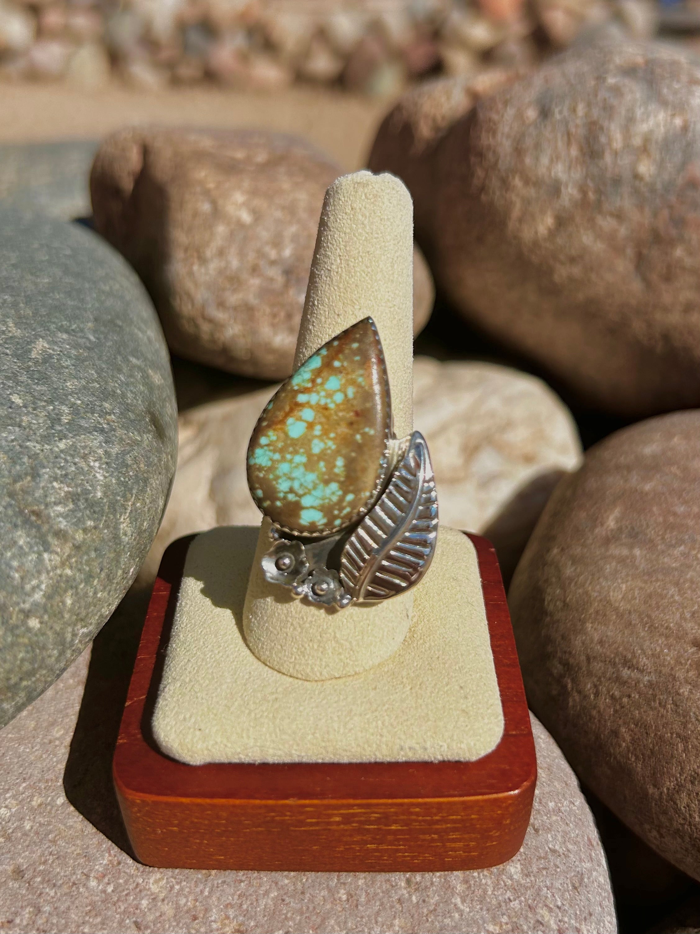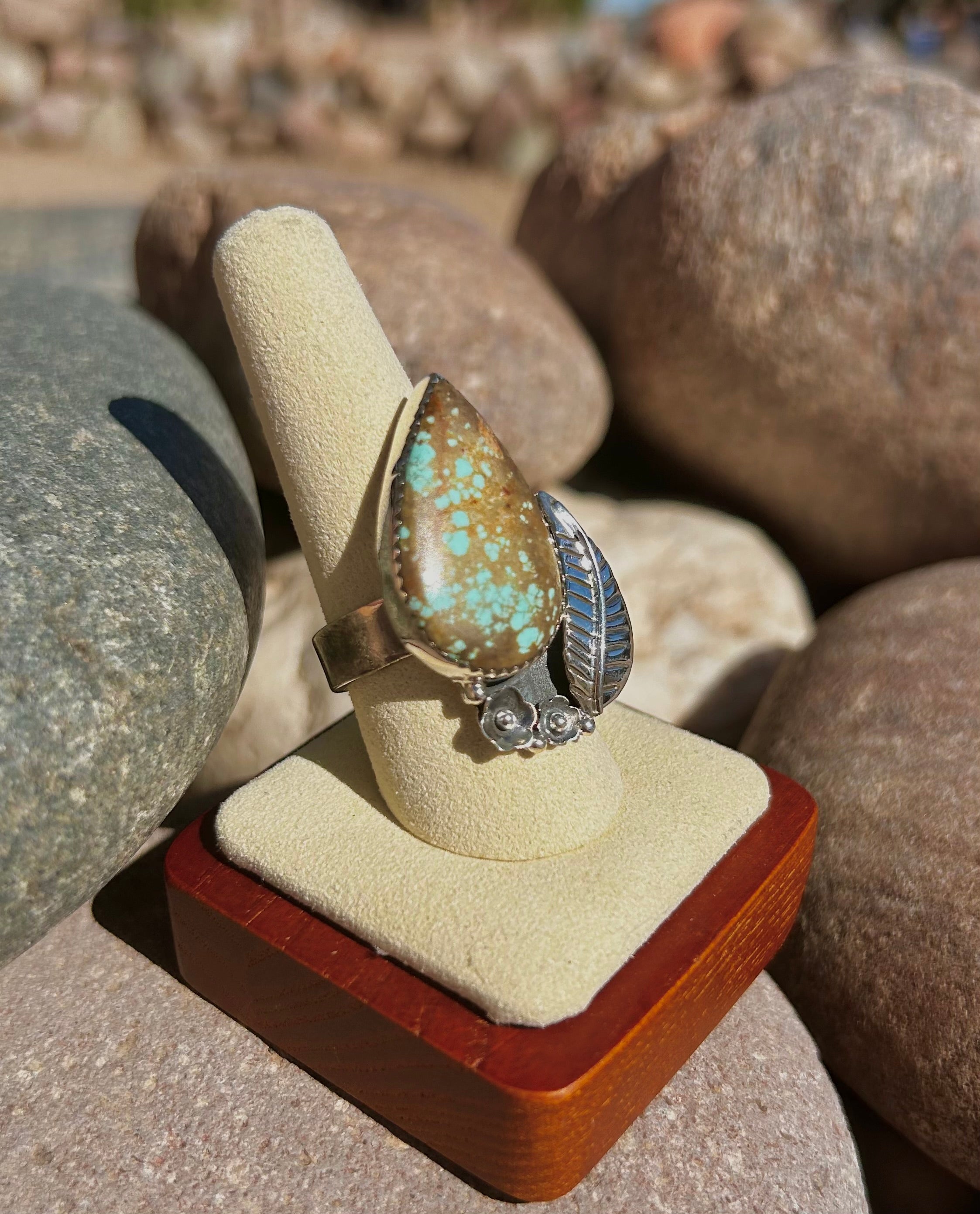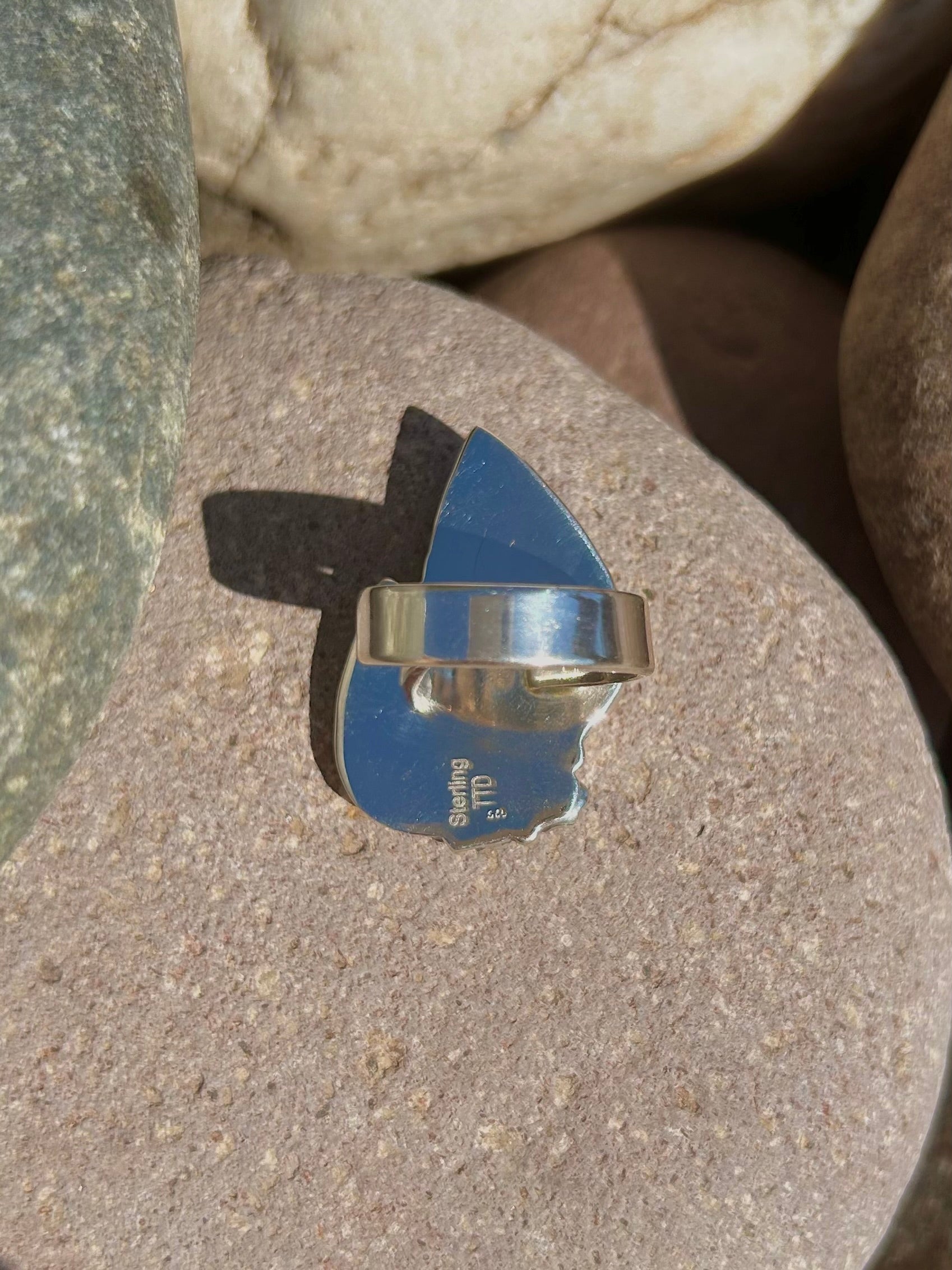 Southwest Number 8 Turquoise & Sterling Silver Ring Size 9. It measures 1 1/2 inches long and 1 inch wide. Signed by the artist and stamped sterling silver.