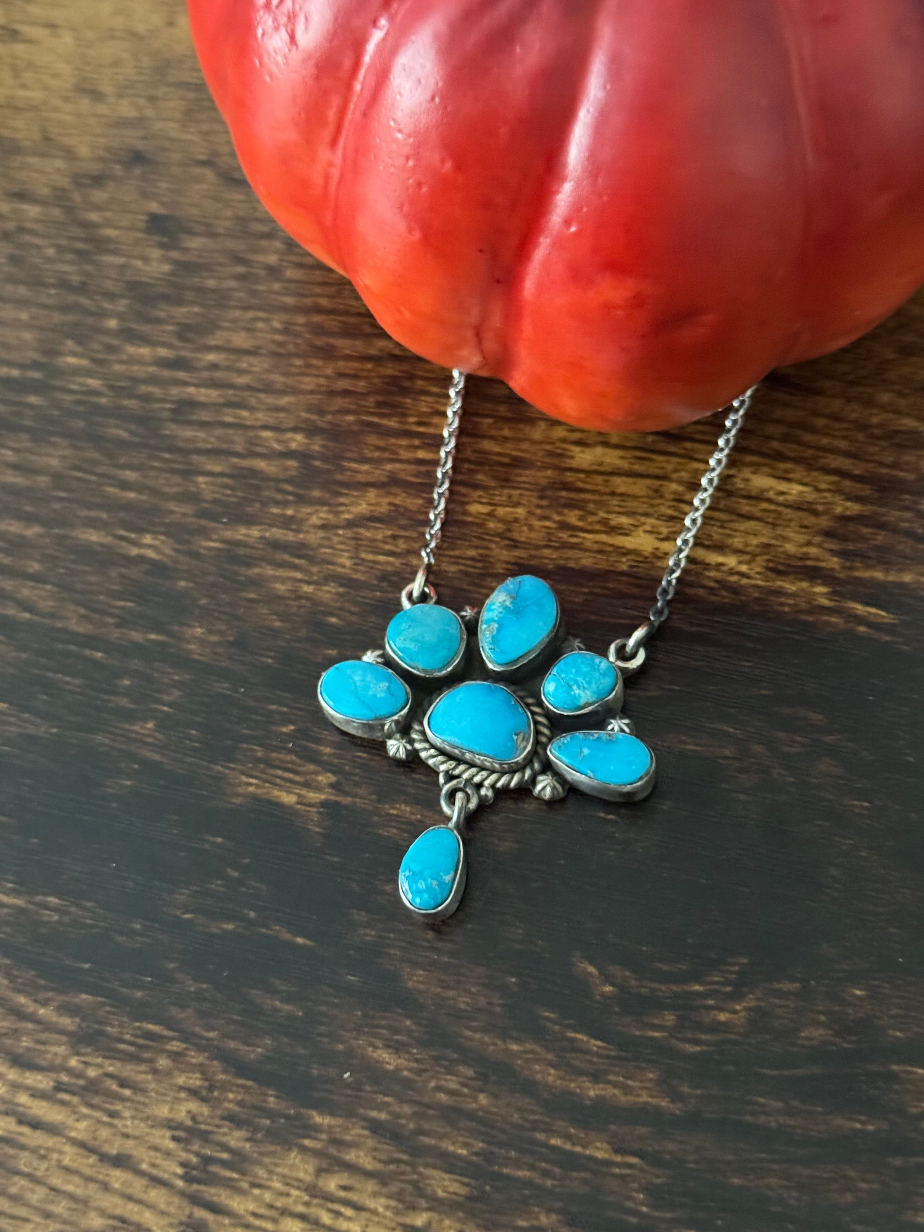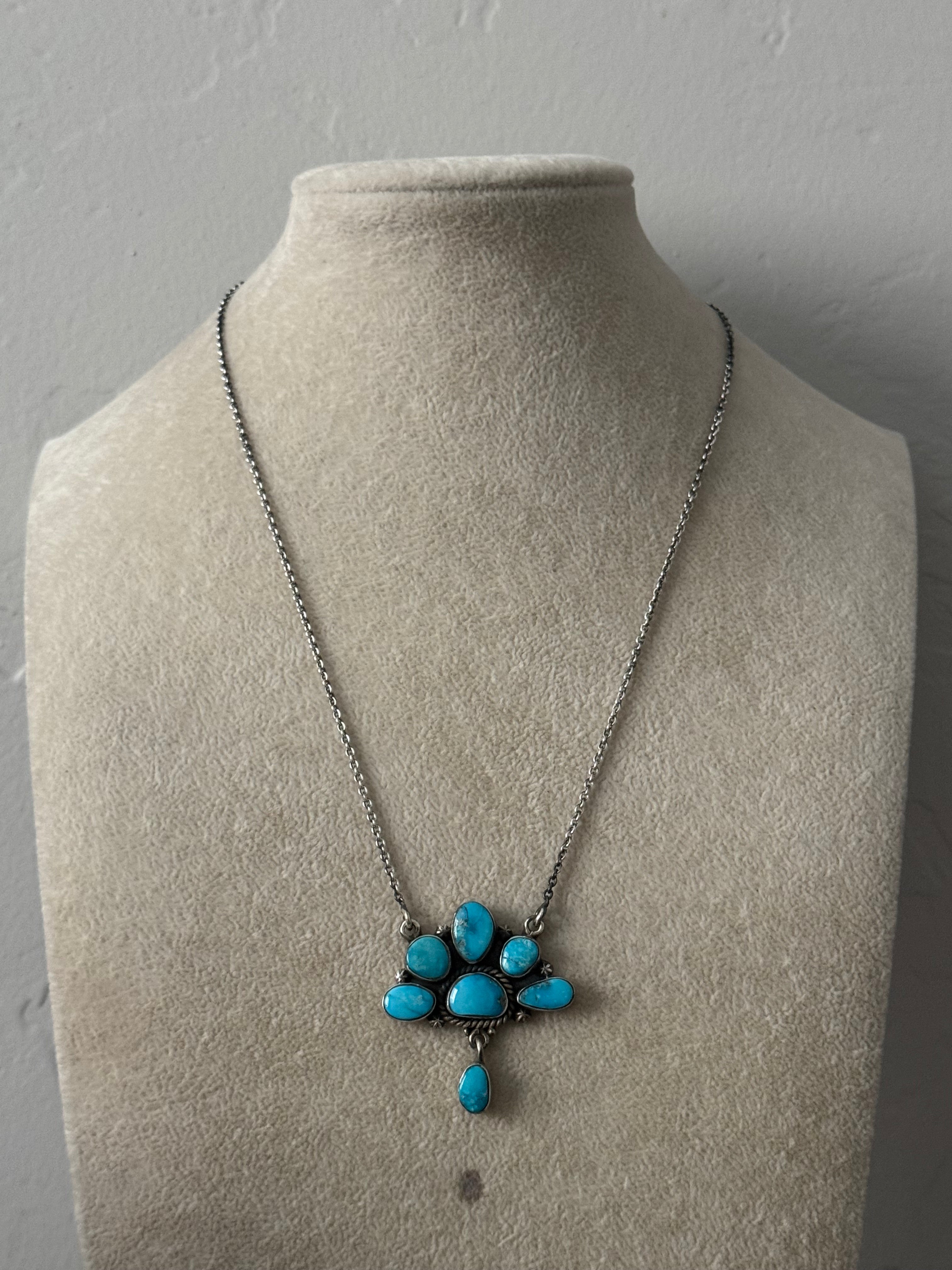 Beautiful Necklace. Southwest Made Valley Blue Turquoise & Sterling Silver Necklace. It measures 21 inches long with hang while the chain measures 18 inches long. Signed by the artist and stamped sterling silver. Stones will differ due to natural stones.
