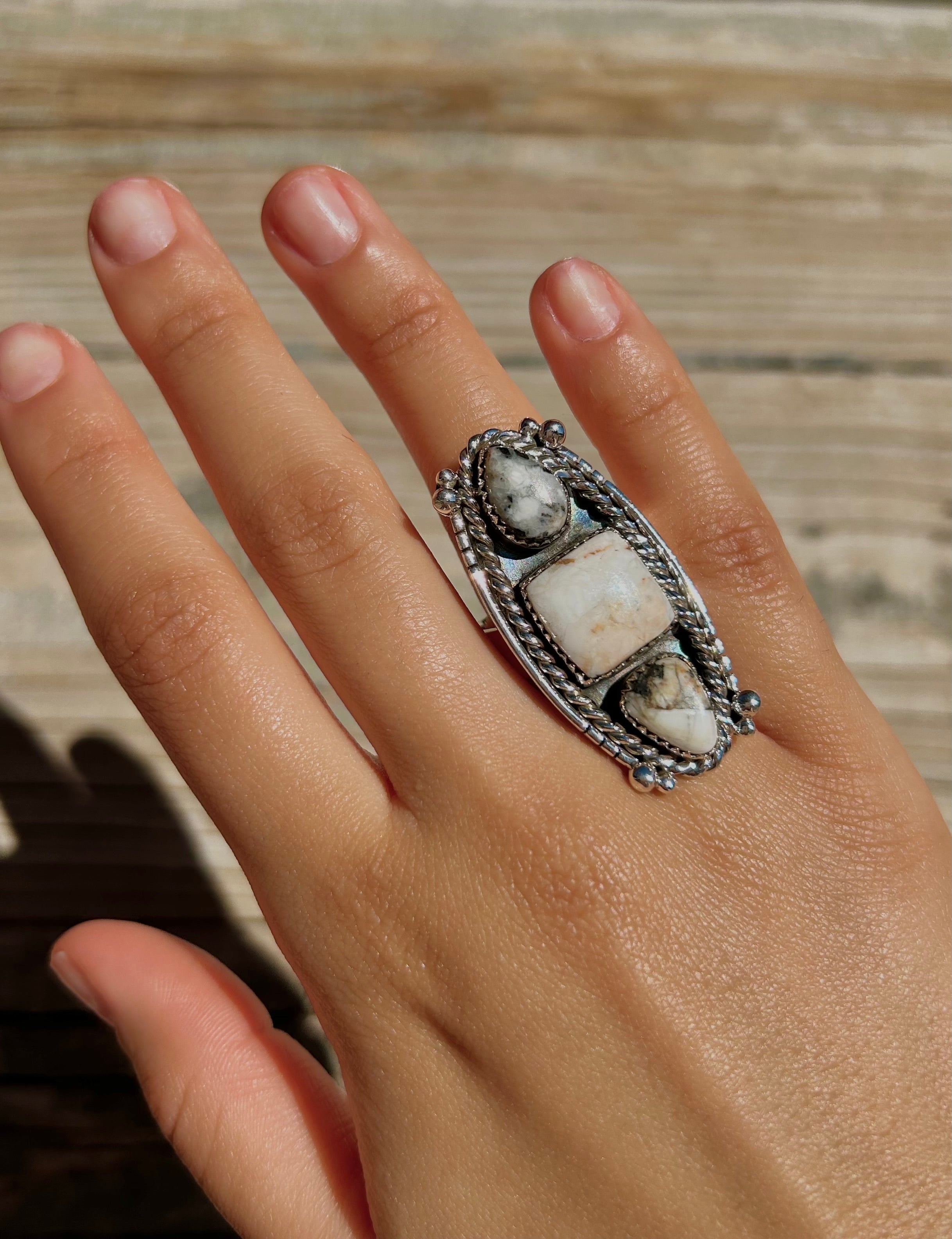 Southwest Sonoran White Buffalo & Sterling Silver Ring Size 9.75 It measures 1 5/8 inches long and a little over 7/8 of an inch wide. Signed by the artist and stamped sterling silver.