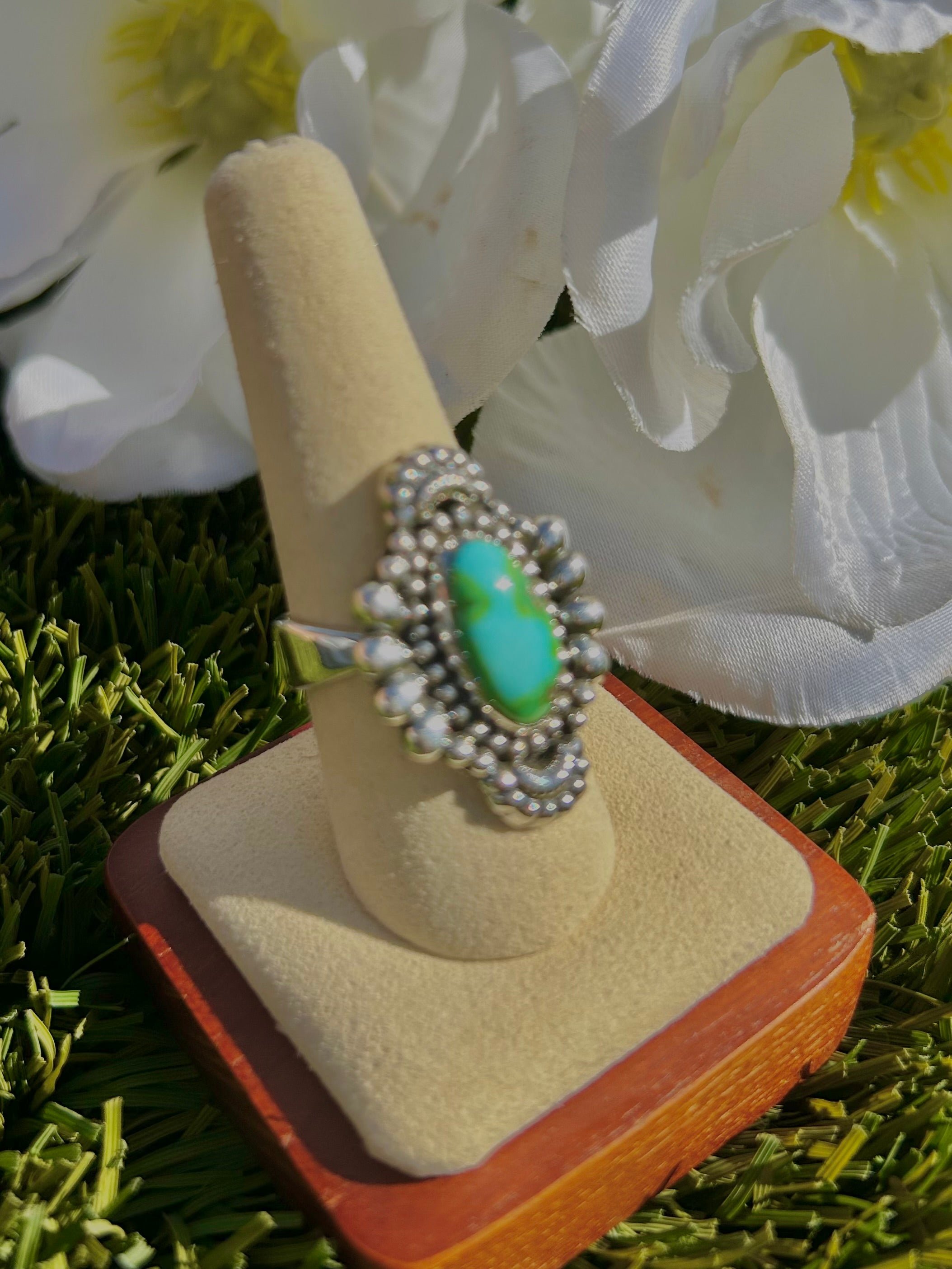 Southwest Sonoran Mountain Turquoise & Sterling Silver Ring Size 9. It measures 1 1/4 inches long and 1 inch wide. Signed by the artist and stamped sterling silver.