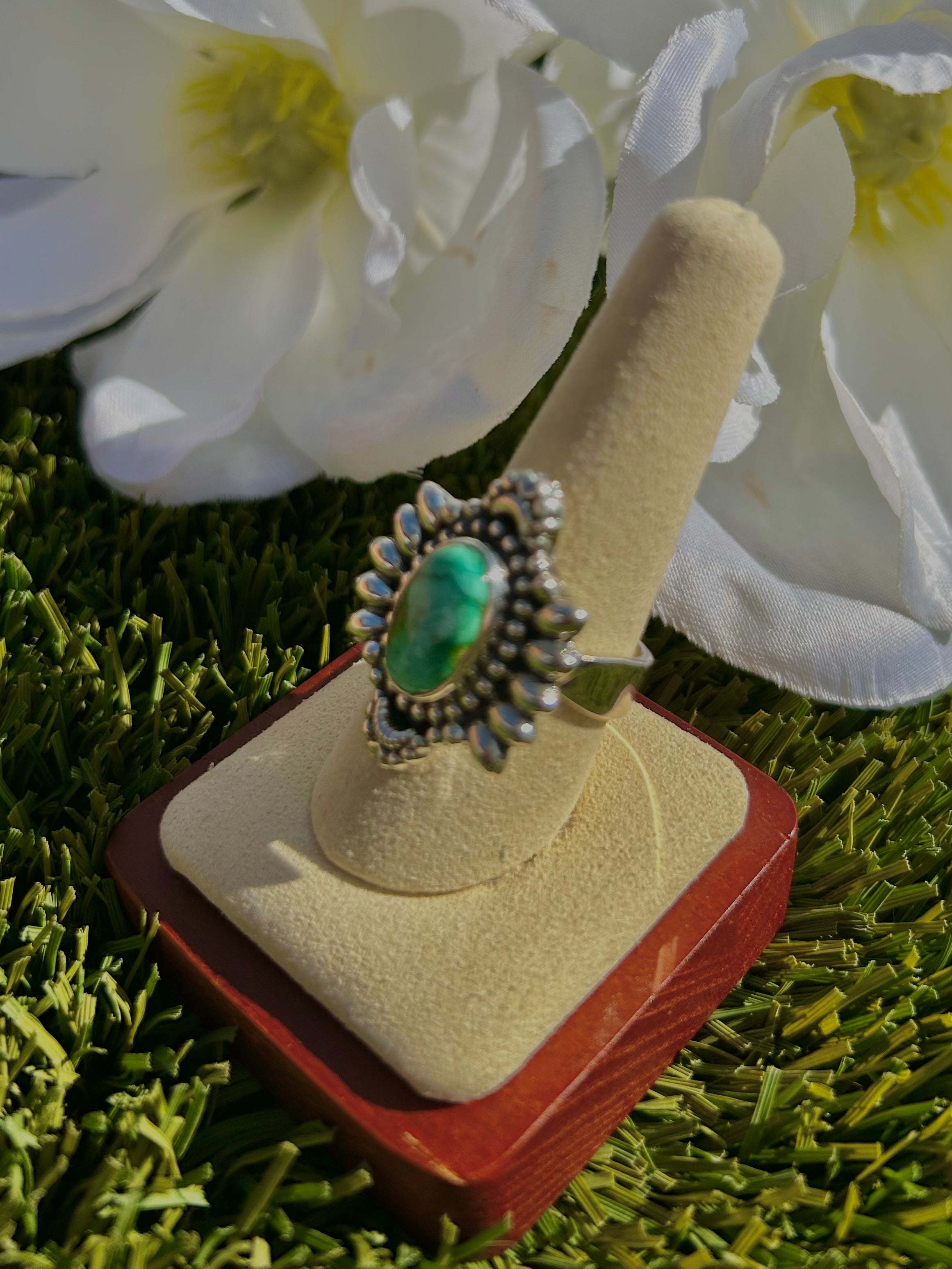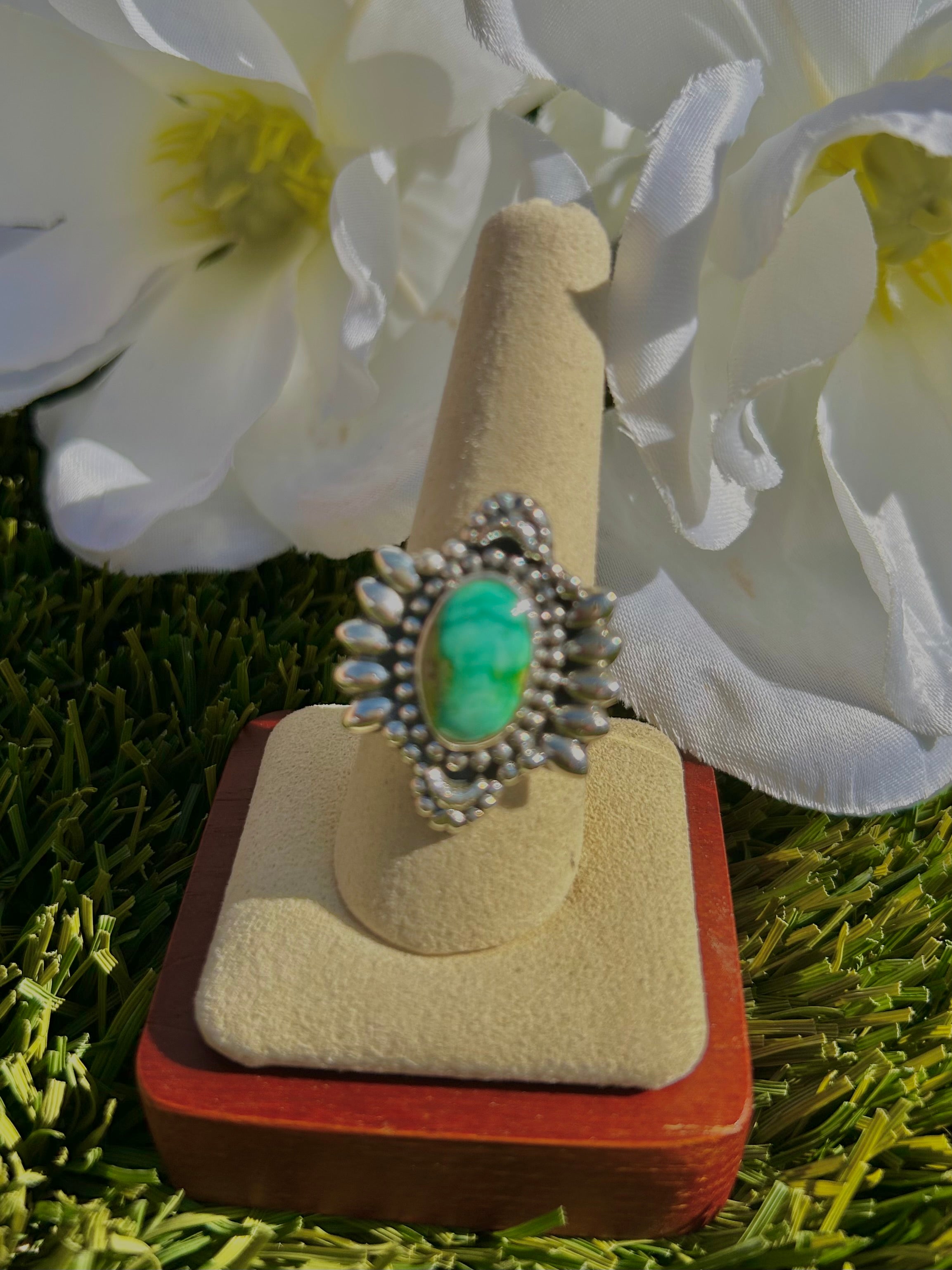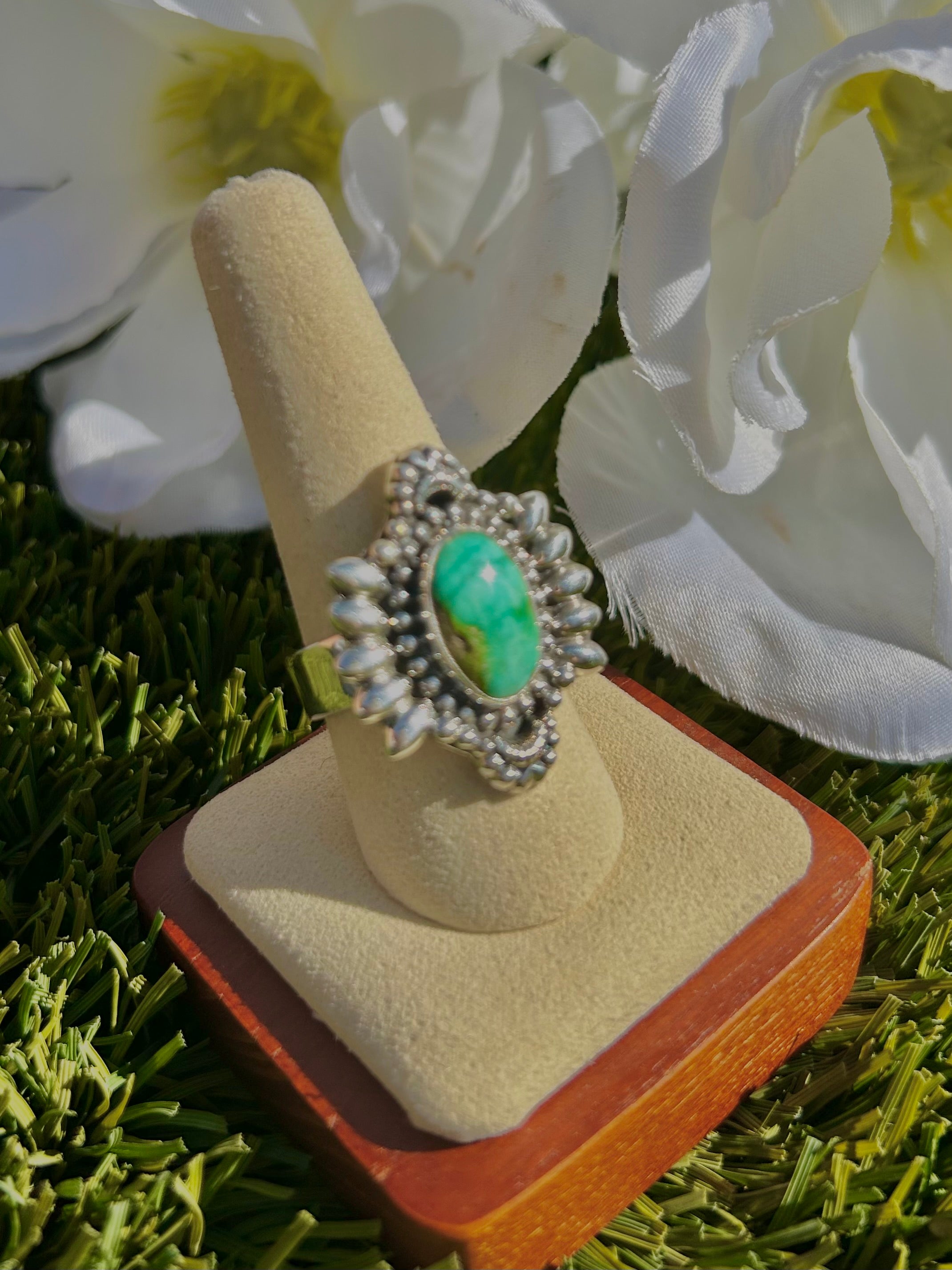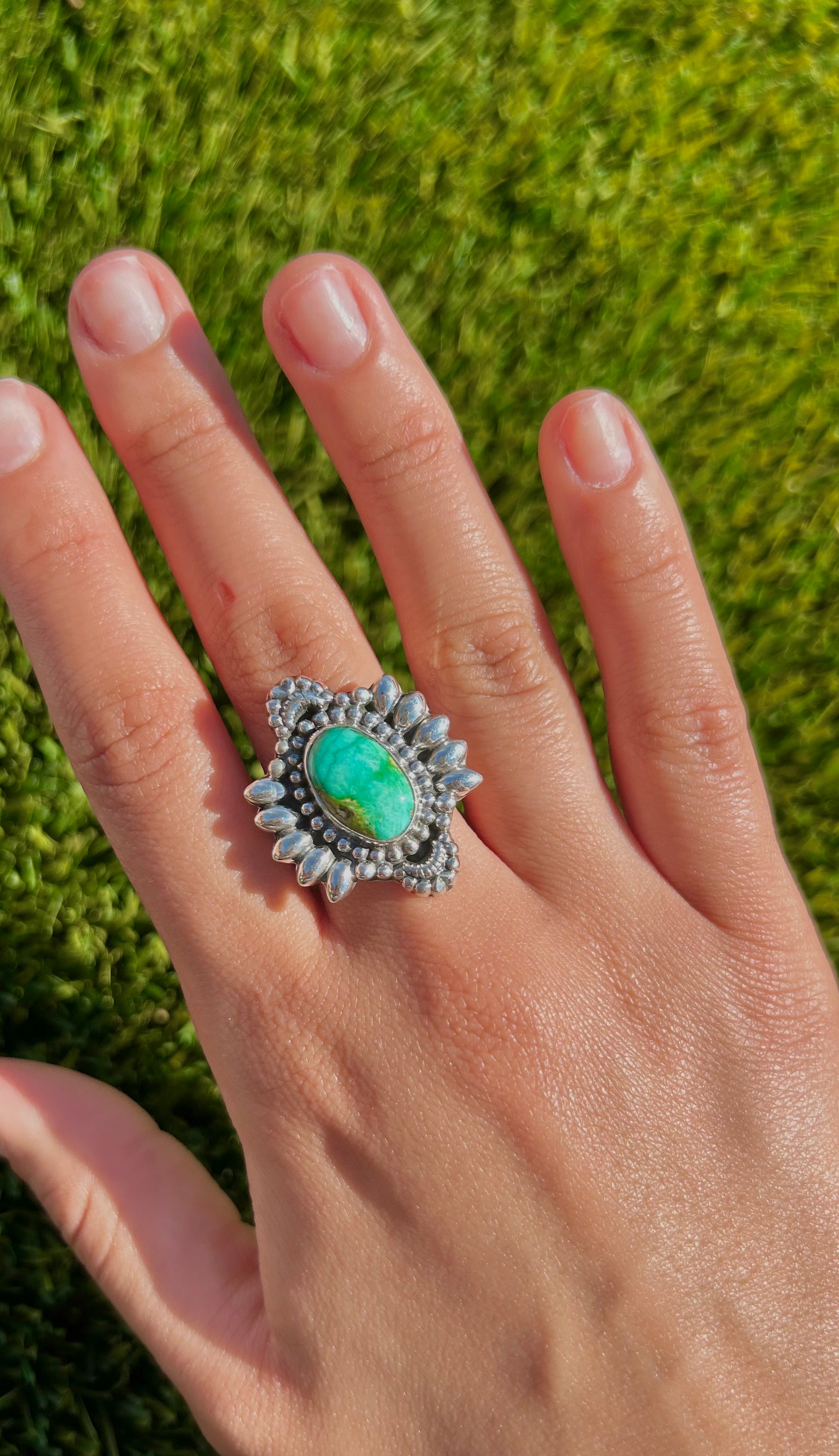 Southwest Sonoran Mountain Turquoise & Sterling Silver Ring Size 9. It measures 1 1/8 inches long and 1 inch wide. Signed by the artist and stamped sterling silver.