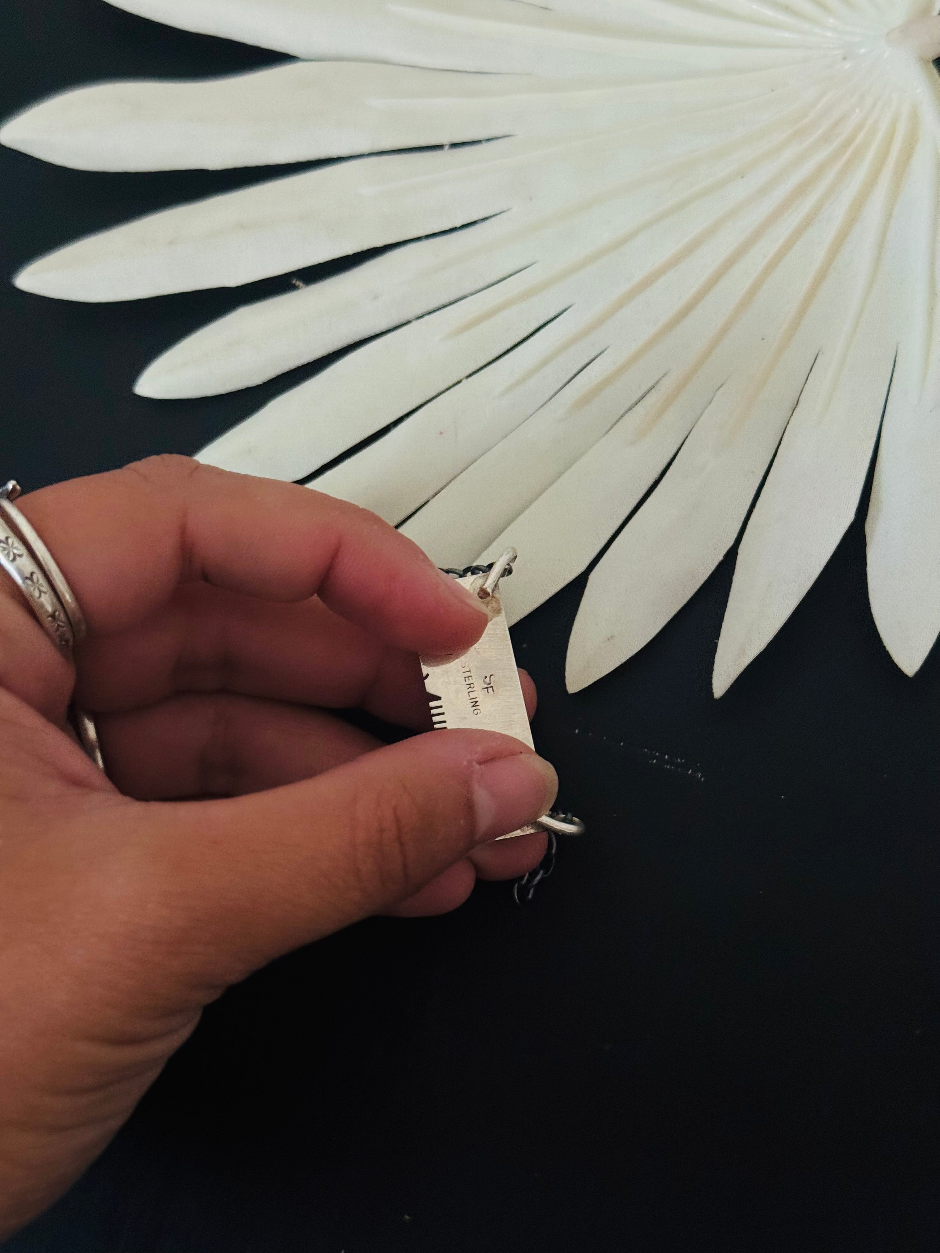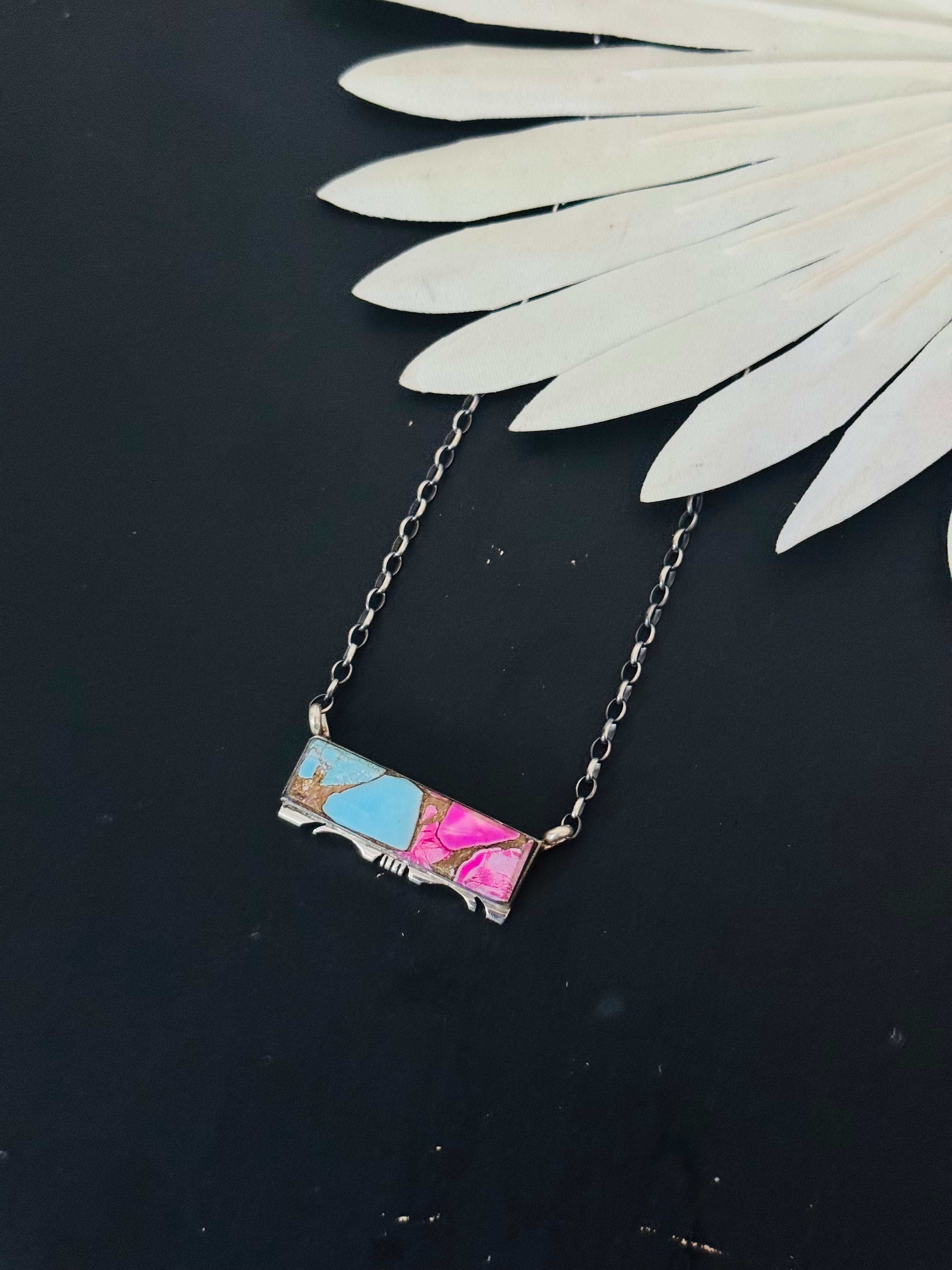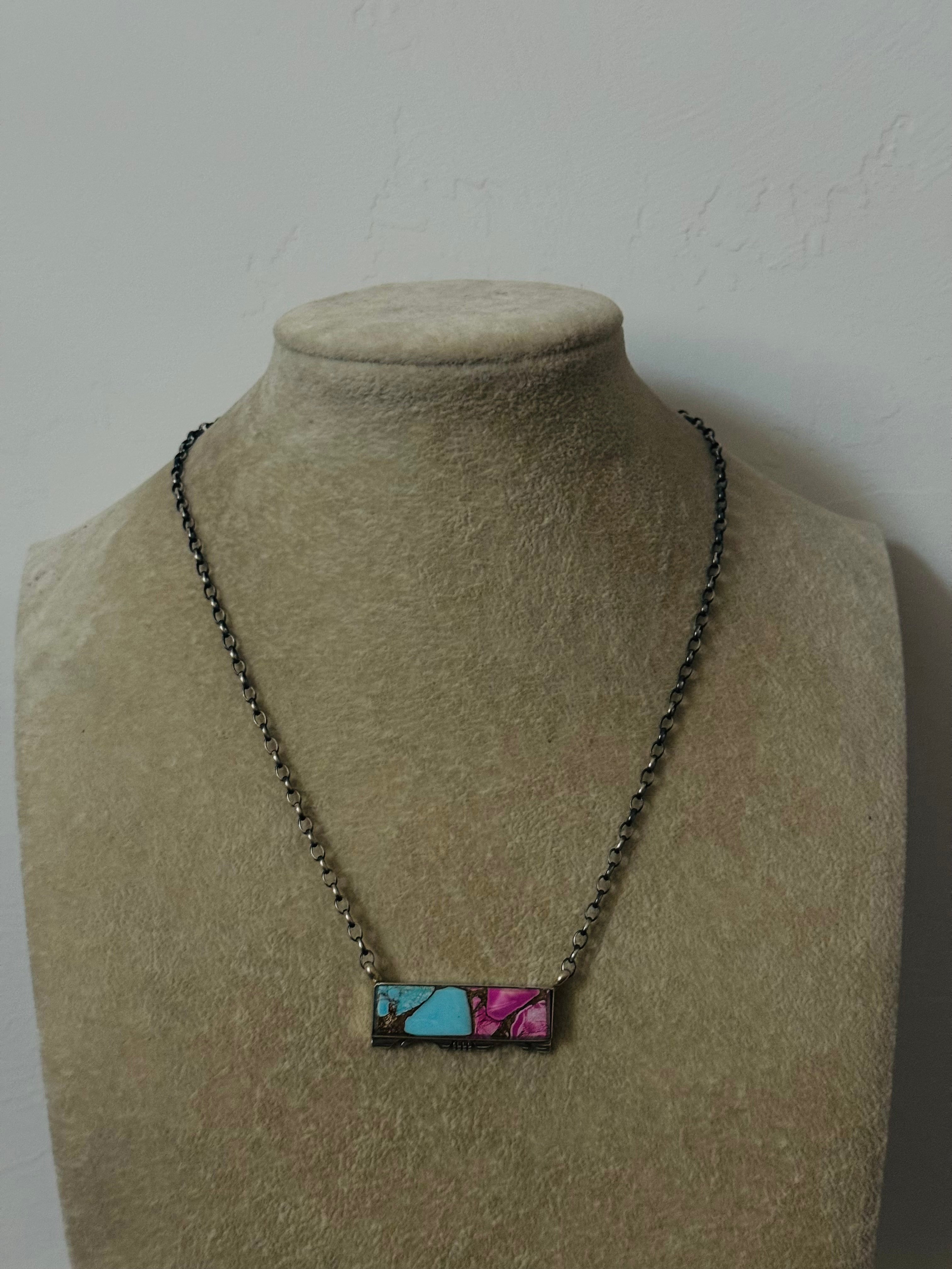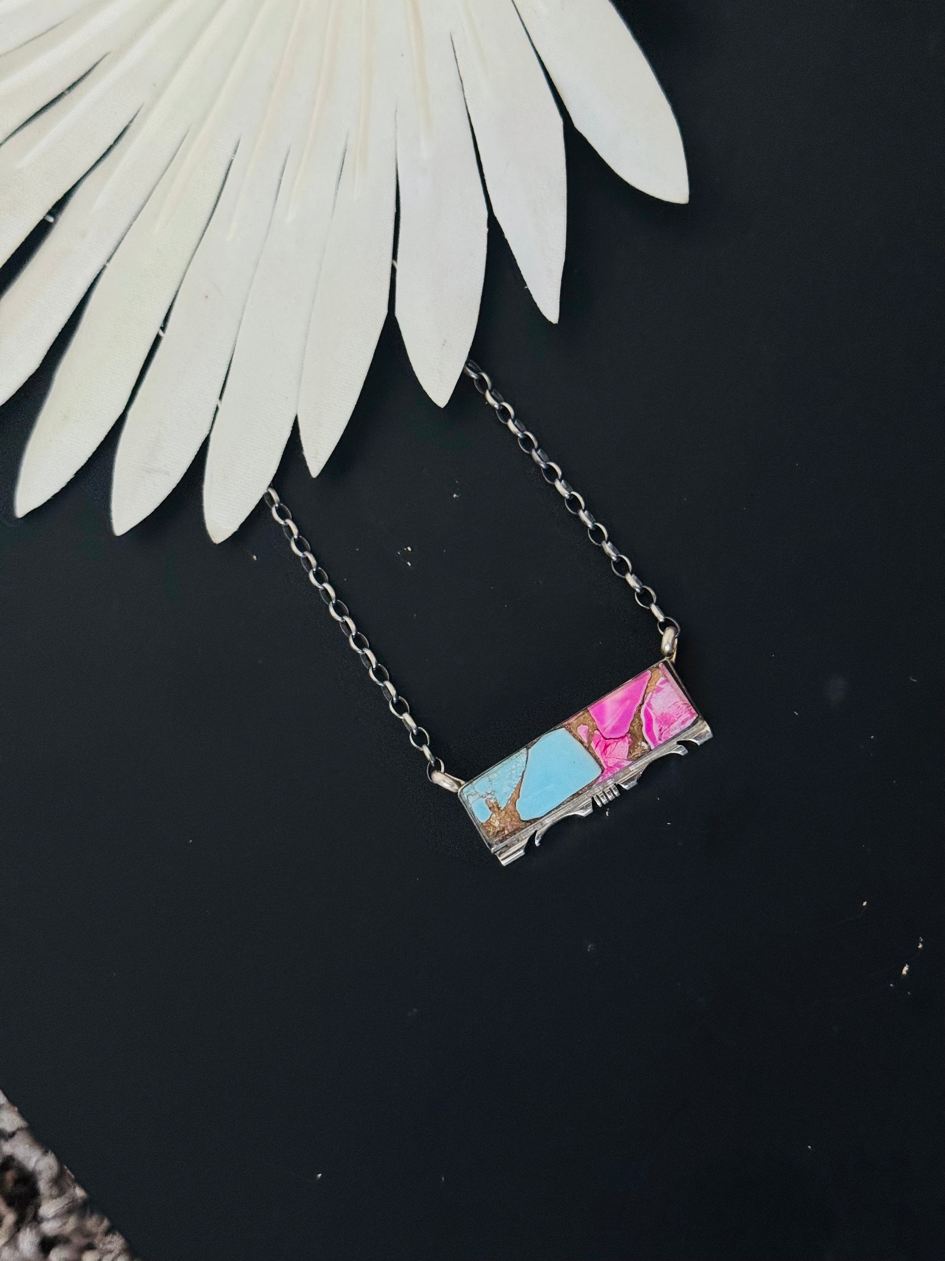 Steve Francisco Cotton Candy Dahlia Composite & Sterling Silver Bar Necklace. The chain by itself measures 16 inches long. Signed by the artist and stamped sterling silver.
