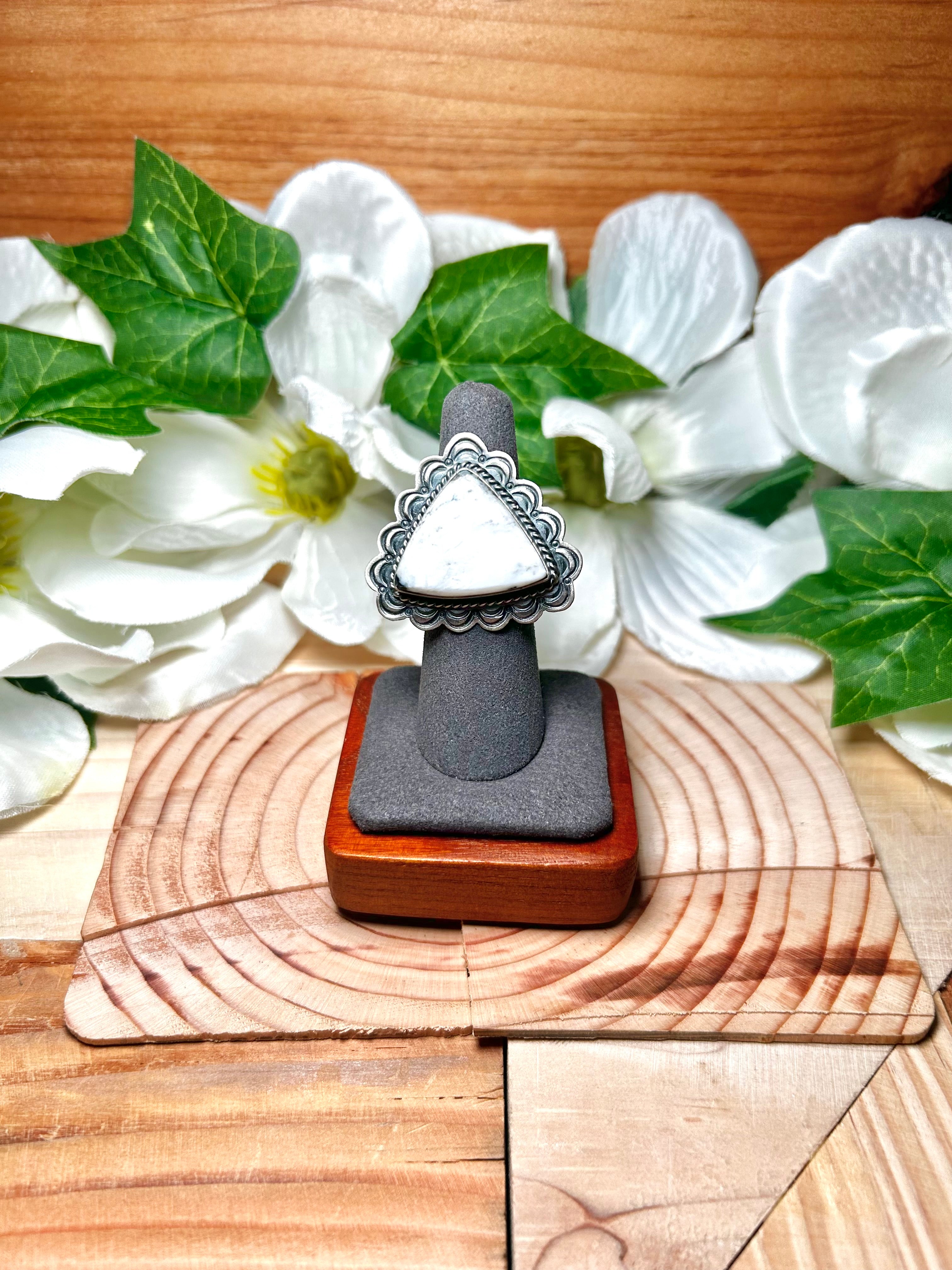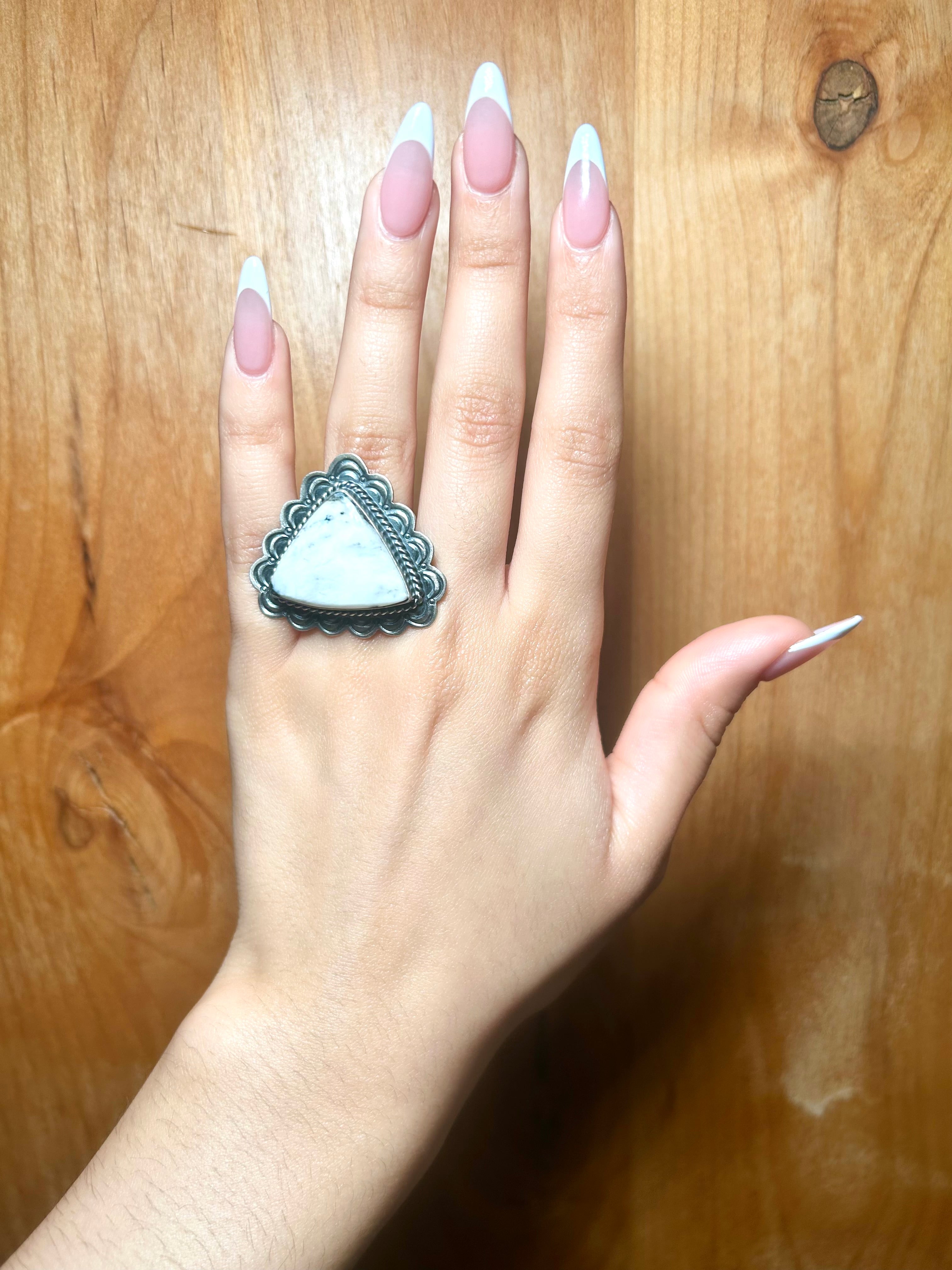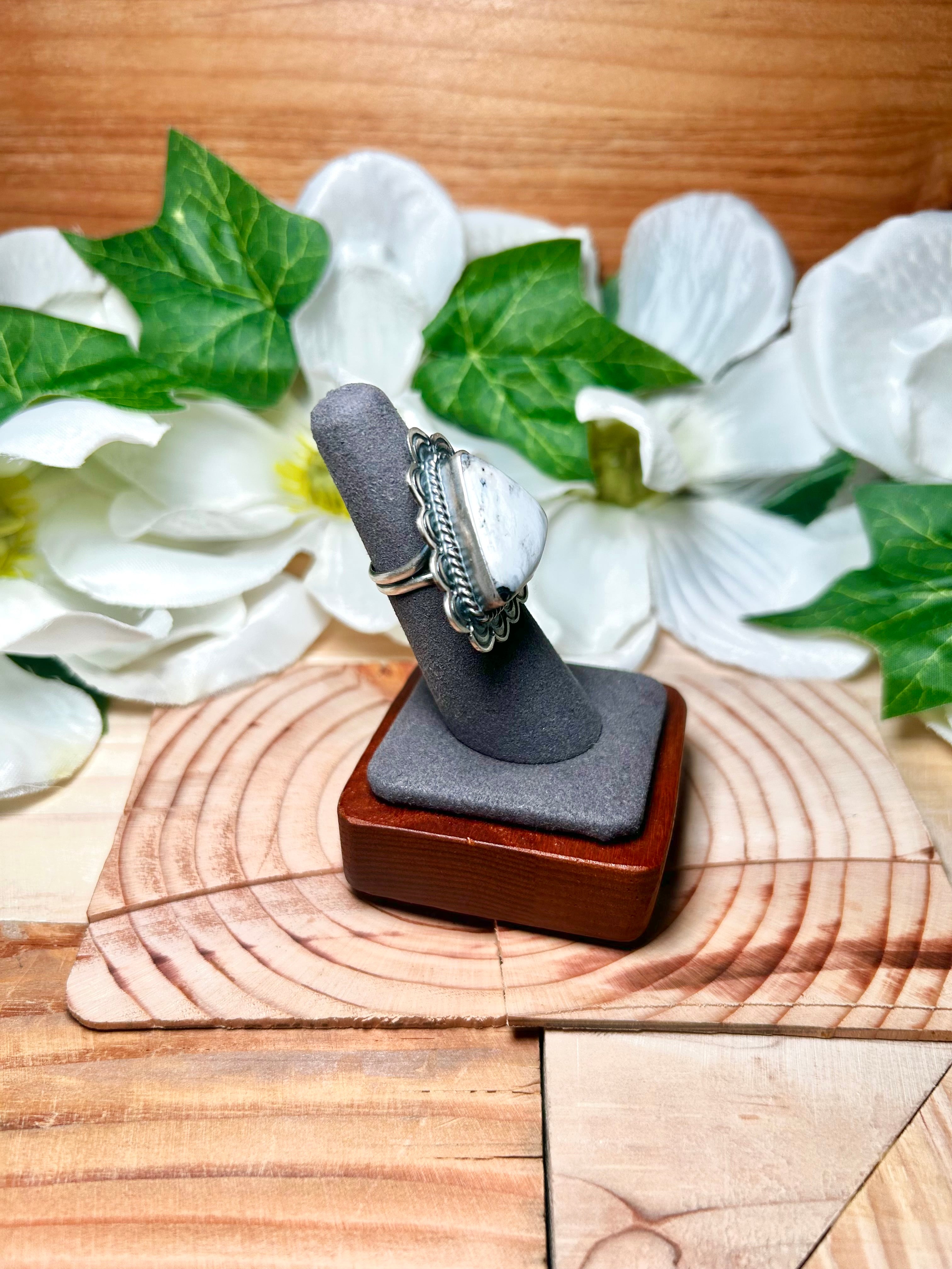Dave Skeets White Buffalo & Sterling Silver Ring Size 5.75. It measures 1 1/4 inches long and 1 3/8 inches wide. Signed by the artist and stamped sterling silver.