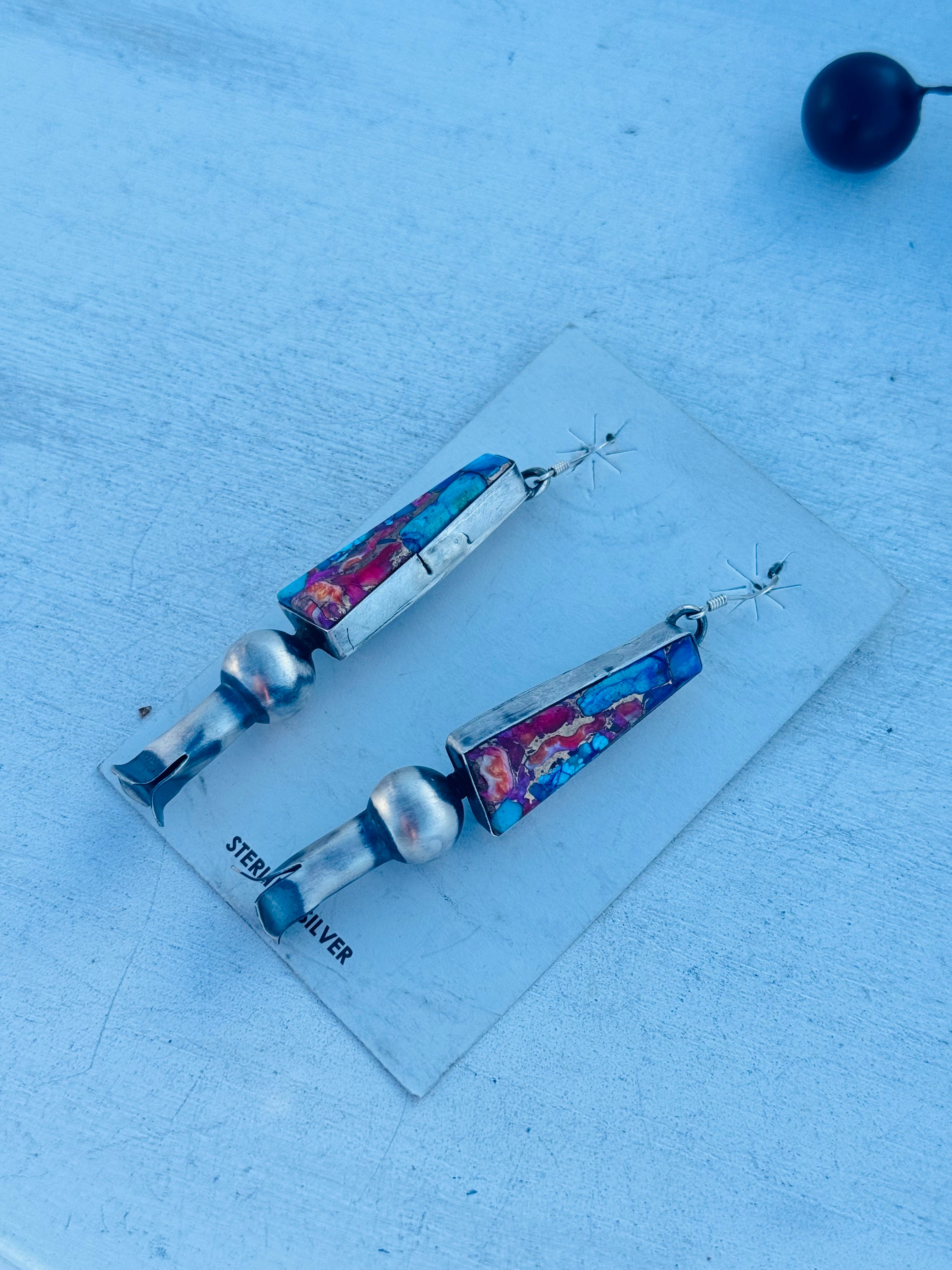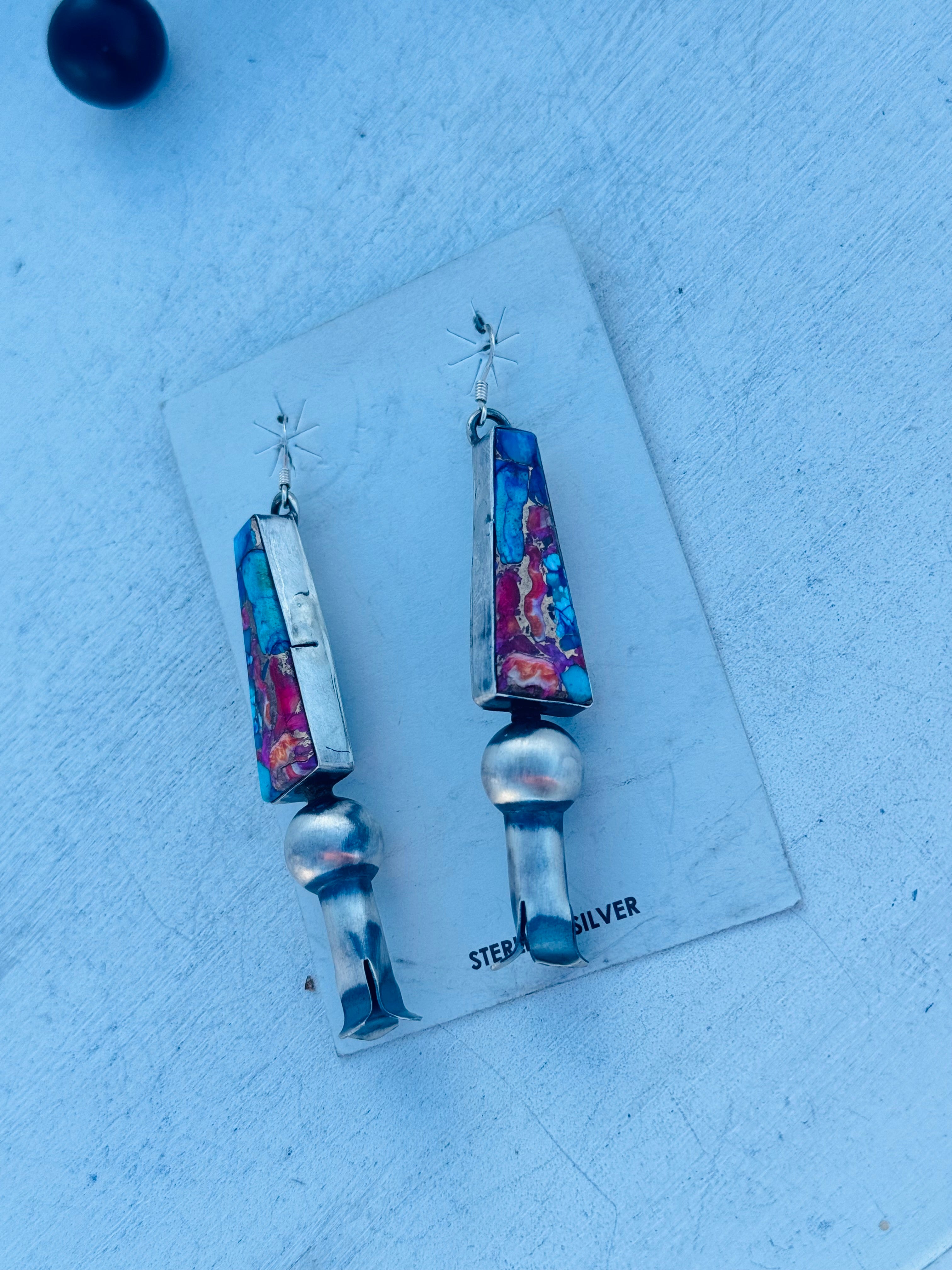 Tia Long Mohave Turquoise & Sterling Silver Dangle Blossom Earrings. It measures 3 1/8 inches long and 5/8 of an inch wide. Signed by artist and stamped sterling silver.
