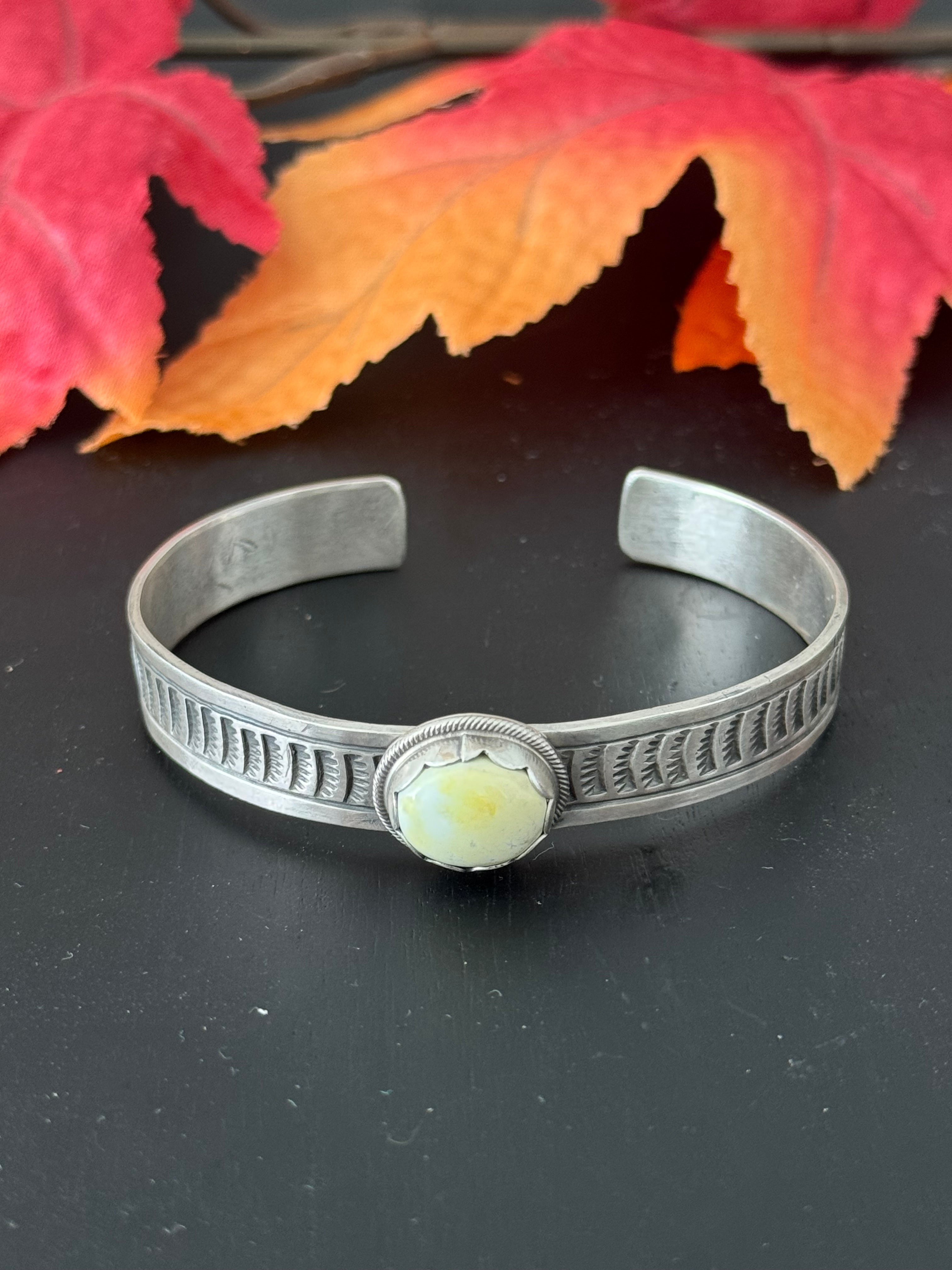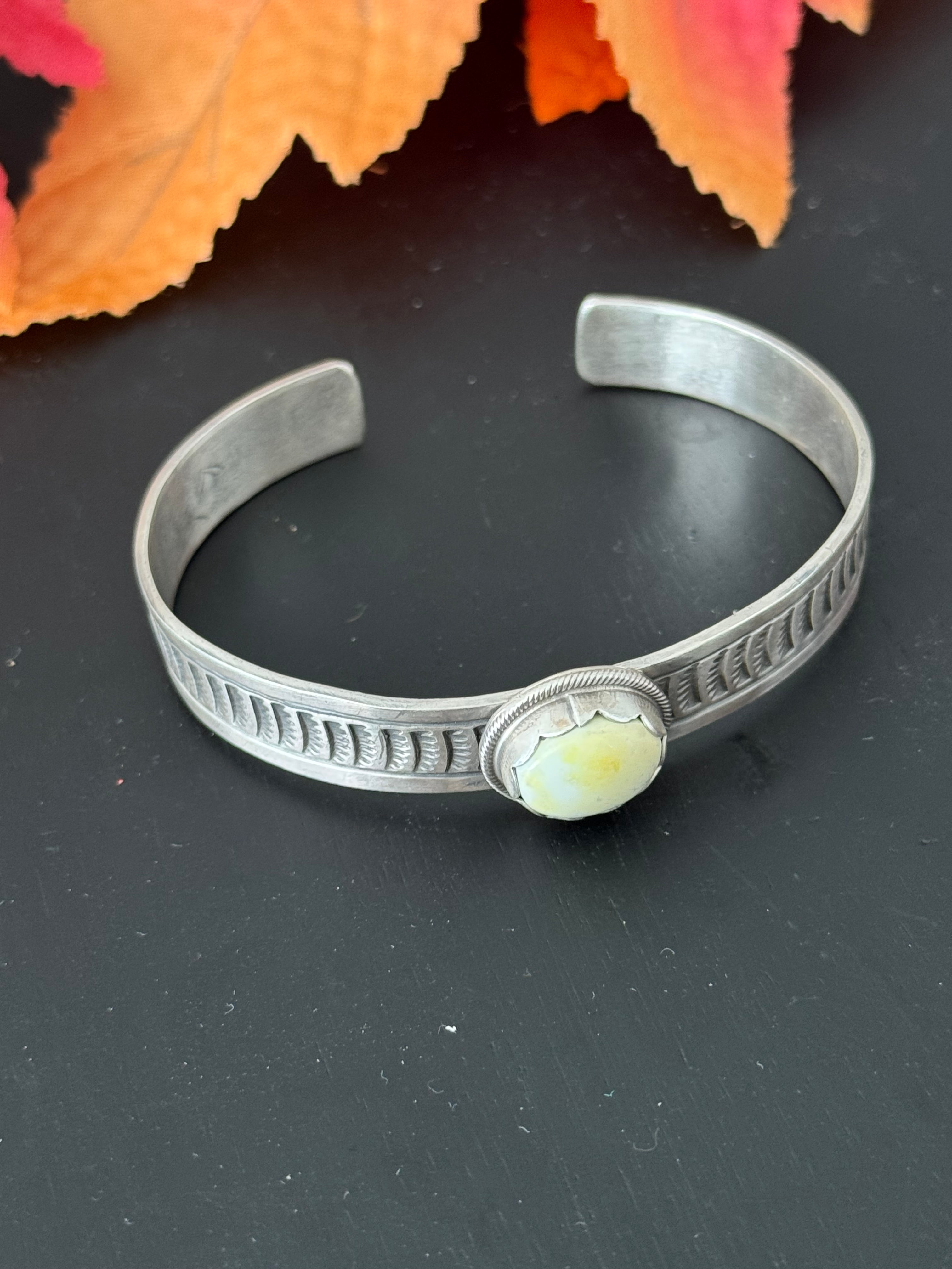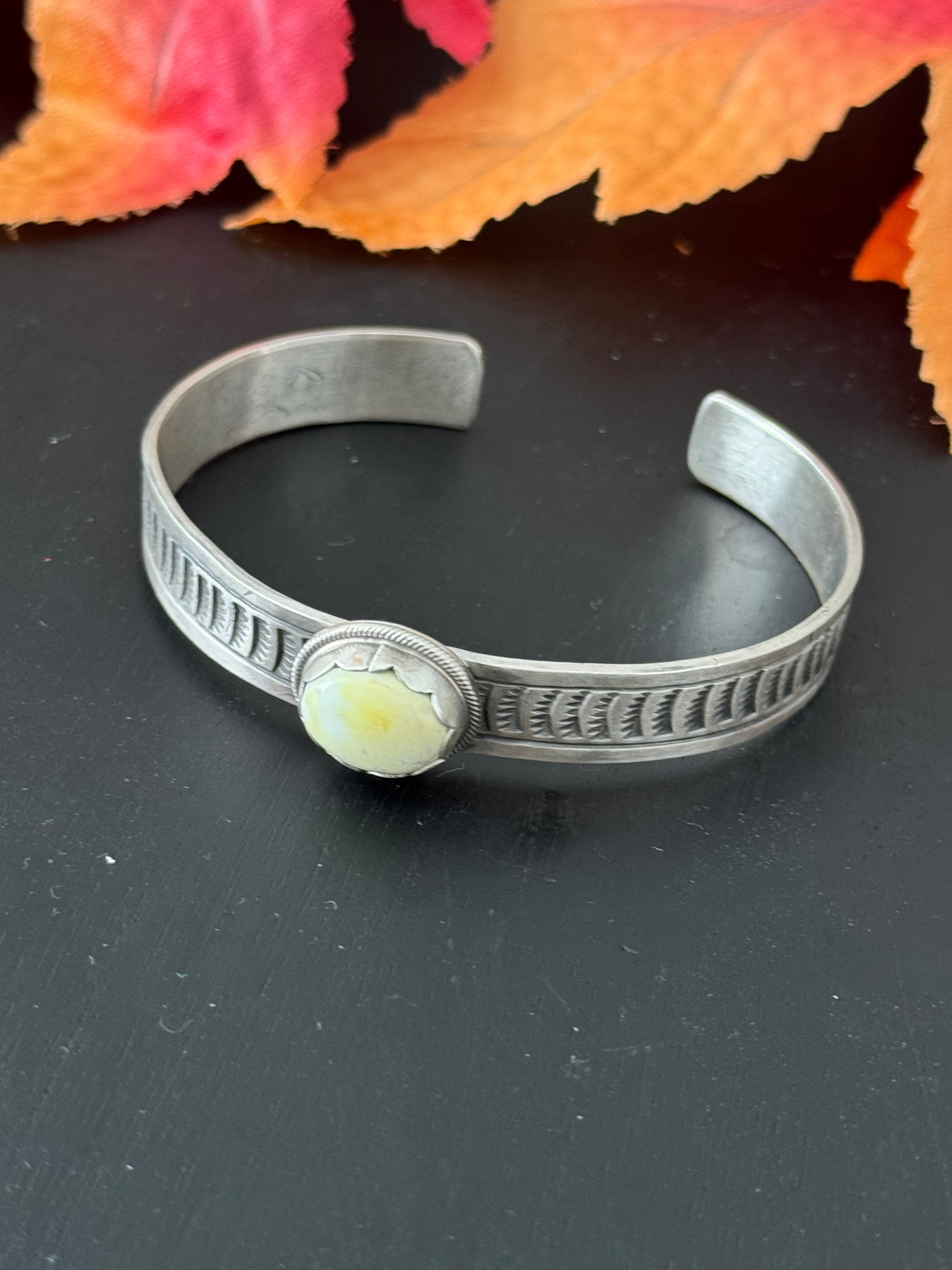 Beautiful Tillie John Palomino Variscite and Sterling Silver Cuff Bracelet. Amazing stones in this piece! It measures 5/8 of an inch wide with an inside circumference of 5 7/8 inches and a gap of 1 1/8 inches. Signed by the artist and stamped sterling silver.