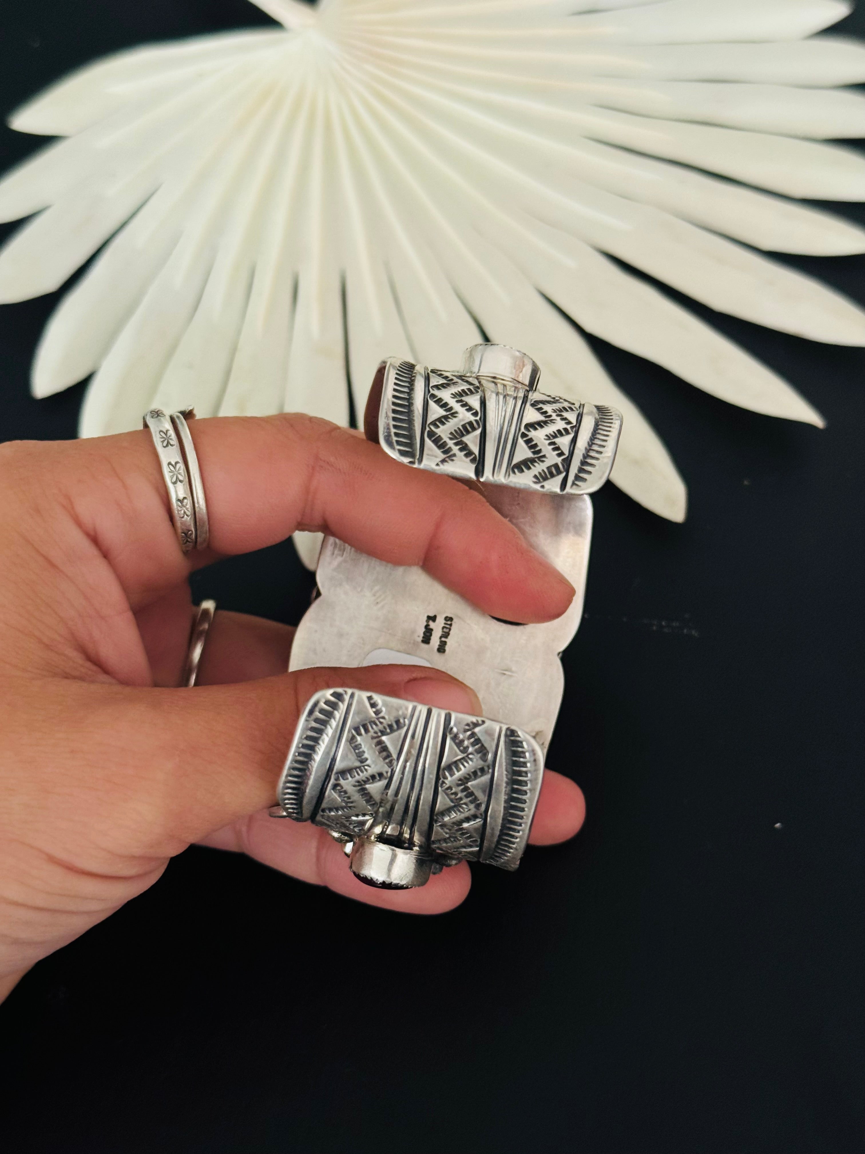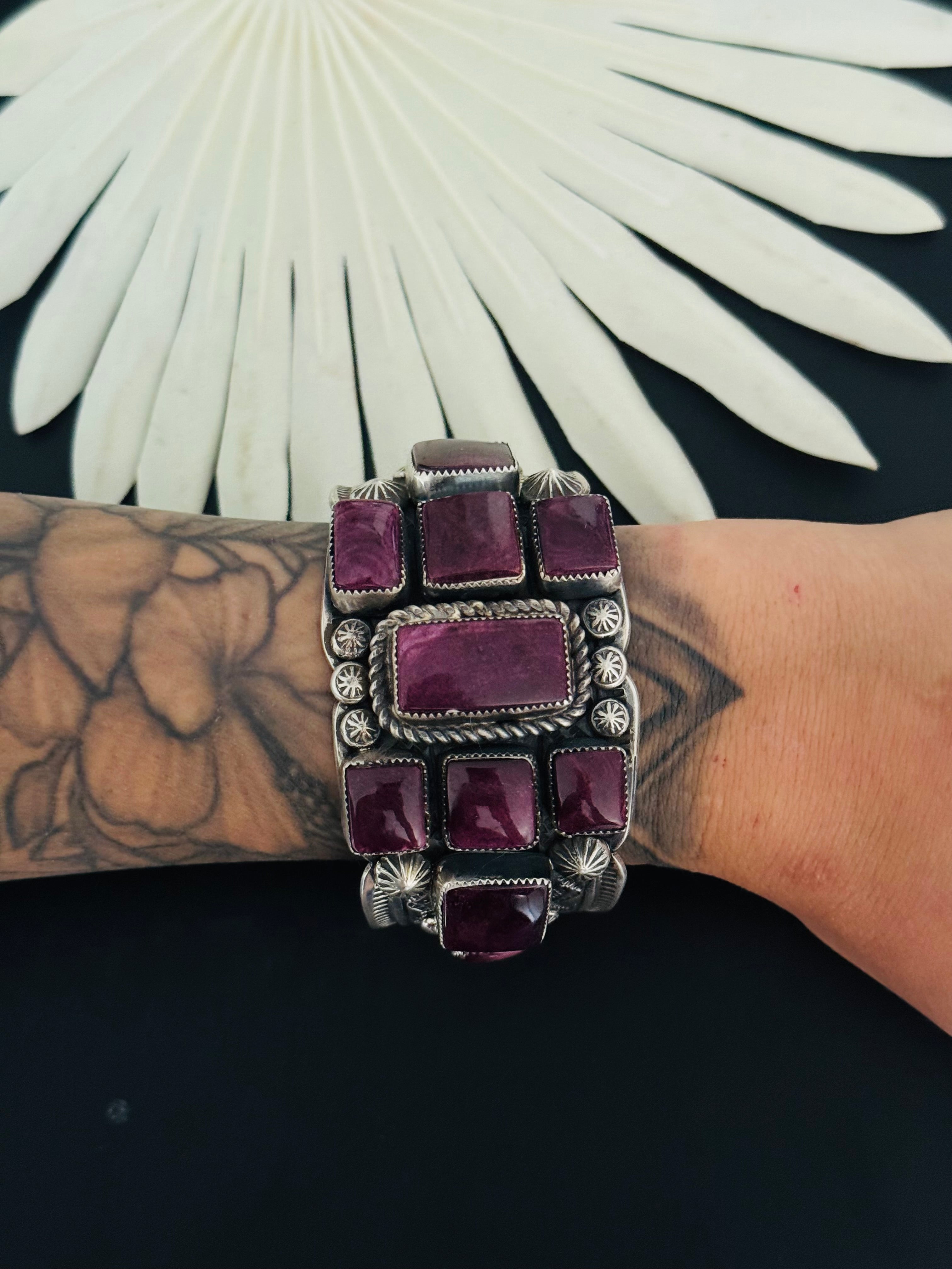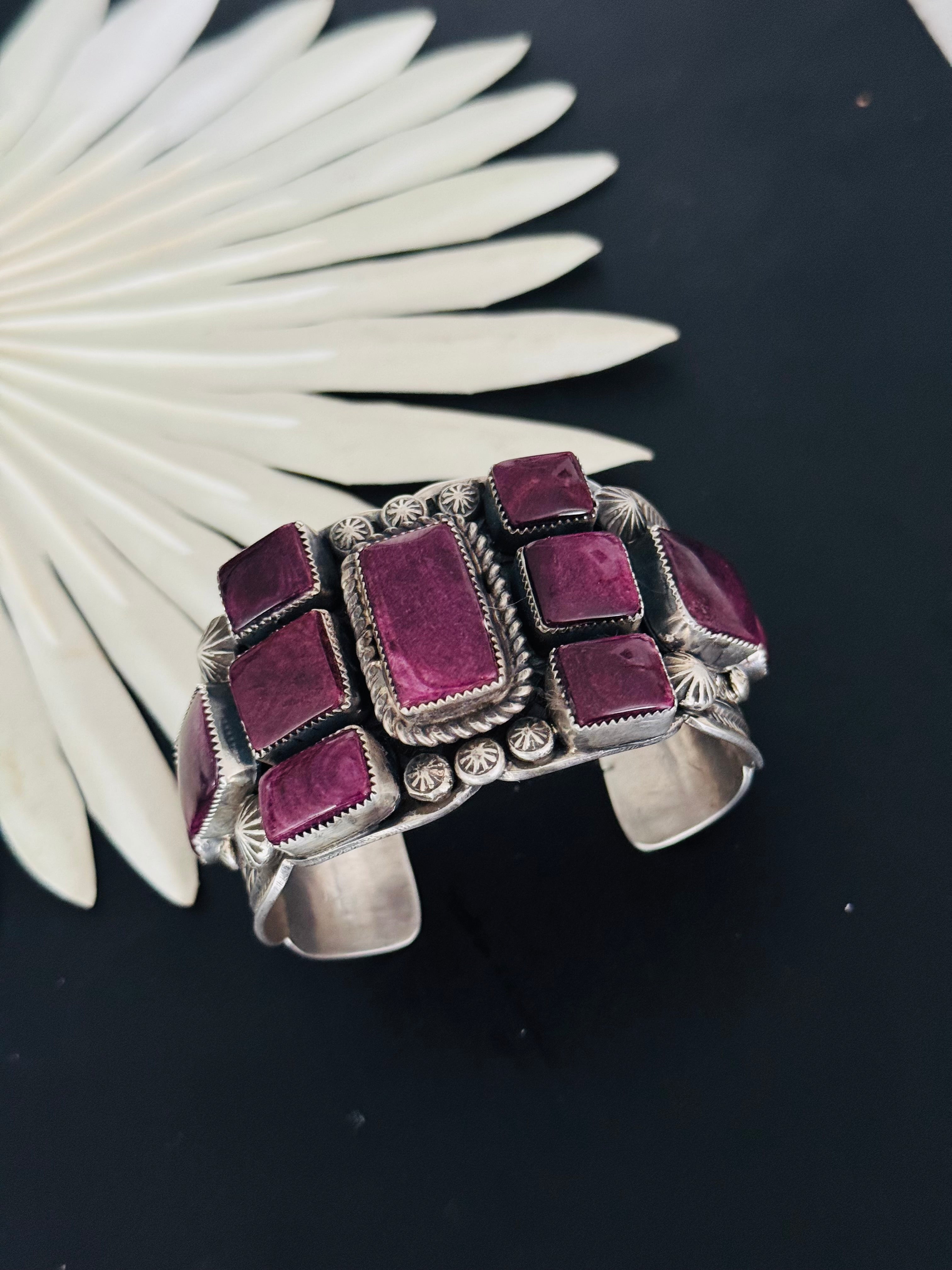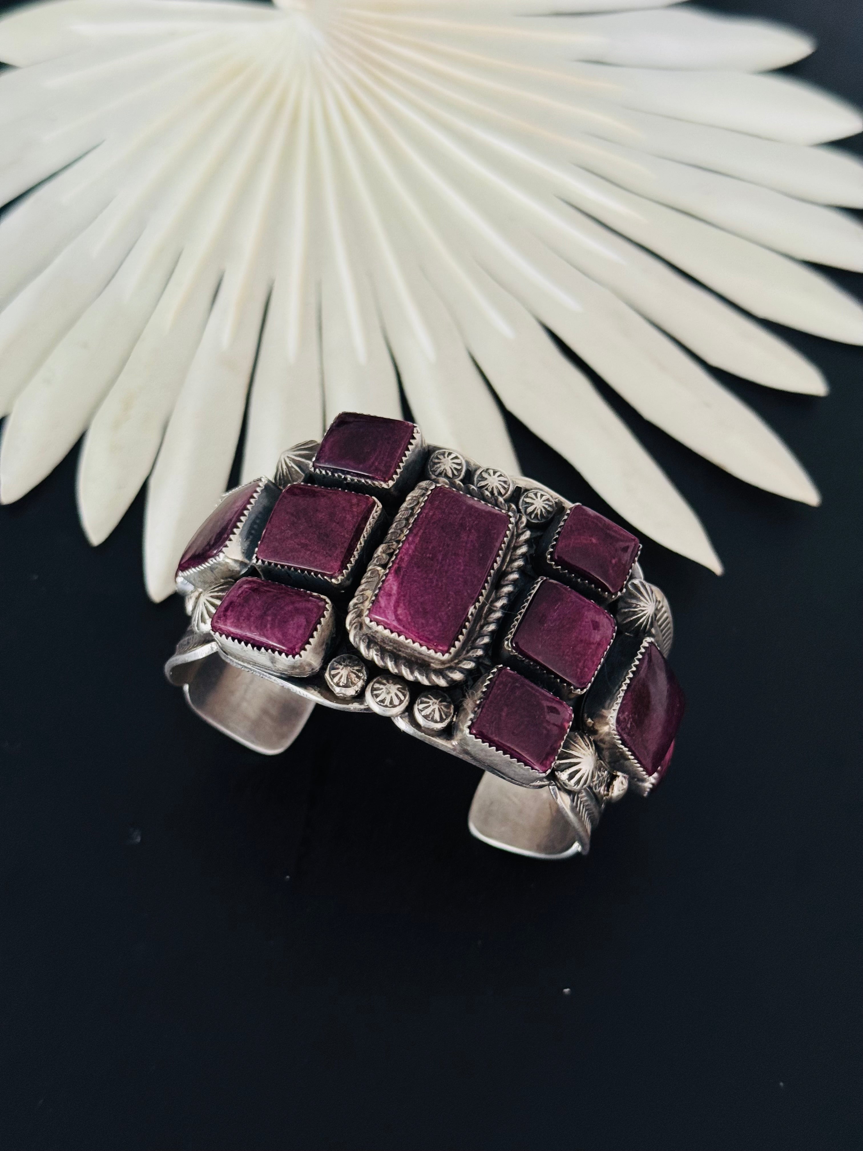 Tillie John Purple Spiny Oyster Sterling Silver Cuff Bracelet. Amazing stones in this piece! It measures 1 5/8 inches wide with an inside circumference of 5 5/8 inches and a gap of 1 1/8 inches. Signed by the artist and stamped sterling silver.