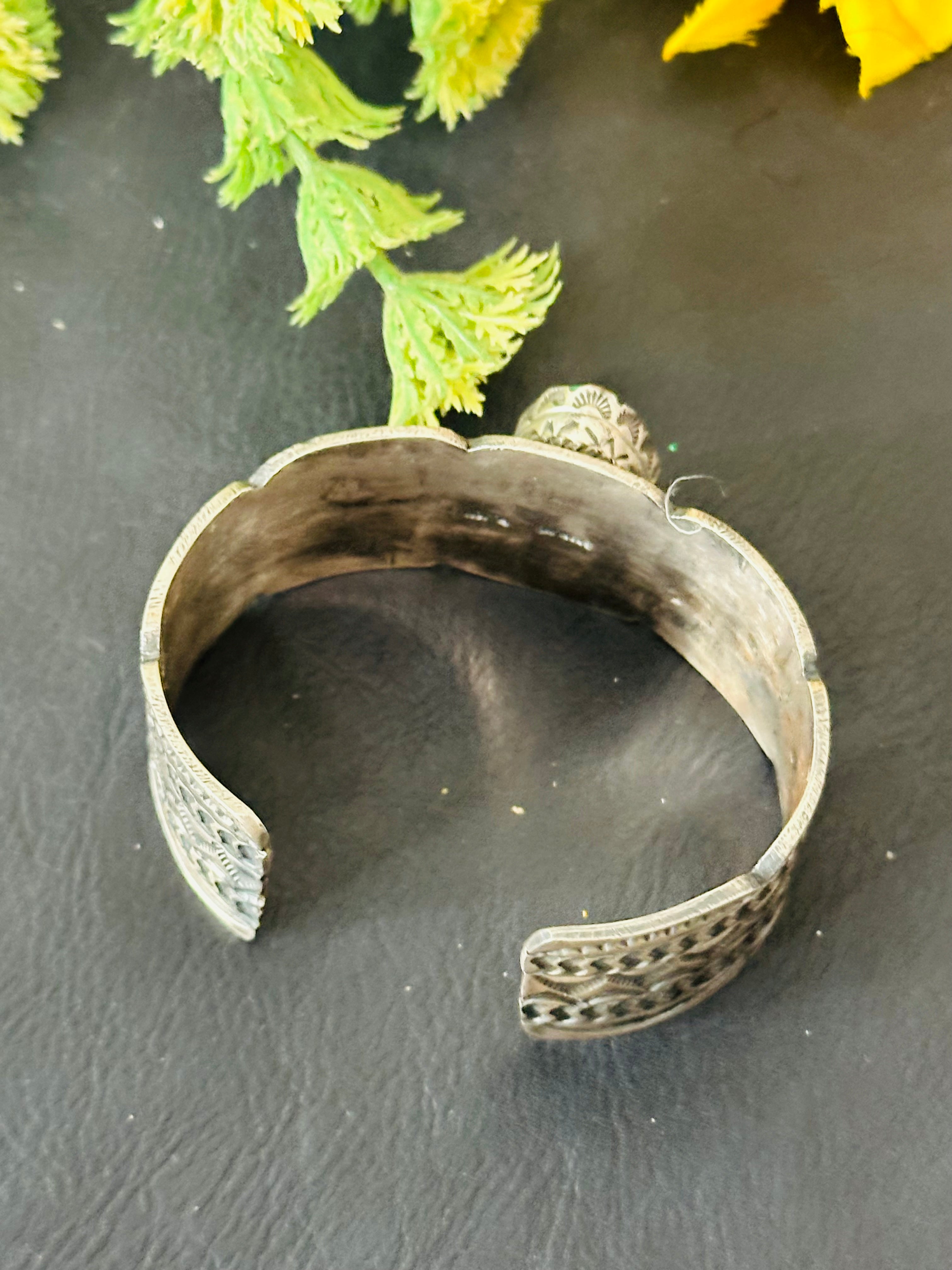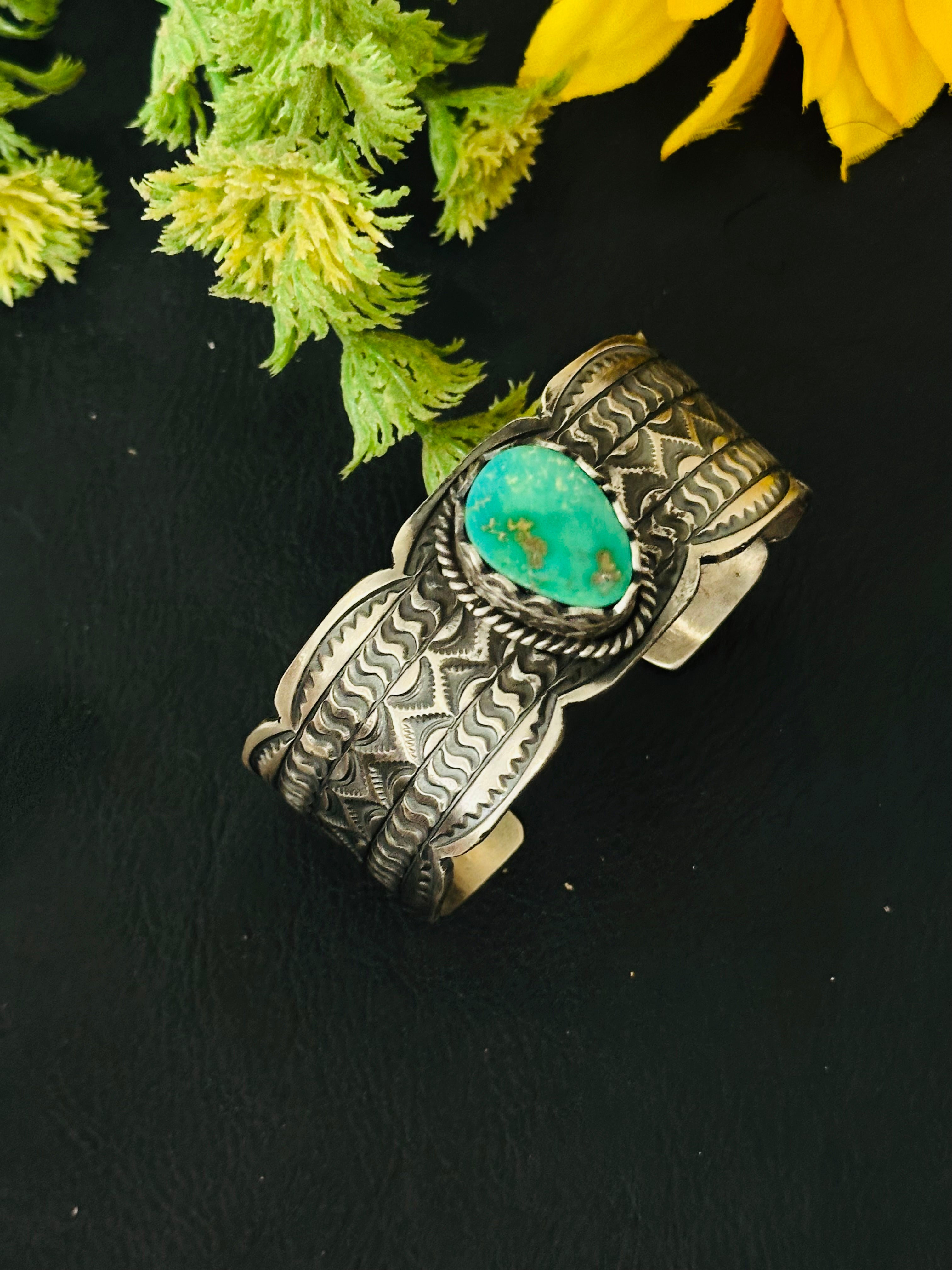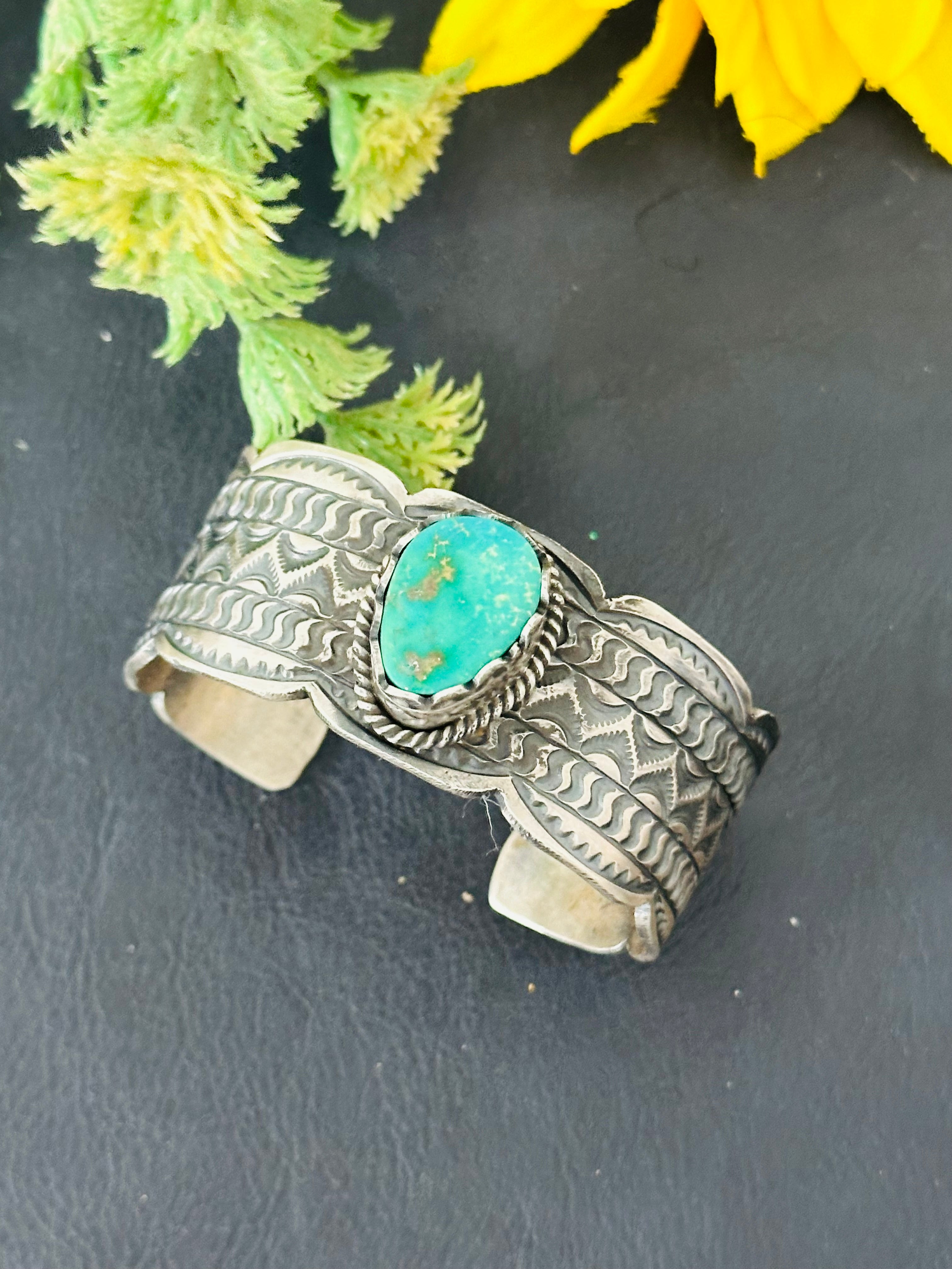 Beautiful Tillie John Royston Turquoise and Sterling Silver Cuff Bracelet. Amazing stones in this piece! It measures 1 1/8 inches wide with an inside circumference of 5 7/8 inches and a gap of 1 1/8 inches. Signed by the artist and stamped sterling silver.