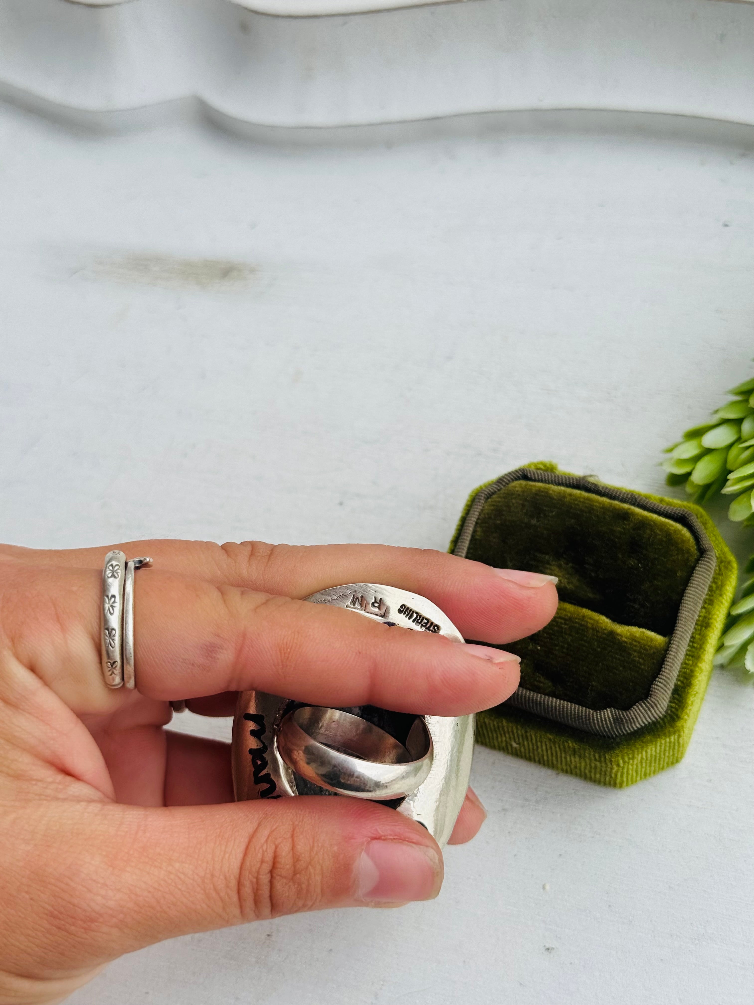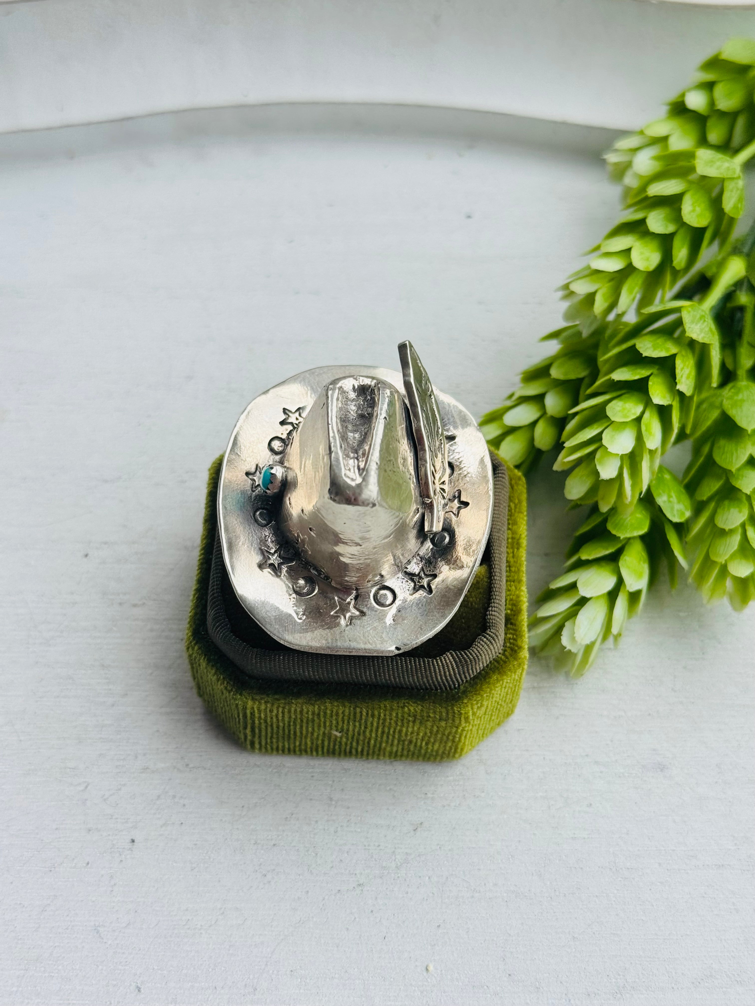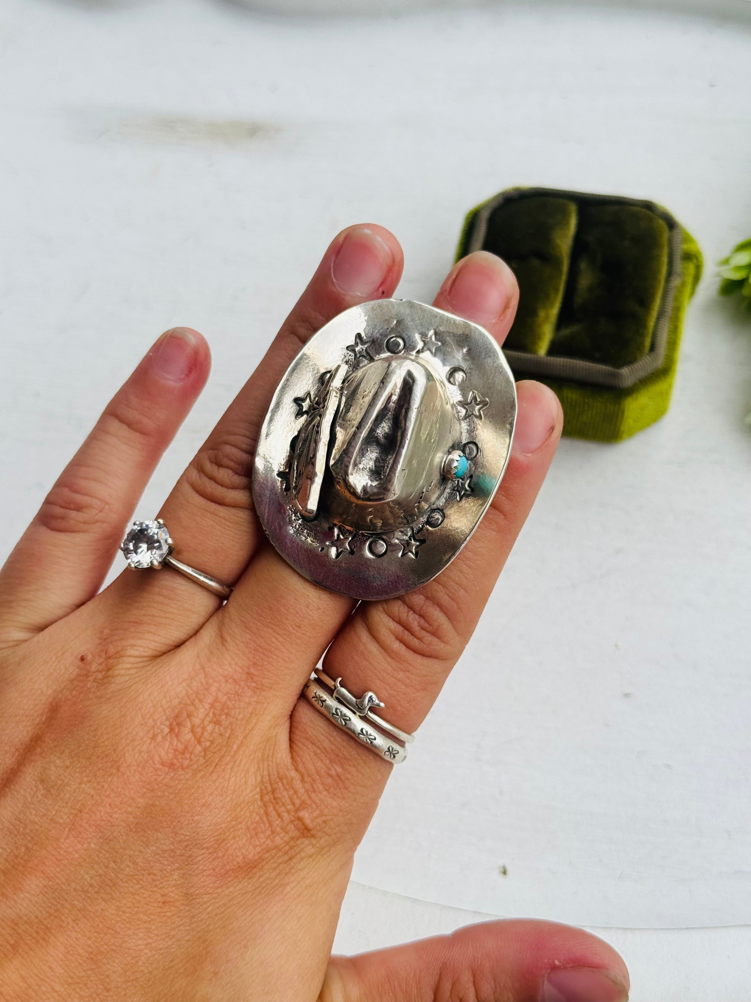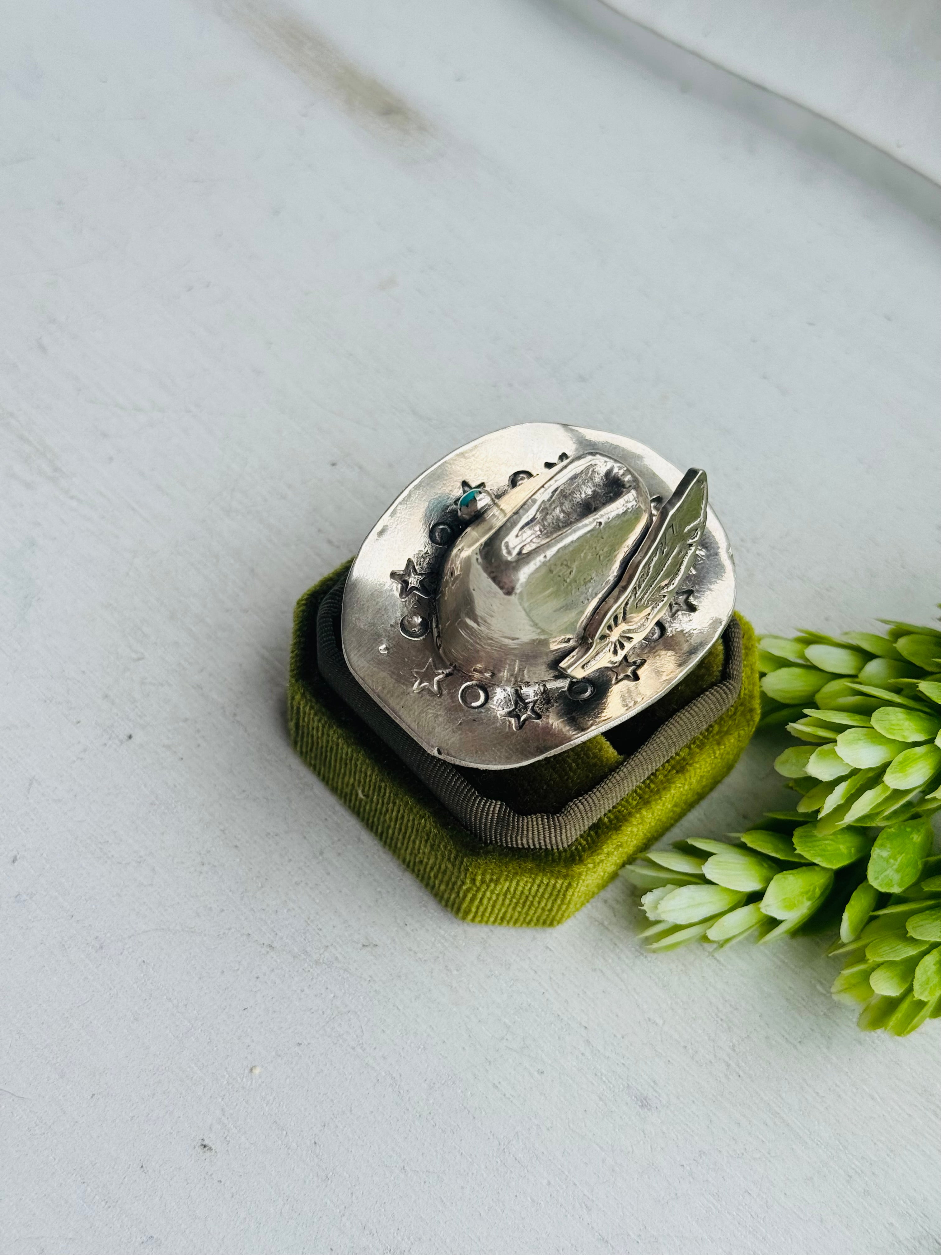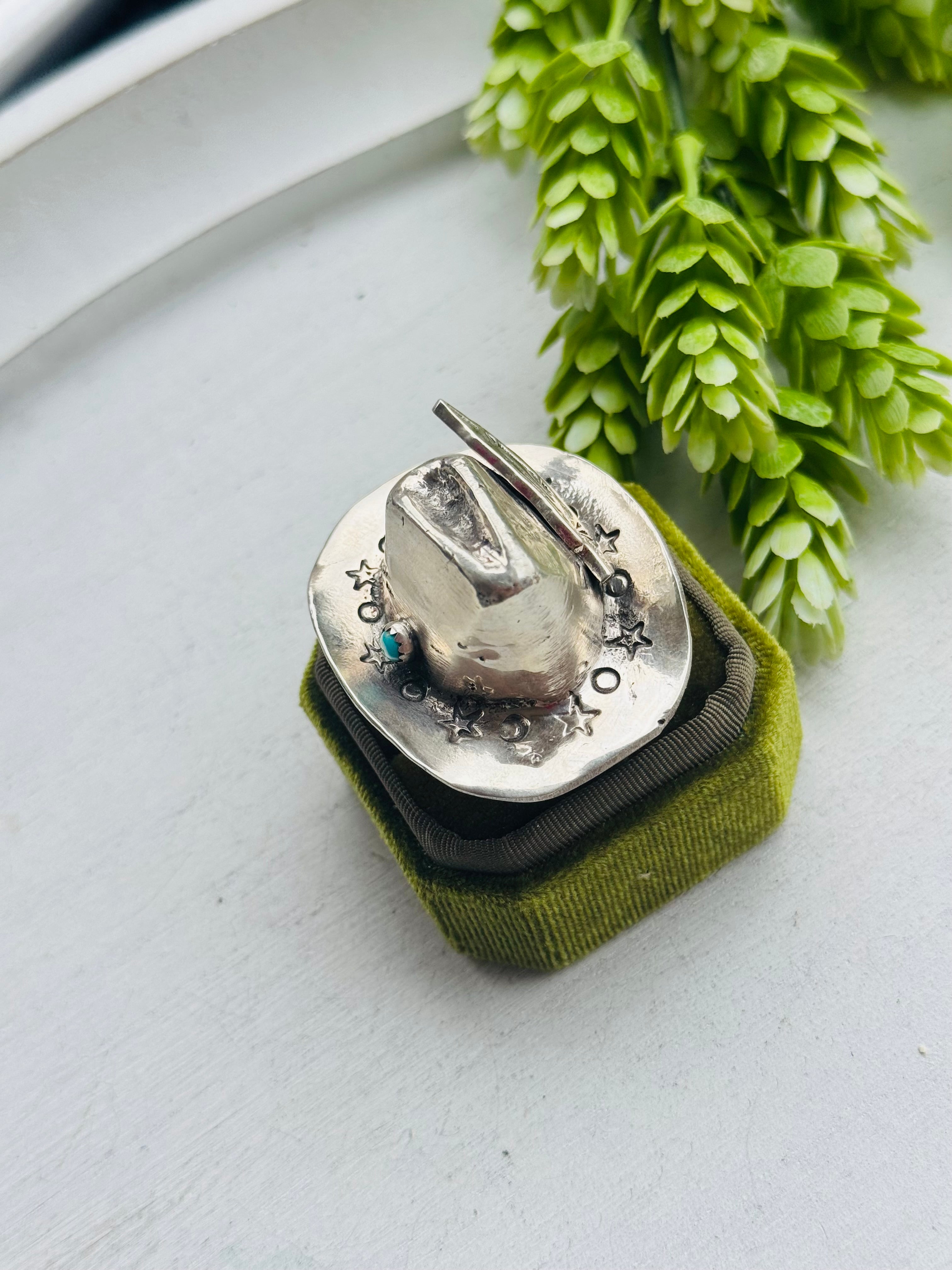 Robby Manuelito Kingman Turquoise & Sterling Silver Cowboy Hat Adjustable Ring. It measures 2 inches long and 1 3/4 inches wide. Signed by the artist and stamped sterling silver.