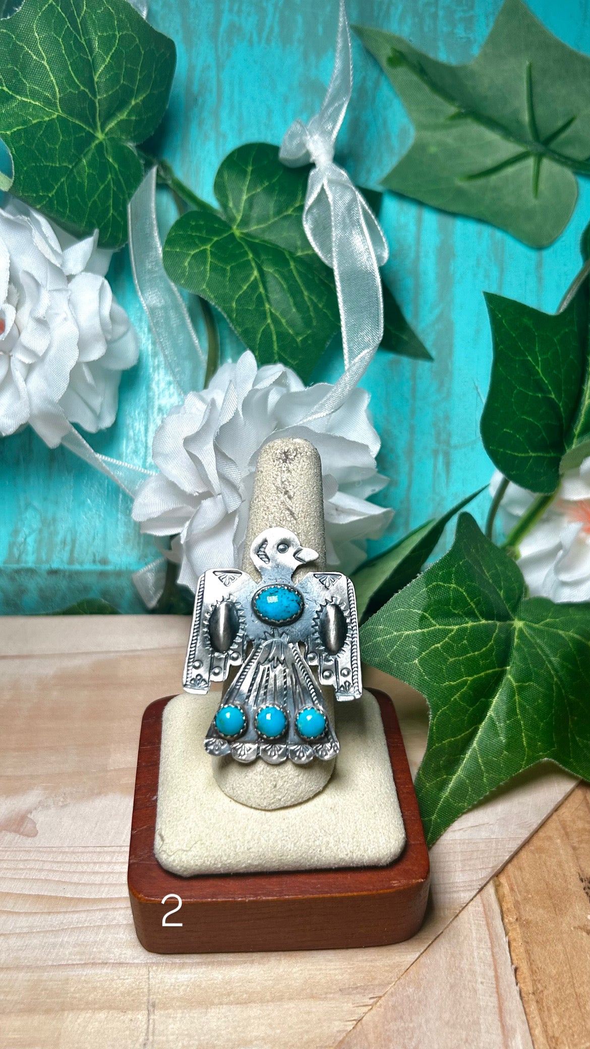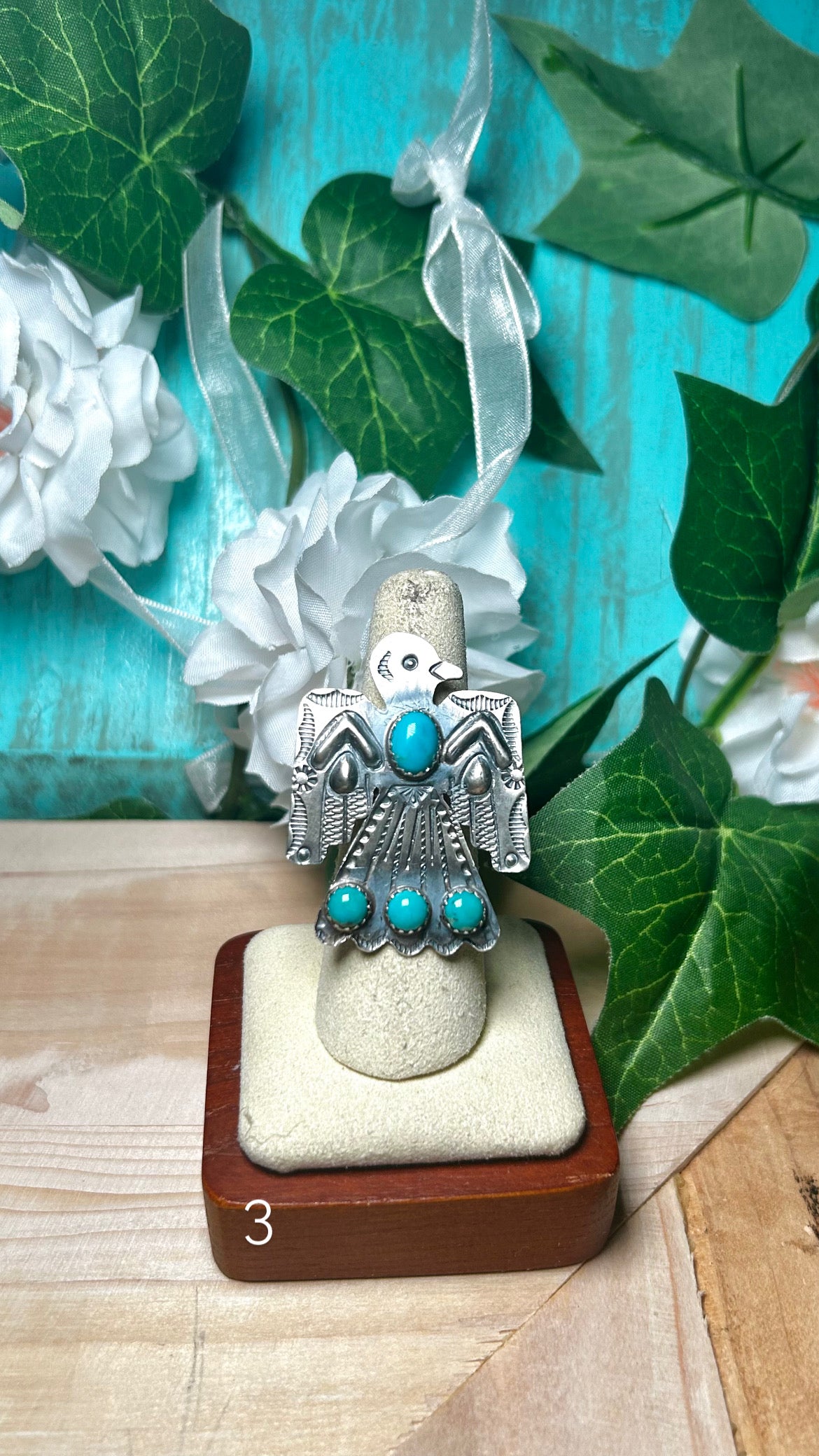 Tim Yazzie Kingman Turquoise & Sterling Silver Adjustable Ring. It measures 1 5/8 inches long and 1 5/8 inches wide. Stamped sterling silver and signed.