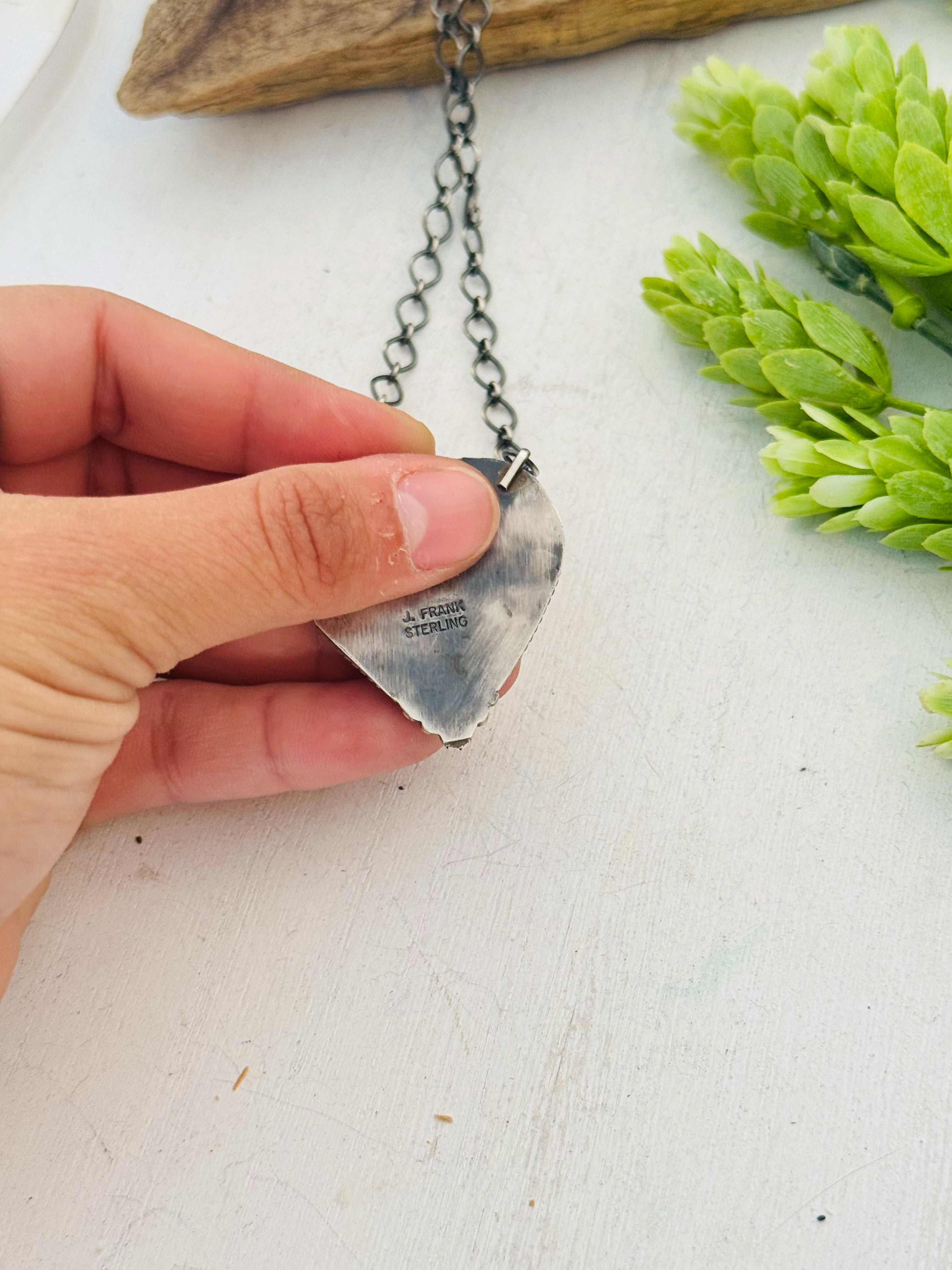 Jon Frank White Buffalo & Sterling Silver Heart Necklace. It measures 21 inches long with hang while the chain measures 18 1/2 inches long. Signed by the artist and stamped sterling silver.