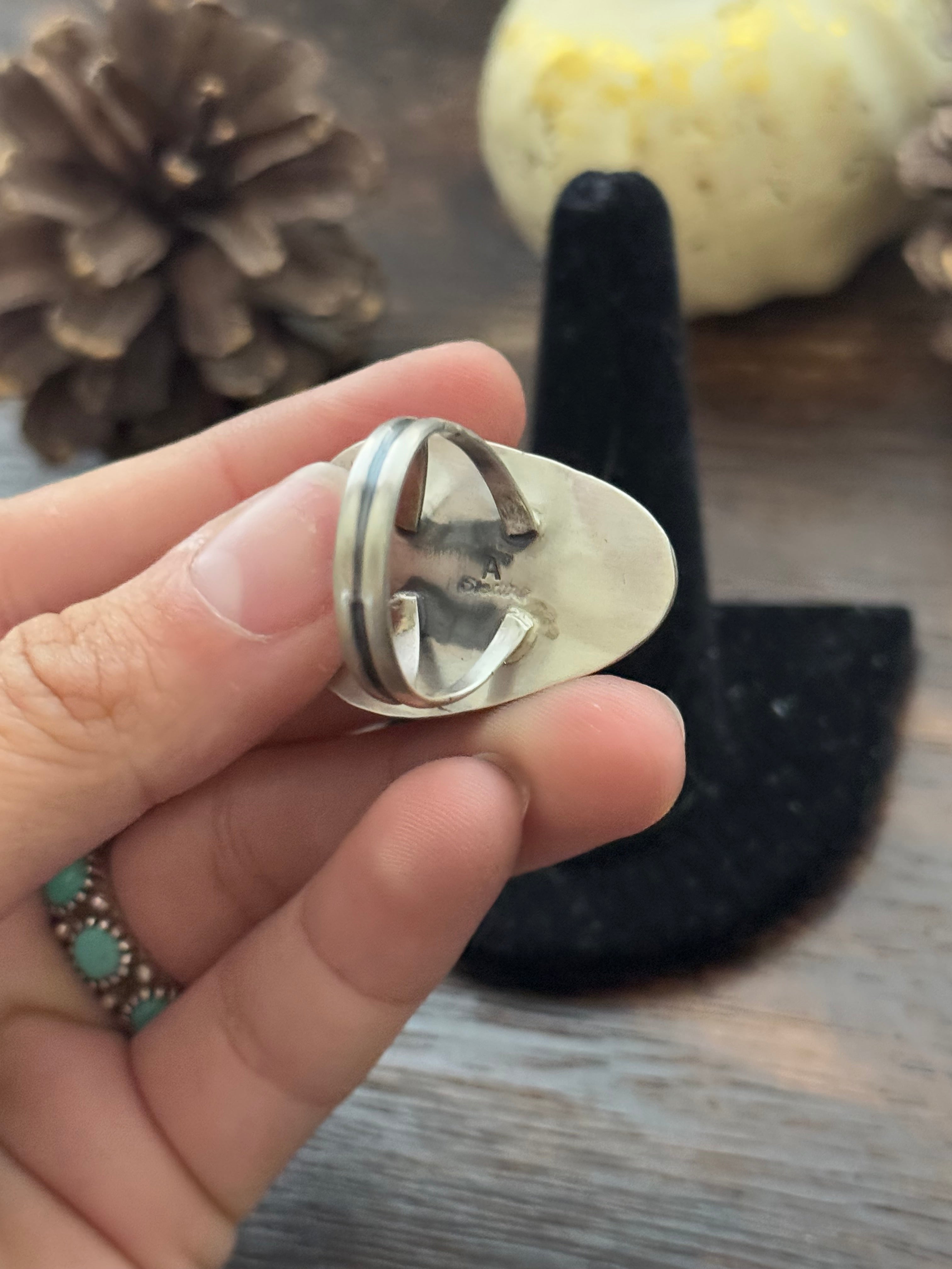 Antonnette Yazzie Sonoran Mountain Turquoise & Sterling Silver Ring Size 8.25. It measures 1 1/4 inches long and 7/8 of an inch wide. Signed by the artist and stamped sterling silver.