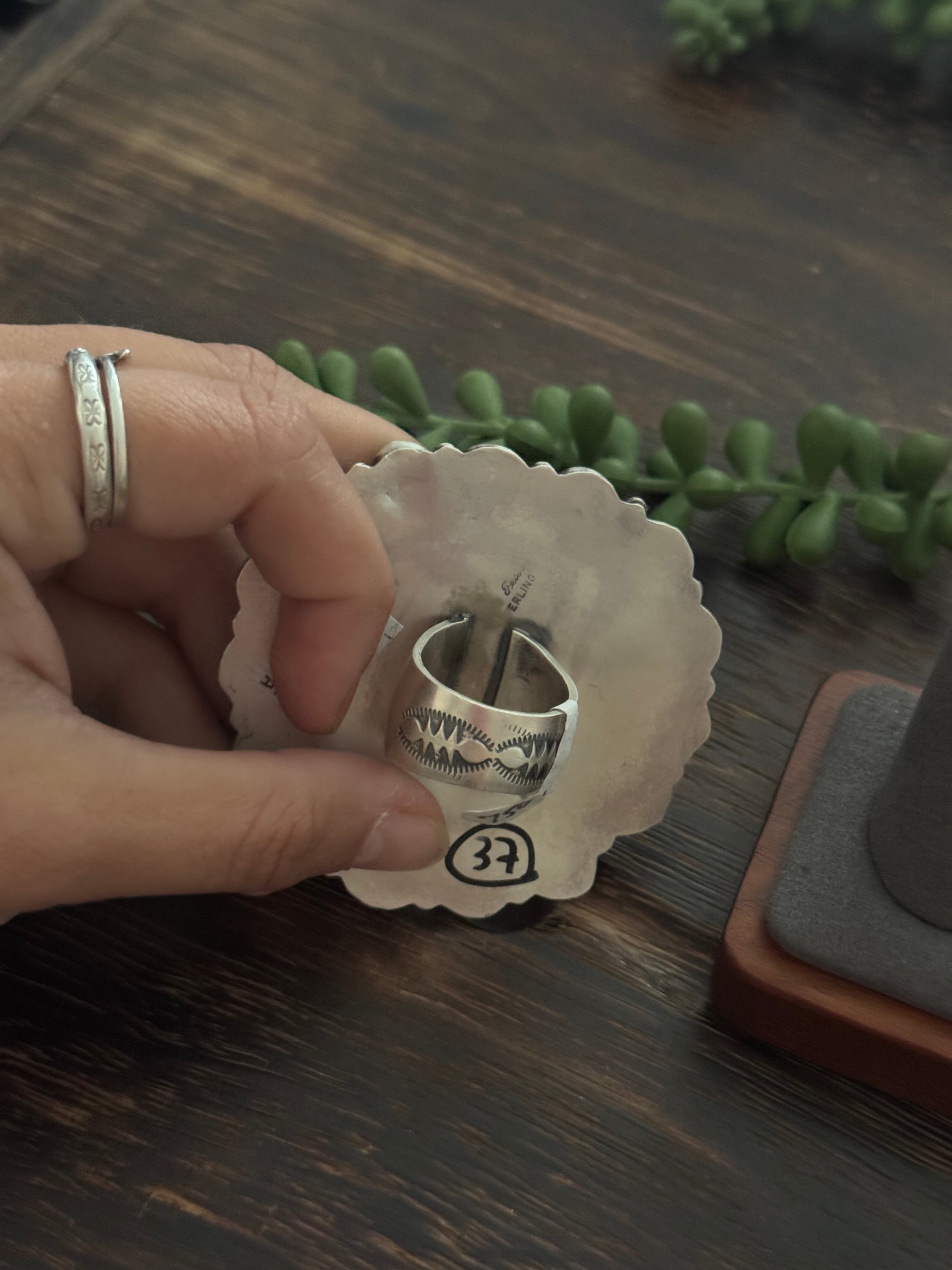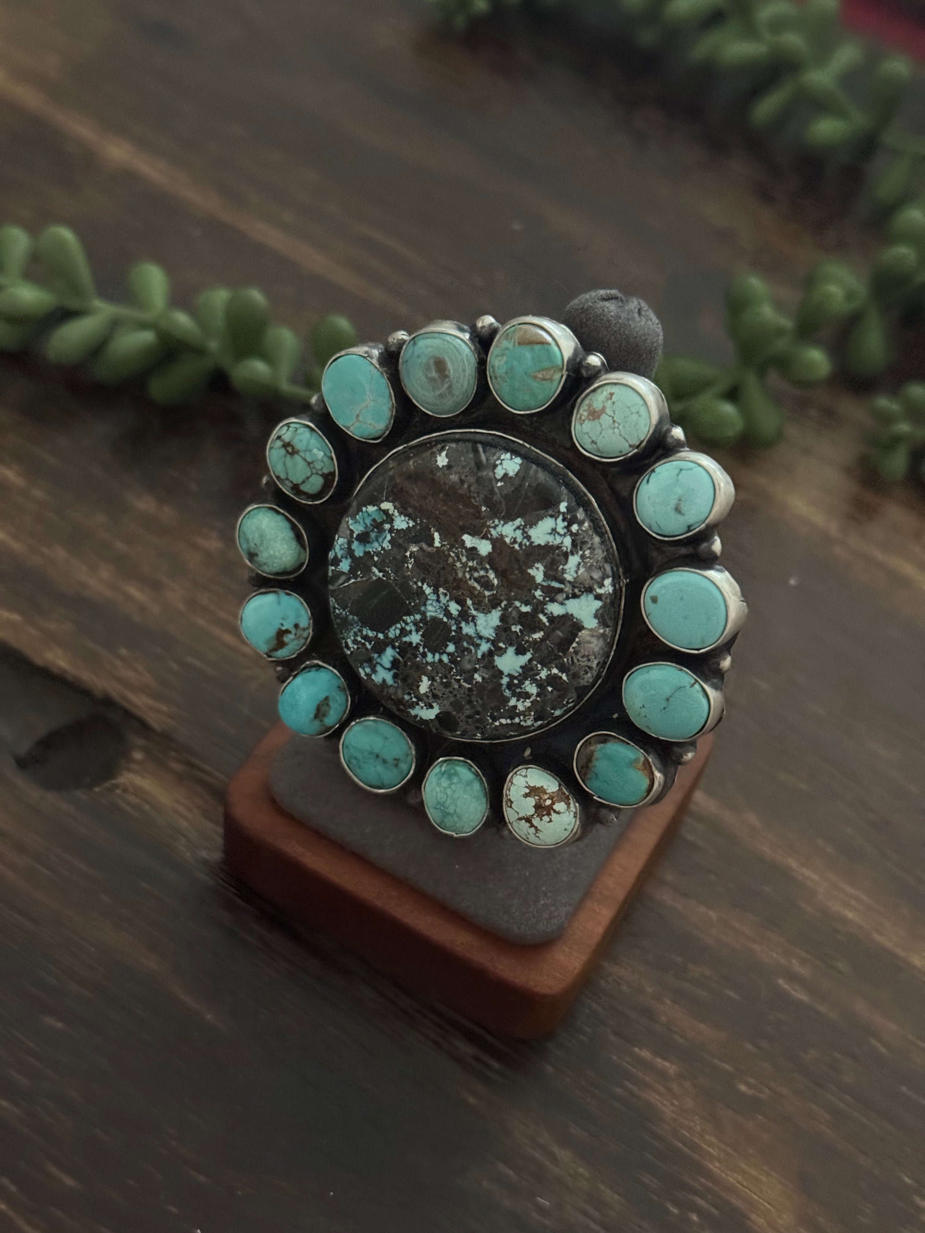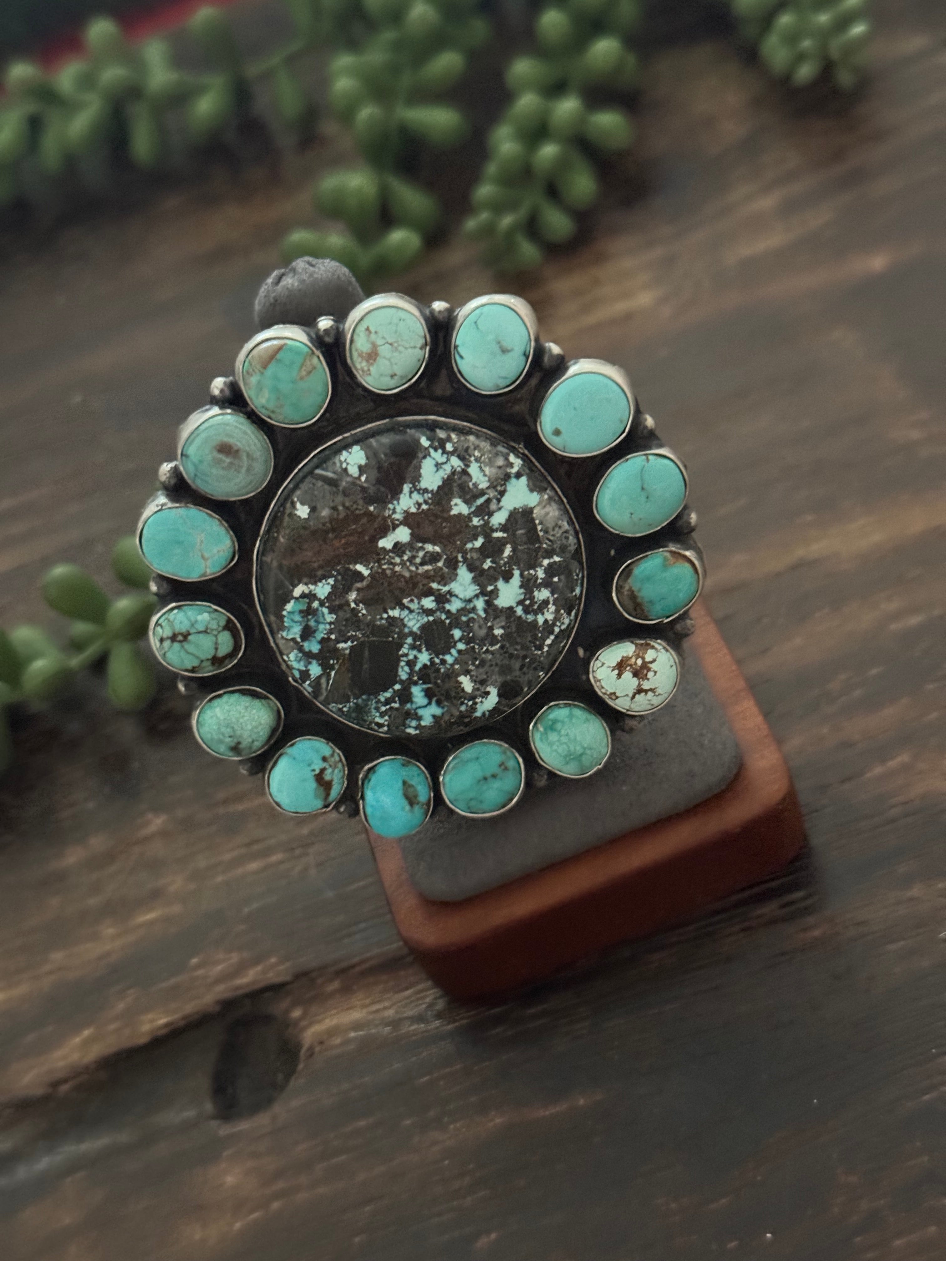 Travis J Mixed Turquoise & Sterling Silver Cluster Ring Size 8 . It measures 2 1/2 inches long and 2 1/2 inches wide. Signed by the artist and stamped sterling silver.