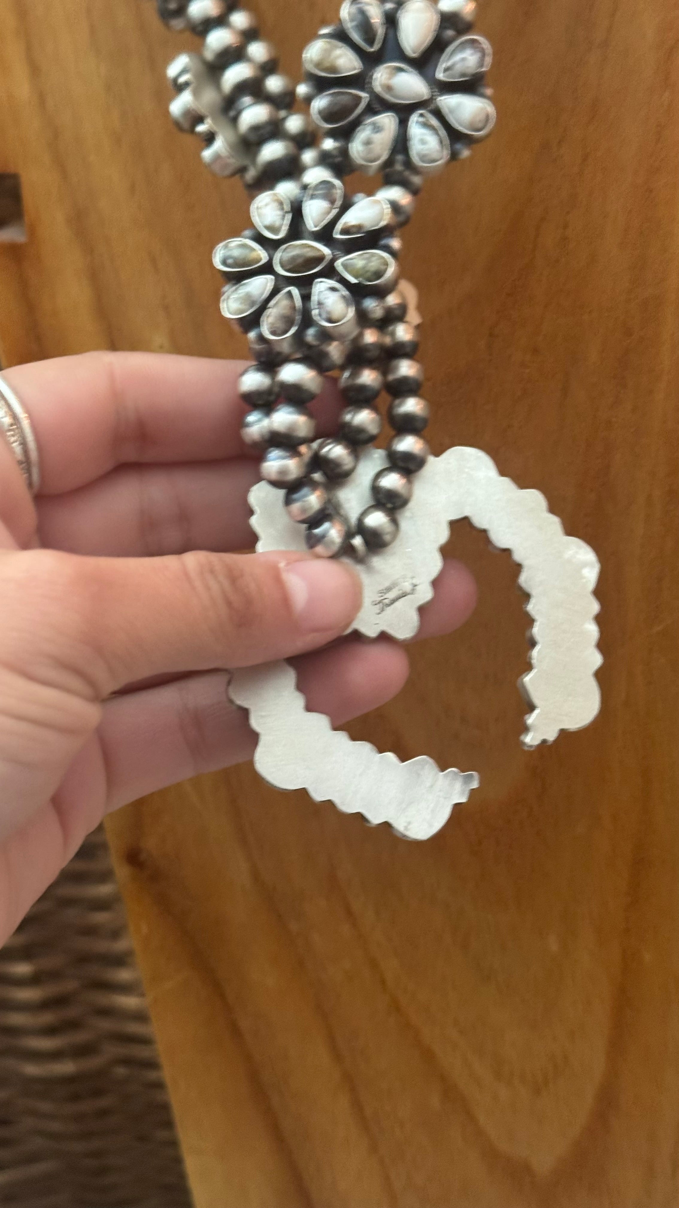 Travis J. White Buffalo & Sterling Silver Cluster Squash Necklace Set. It measures 30 inches long with hang while the chain measures 26 inches long. Signed by the artist and stamped sterling silver.