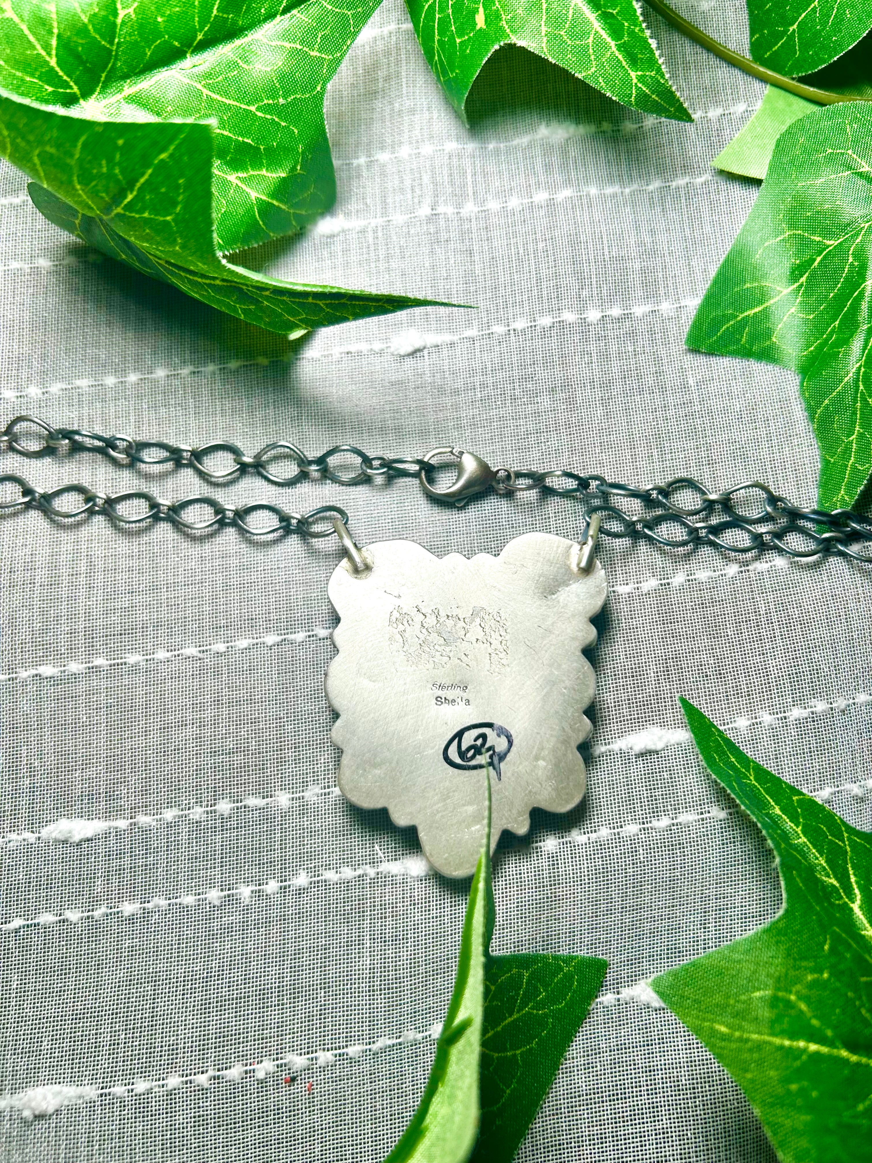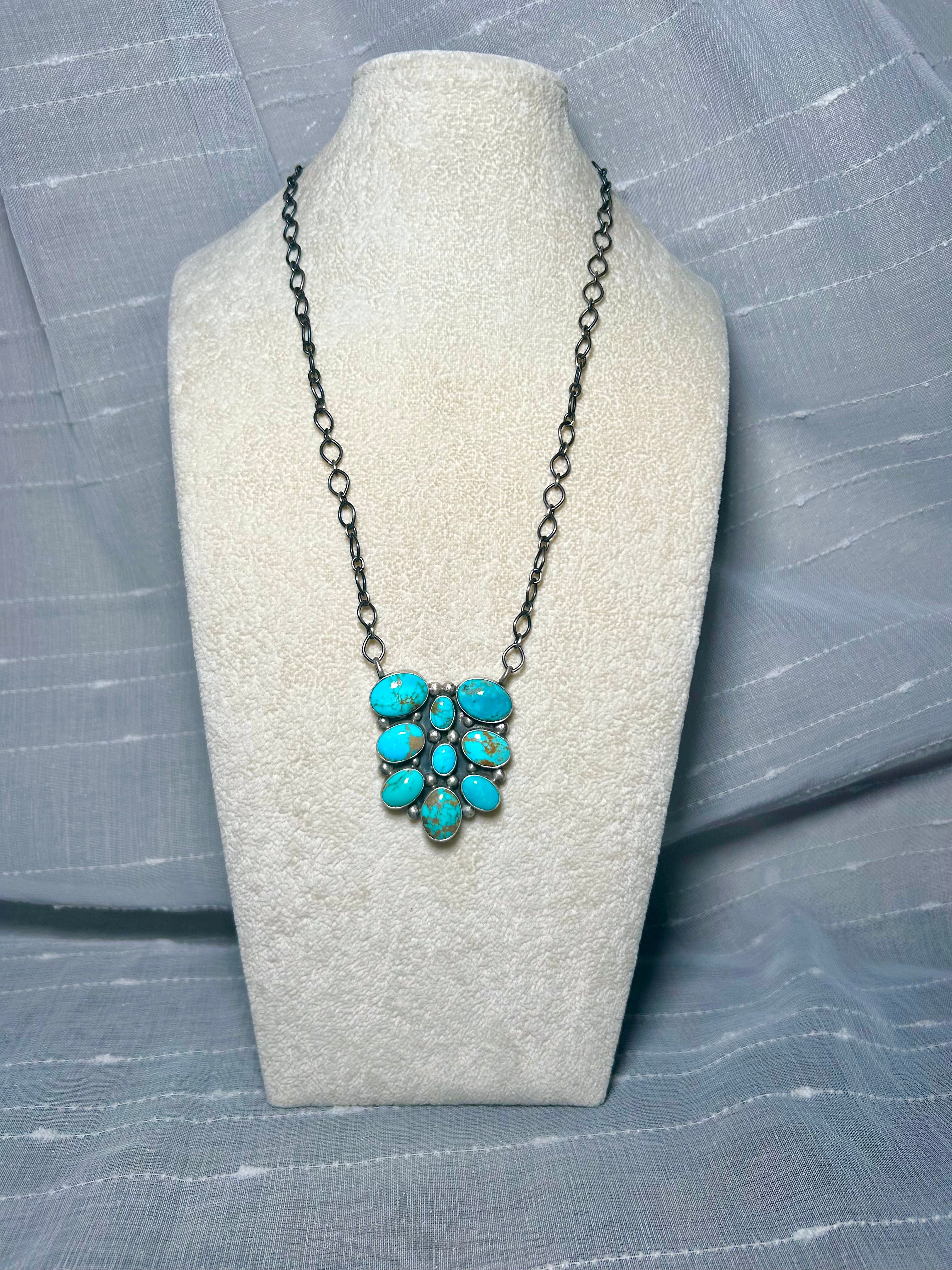 Sheila Becenti Kingman Turquoise & Sterling Silver Necklace. It measures 24 inches long with hang while the chain measures 20 inches long. Signed by the artist and stamped sterling silver.