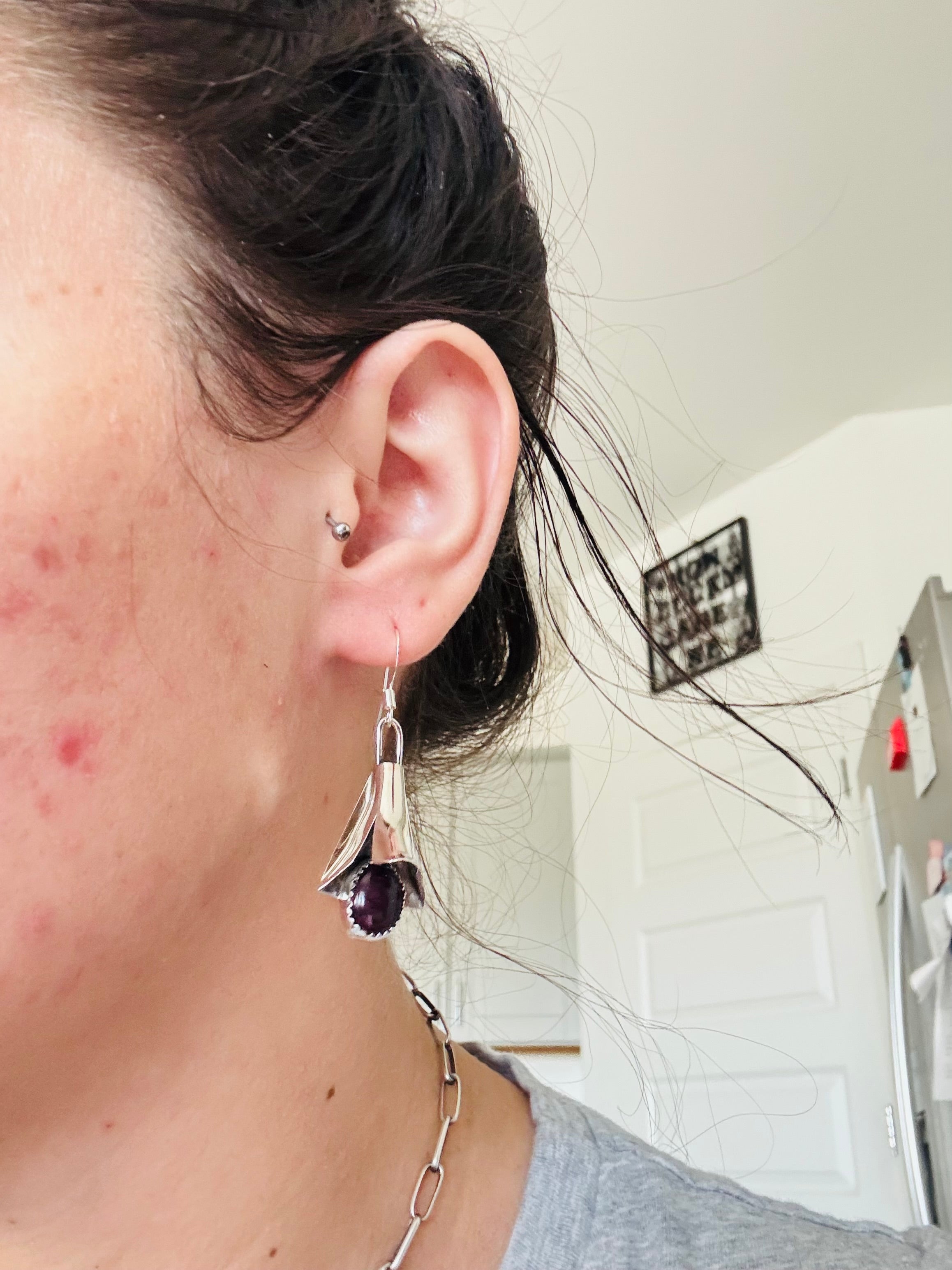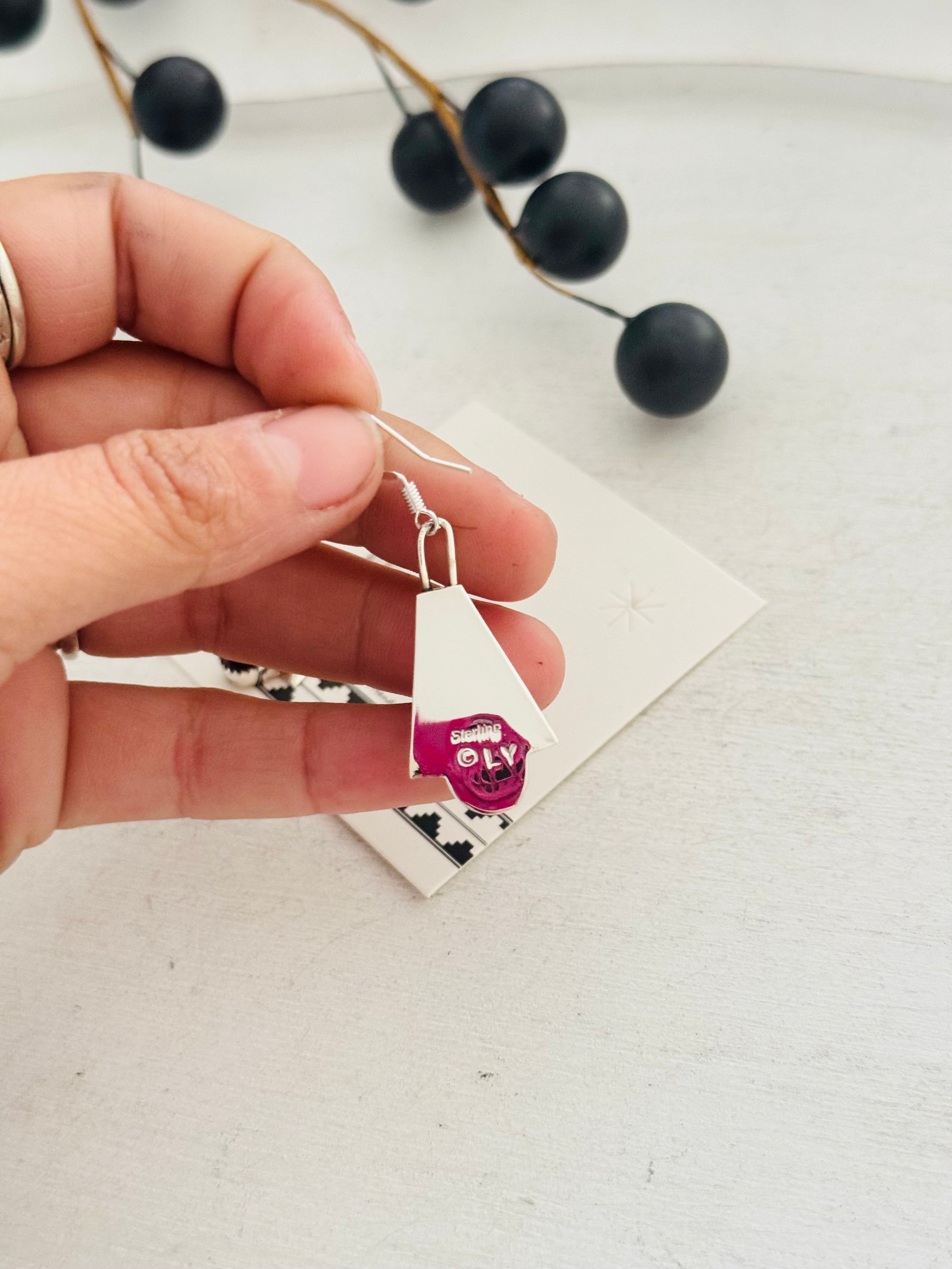 Louise Yazzie Purple Spiny Oyster & Sterling Silver Blossom Dangle Earrings. It measures 1 7/8 inches long and 5/8 of an inch wide. Signed by artist and stamped sterling silver.
