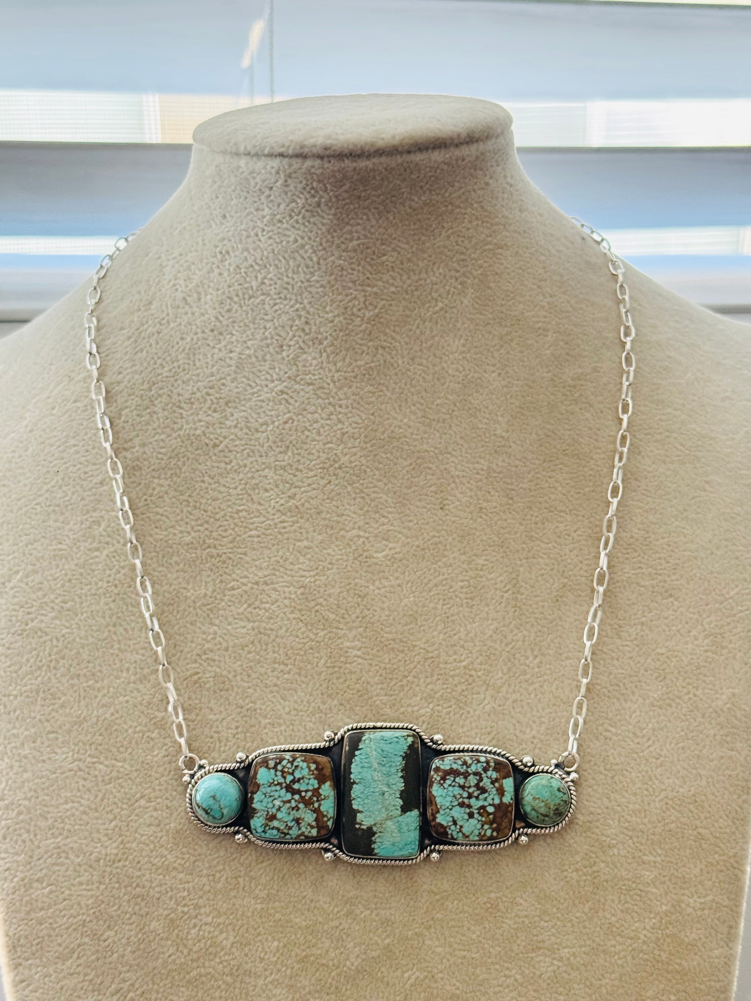 Beautiful Necklace. Southwest Made #8 Turquoise & Sterling Silver Necklace. It measures 17 inches long with hang while the chain measures 15 inches long. Signed by the artist and stamped sterling silver.
