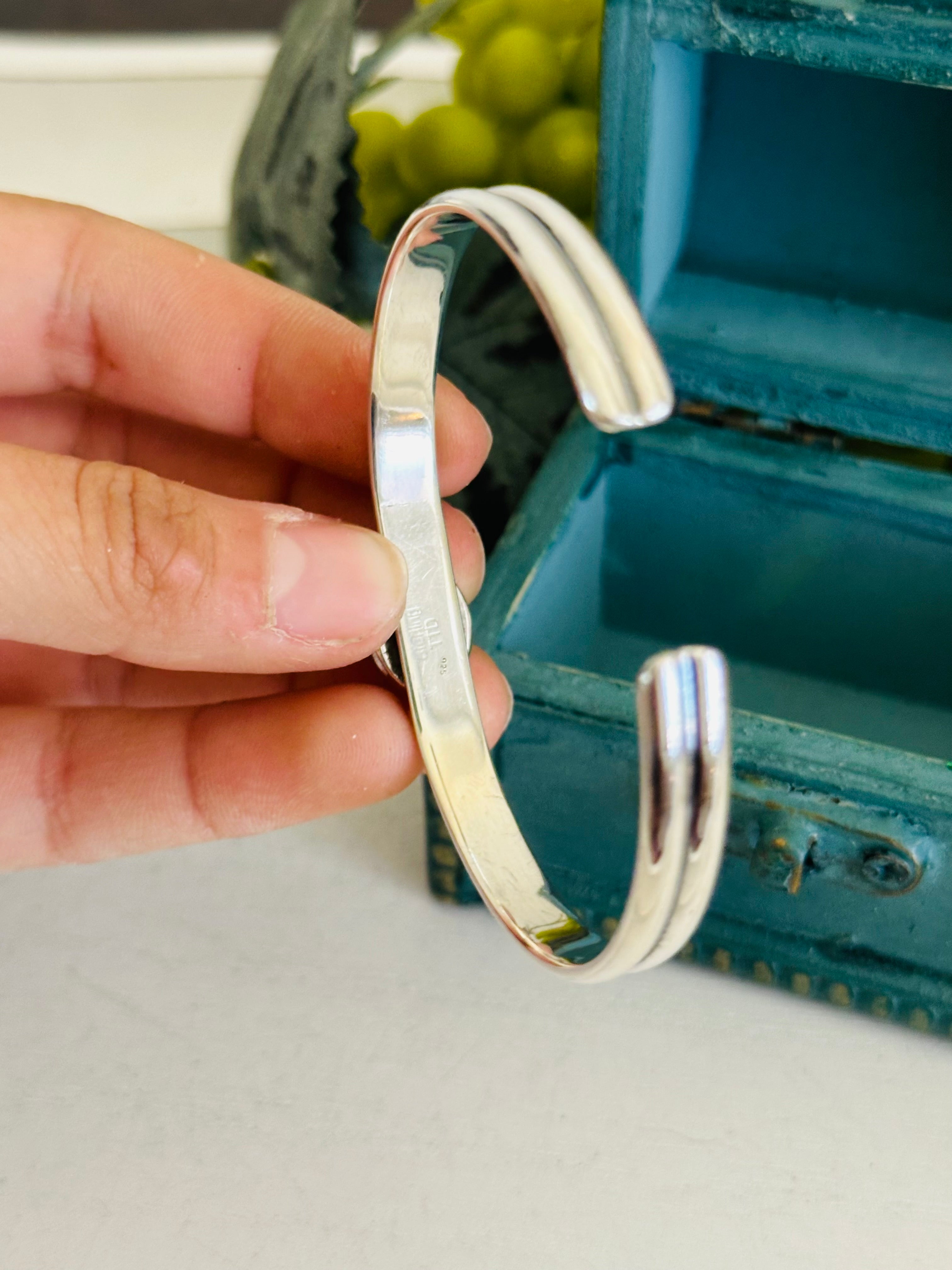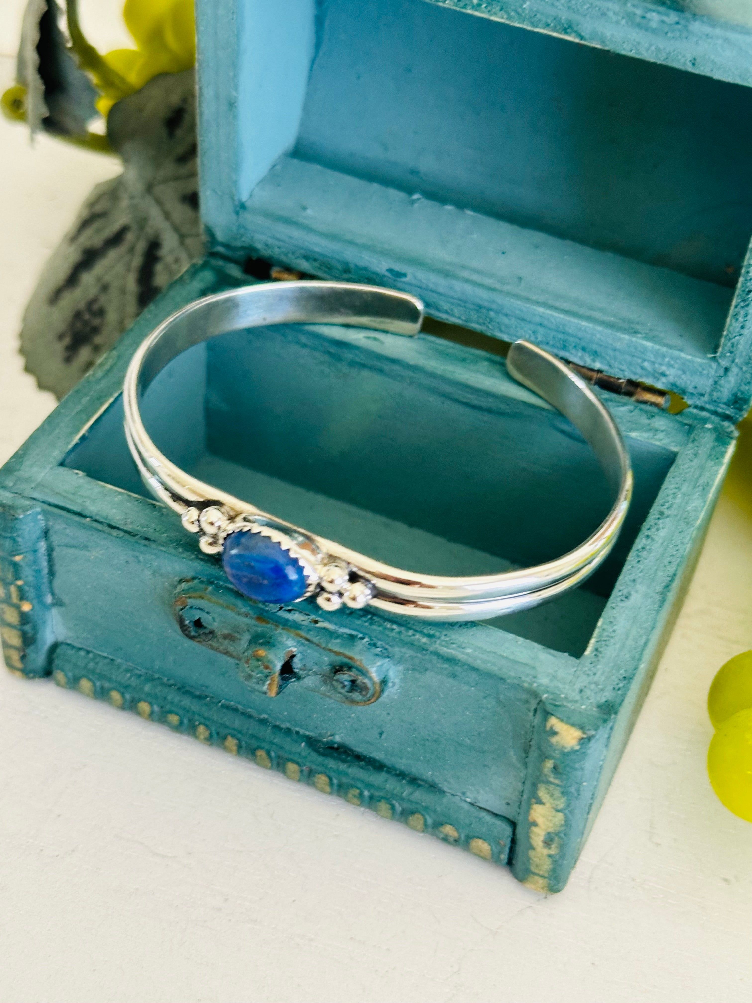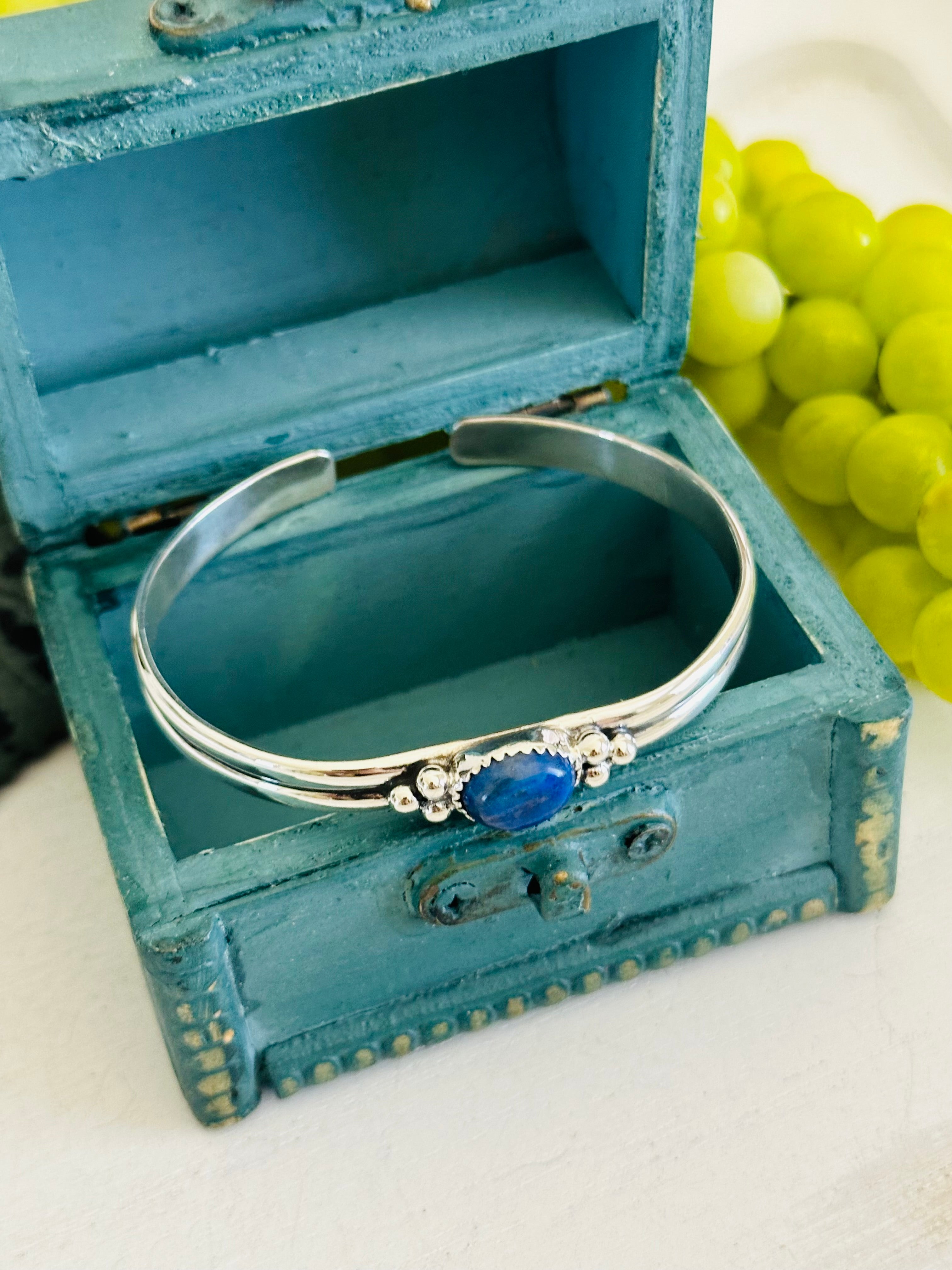 Southwest Made Lapis & Sterling Silver Cuff Bracelet. It measures just over 1/4 of an inch wide with an inside circumference of 6 1/4 inches and a gap of 1 inch. Signed by artist and stamped sterling silver. Cuff has flex to it.