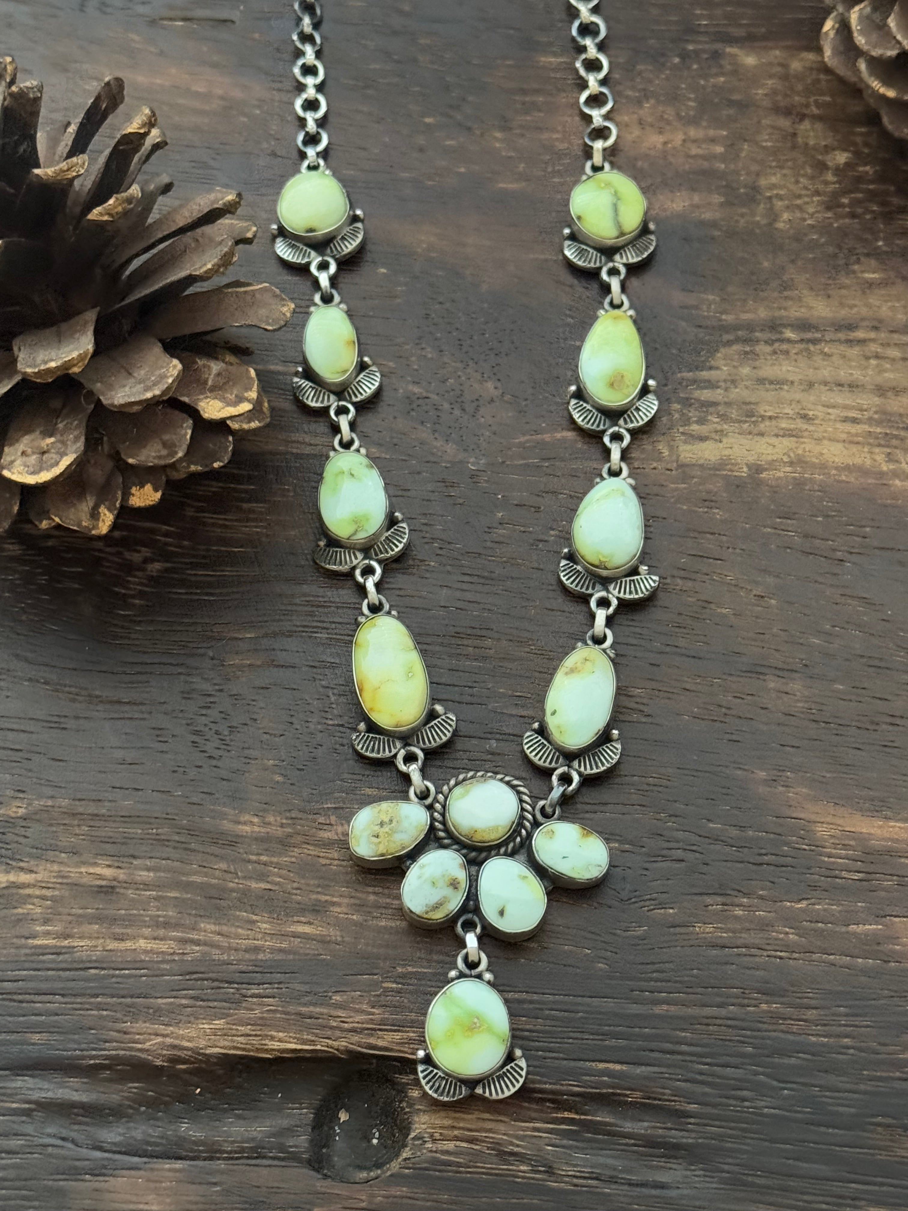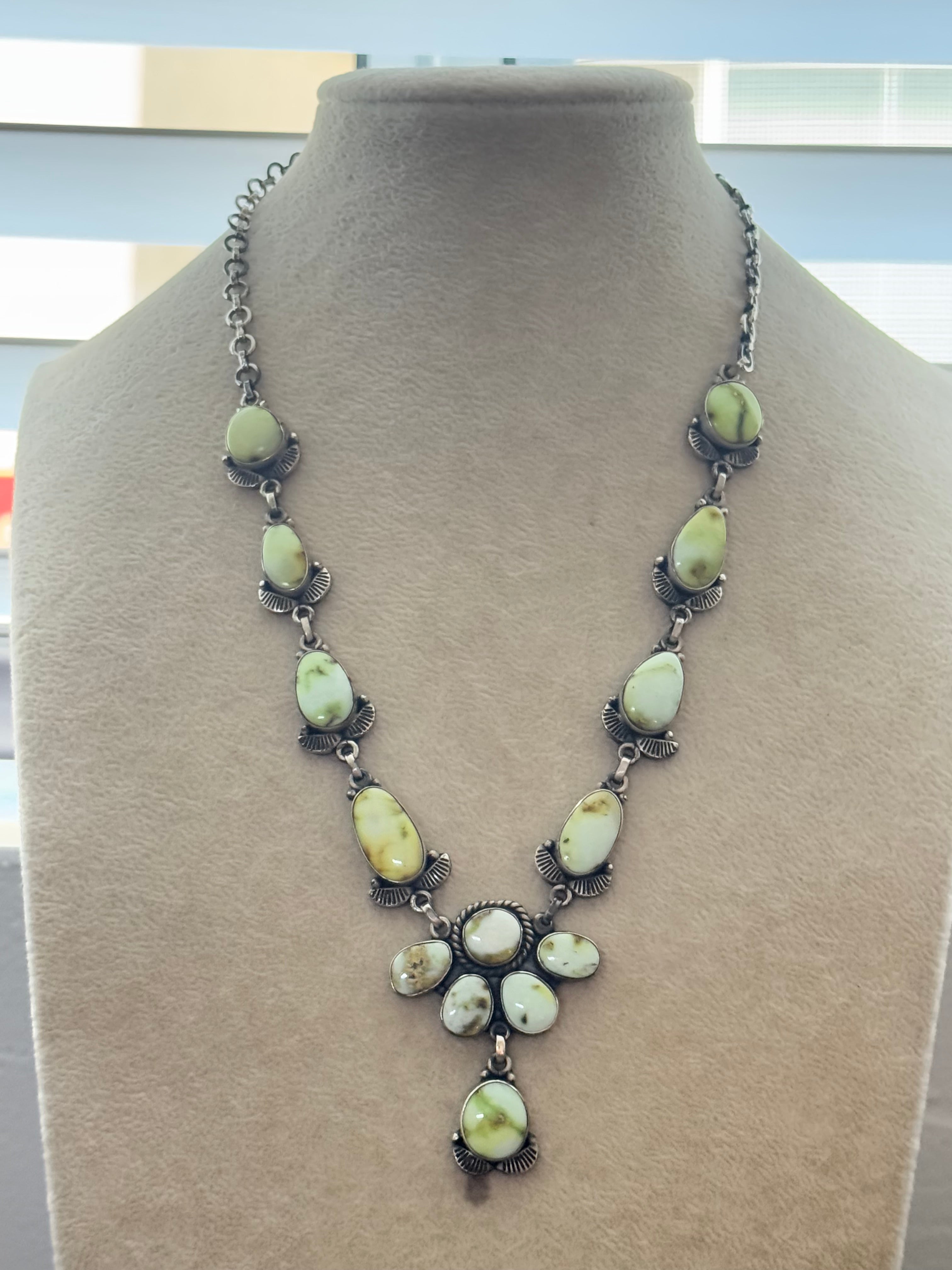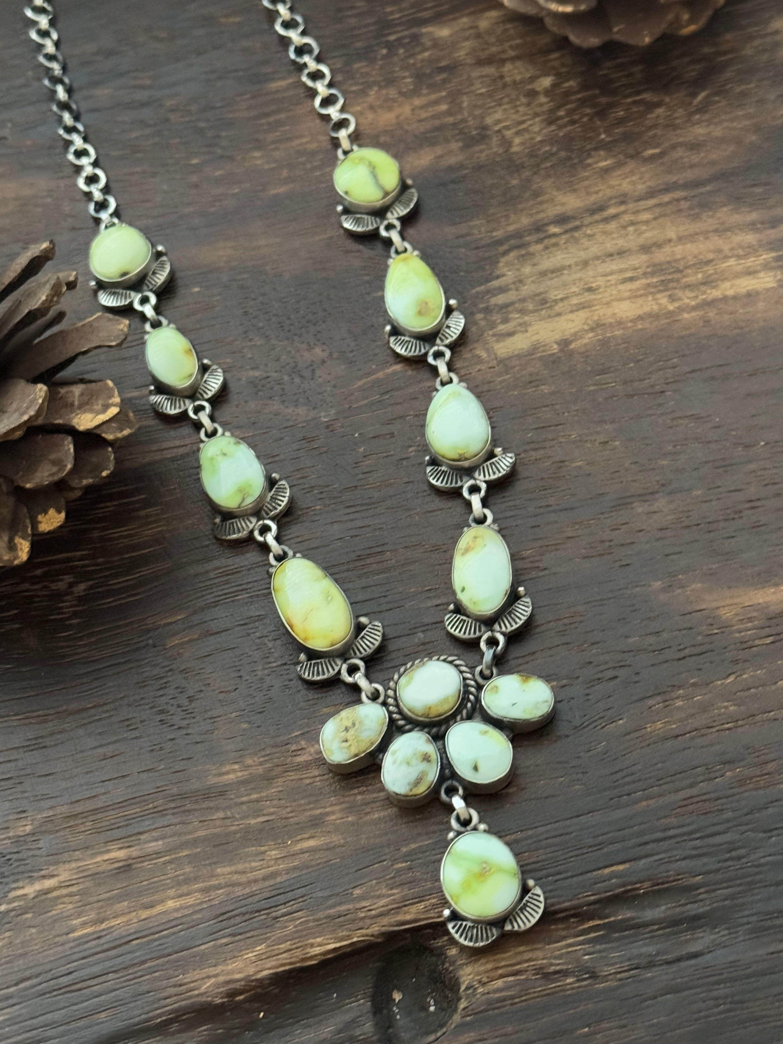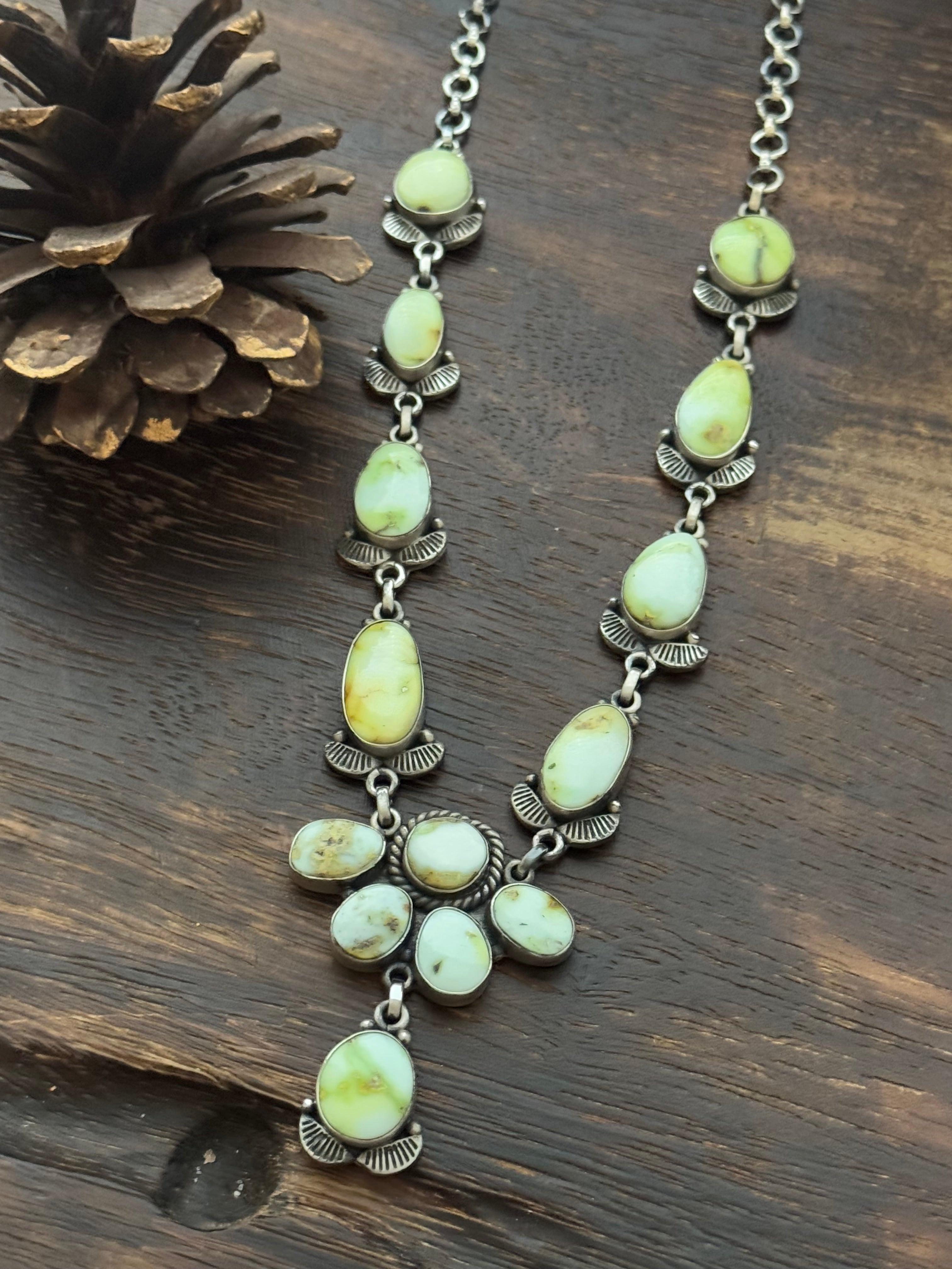 Beautiful Necklace. Southwest Made Palomino Variscite & Sterling Silver Necklace. It measures 22 1/2 inches long with hang while the chain measures 19 inches long. Signed by the artist and stamped sterling silver.