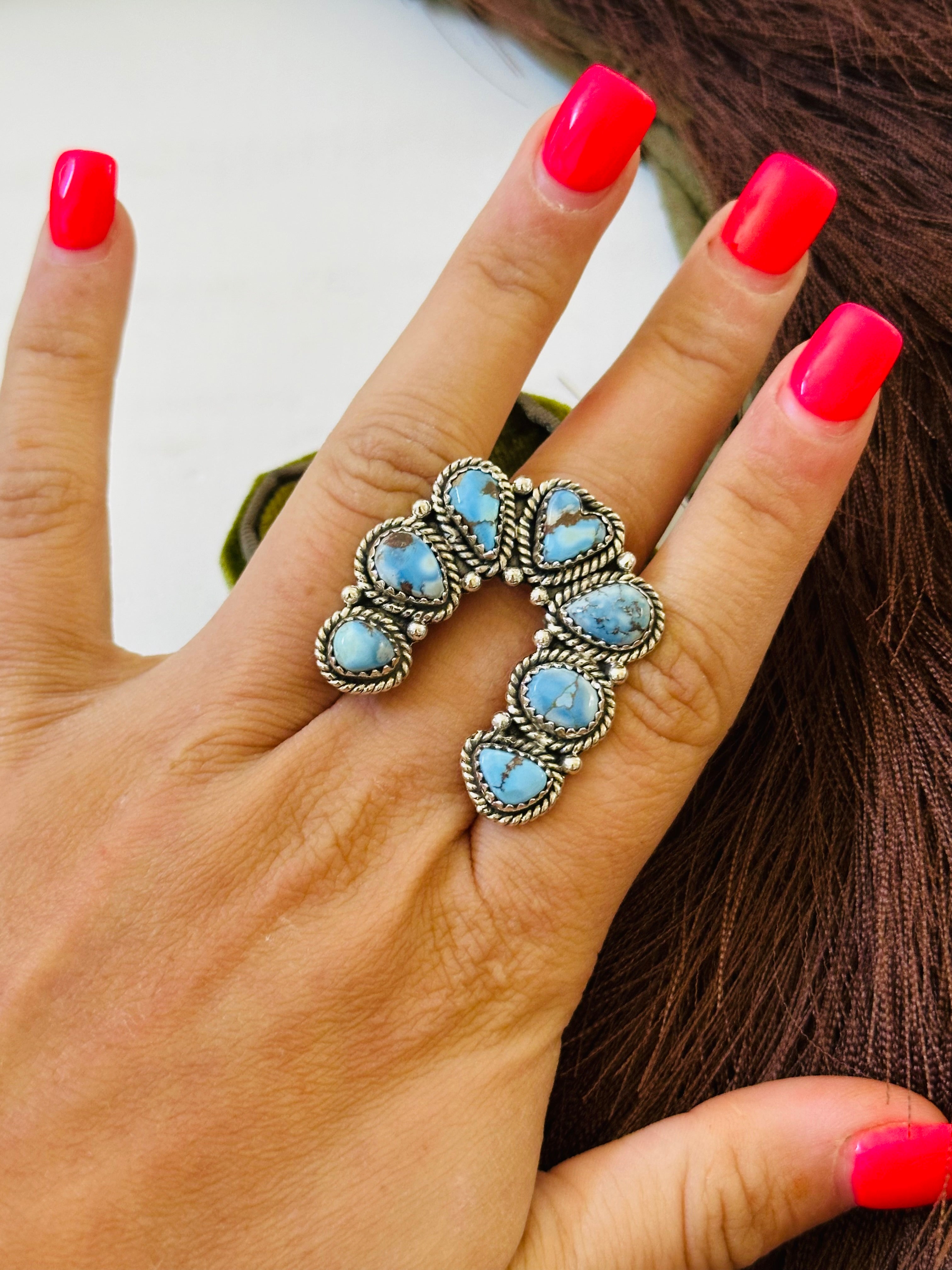 Beautiful naja ring. Southwest Handmade Golden Hills Turquoise & Sterling Silver Adjustable Cluster Naja Ring. It measures 1 1/2 inches long and 1 1/4 inches wide. Signed by the artist and stamped sterling silver.