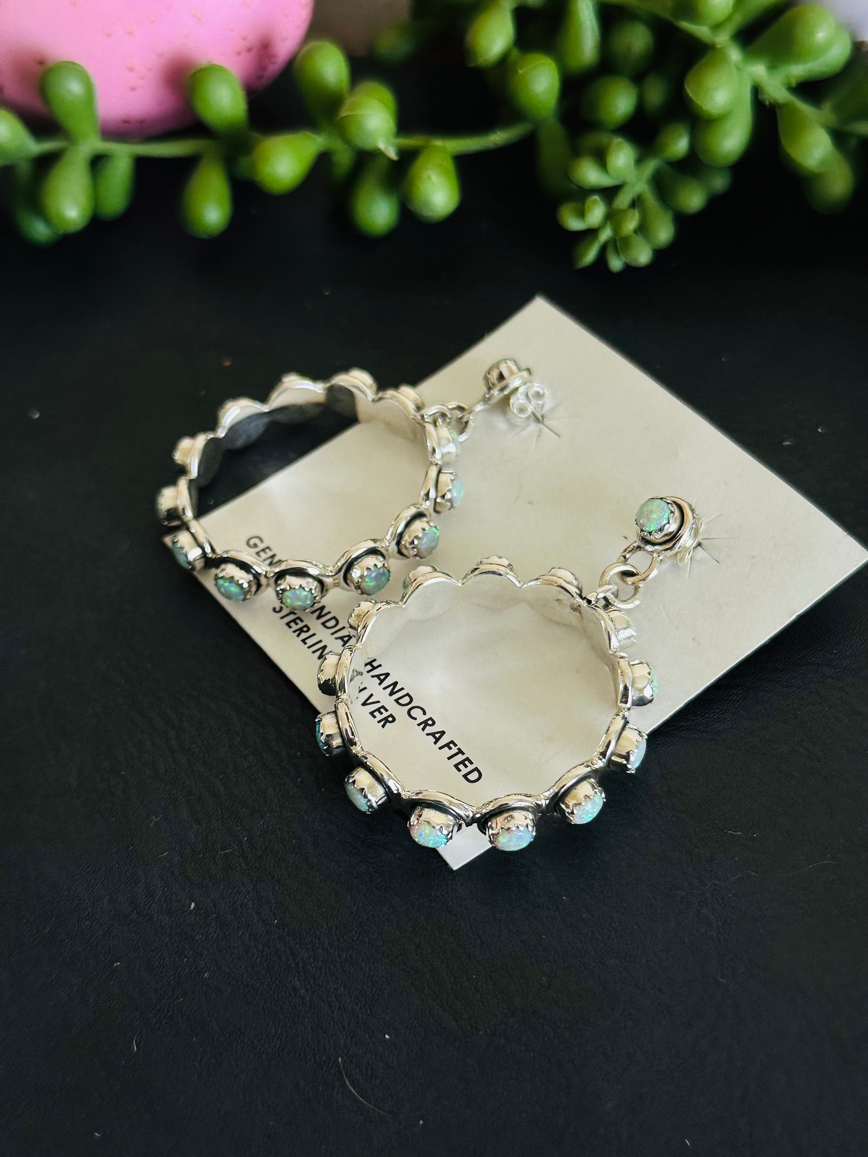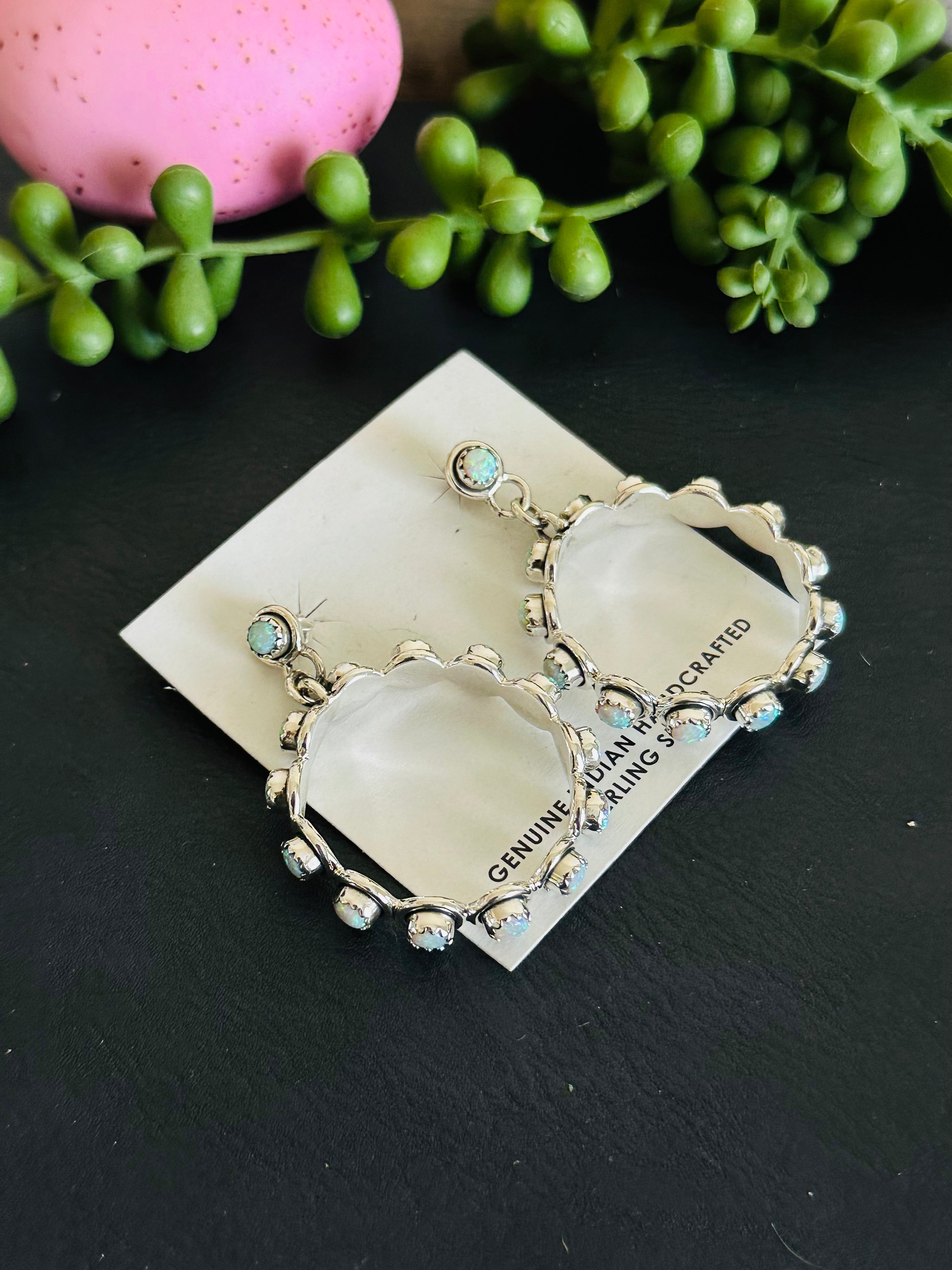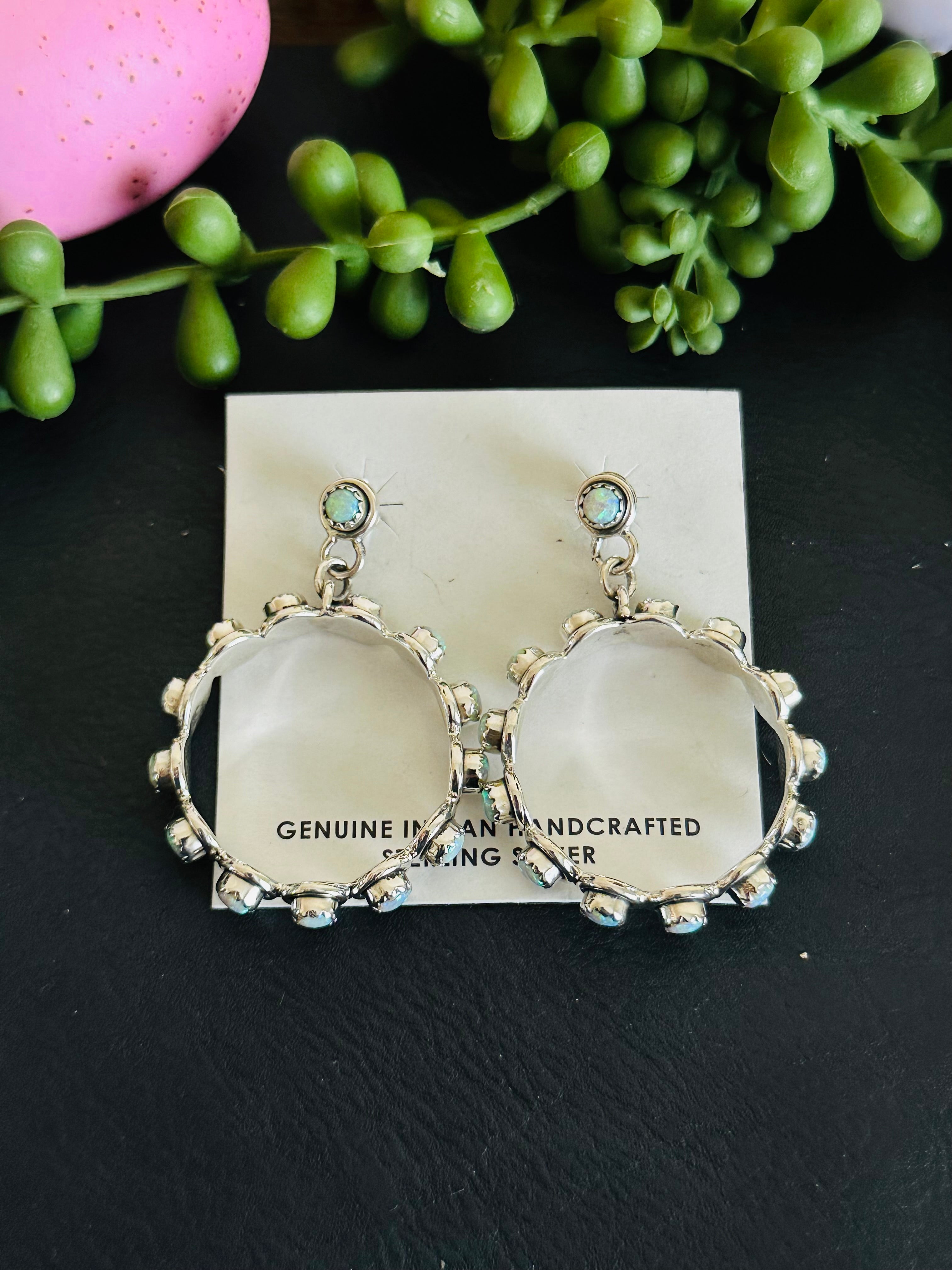 Adorable earrings. Southwest Handmade Opal & Sterling Silver Post Dangle Hoop Earrings. It measures 2 inches long and 1 1/2 inches wide. Signed by the artist and stamped sterling silver. Stones will differ due to natural stones.