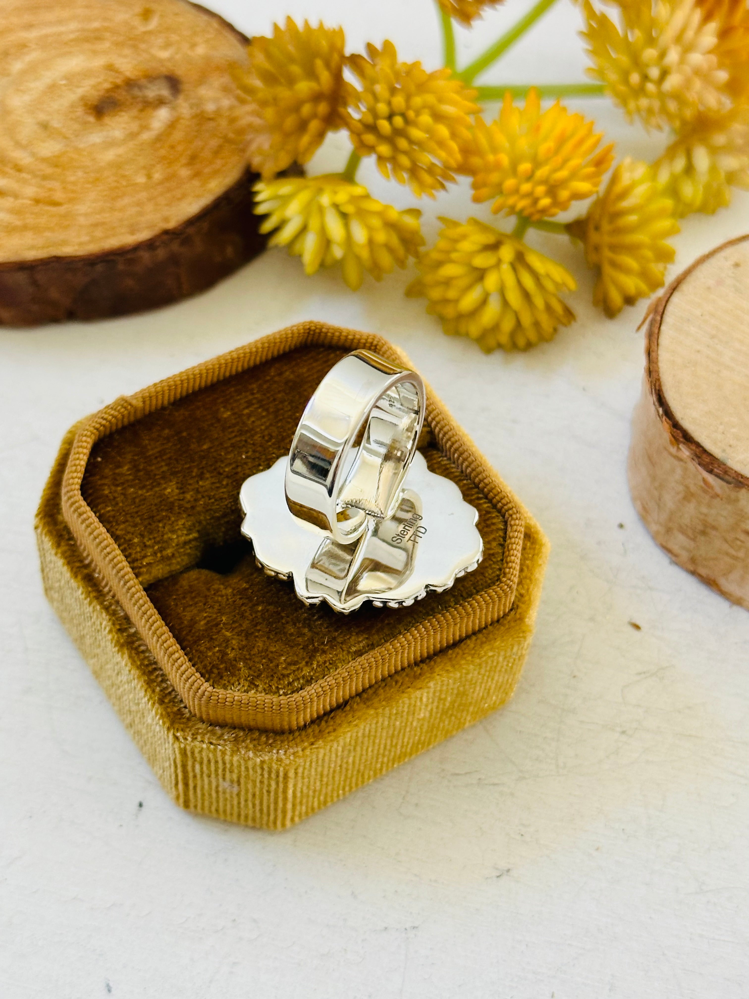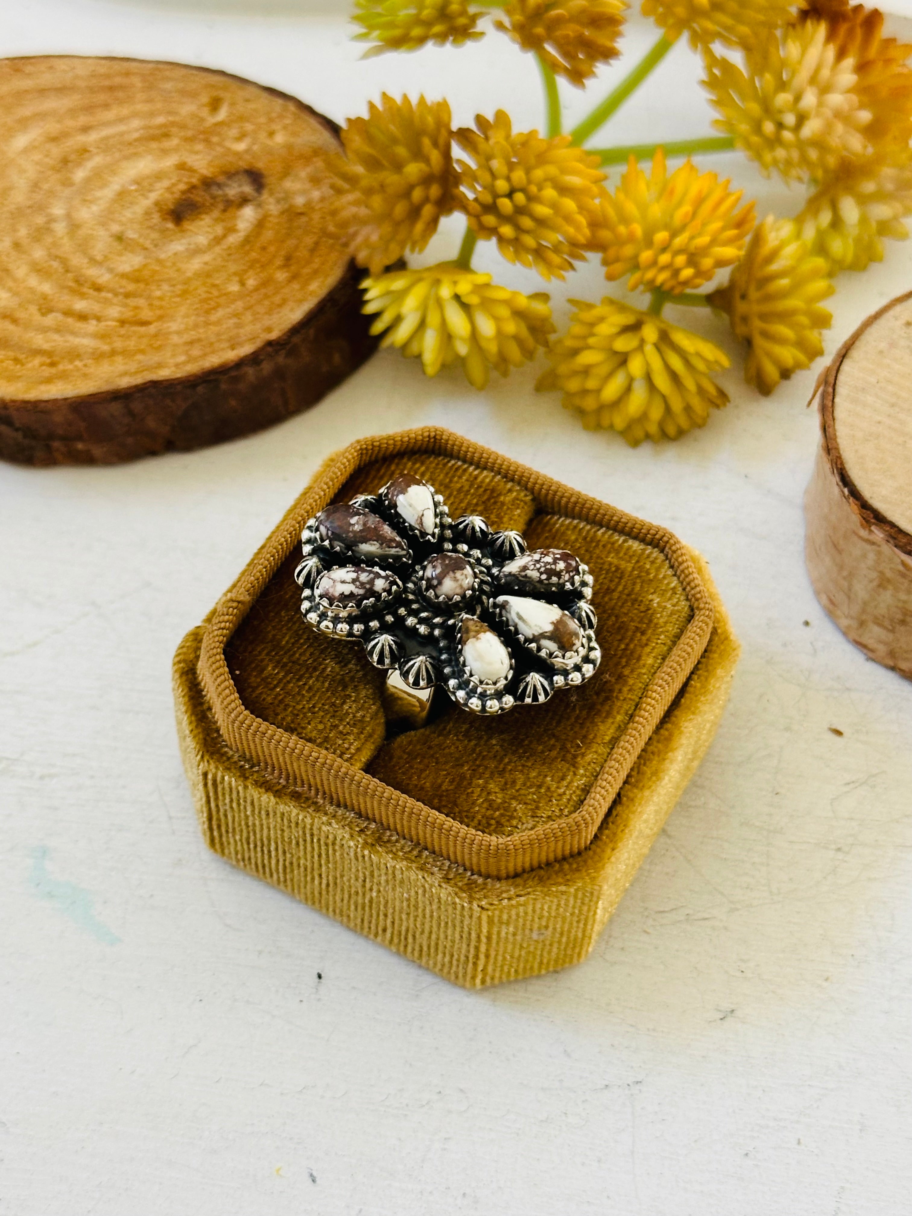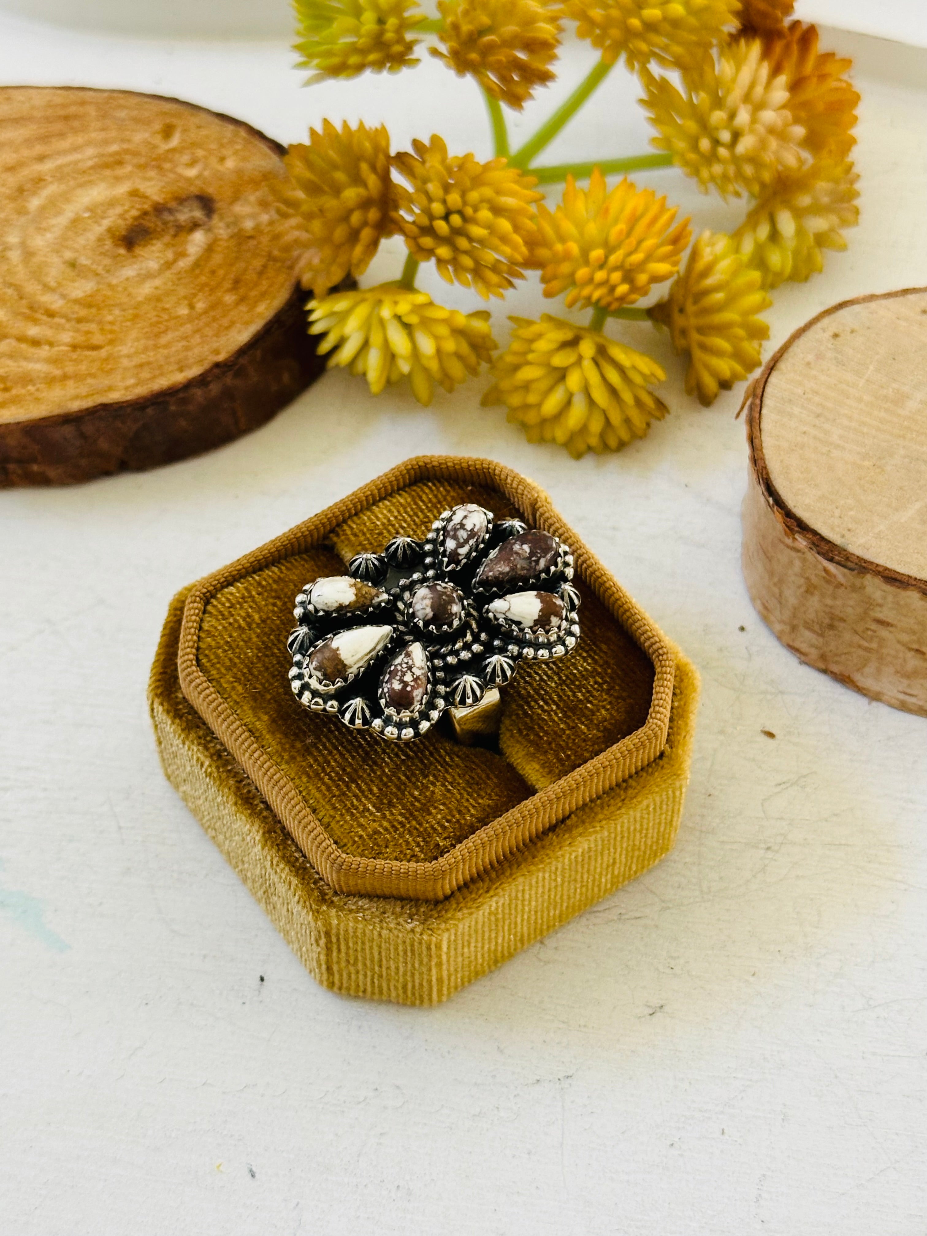 Beautiful ring. Southwest Handmade Wild Horse & Sterling Silver Adjustable Cluster Ring. It measures 1 1/4 inches long and 7/8 of an inch wide. Signed by the artist and stamped sterling silver. Stones will differ due to natural stones.