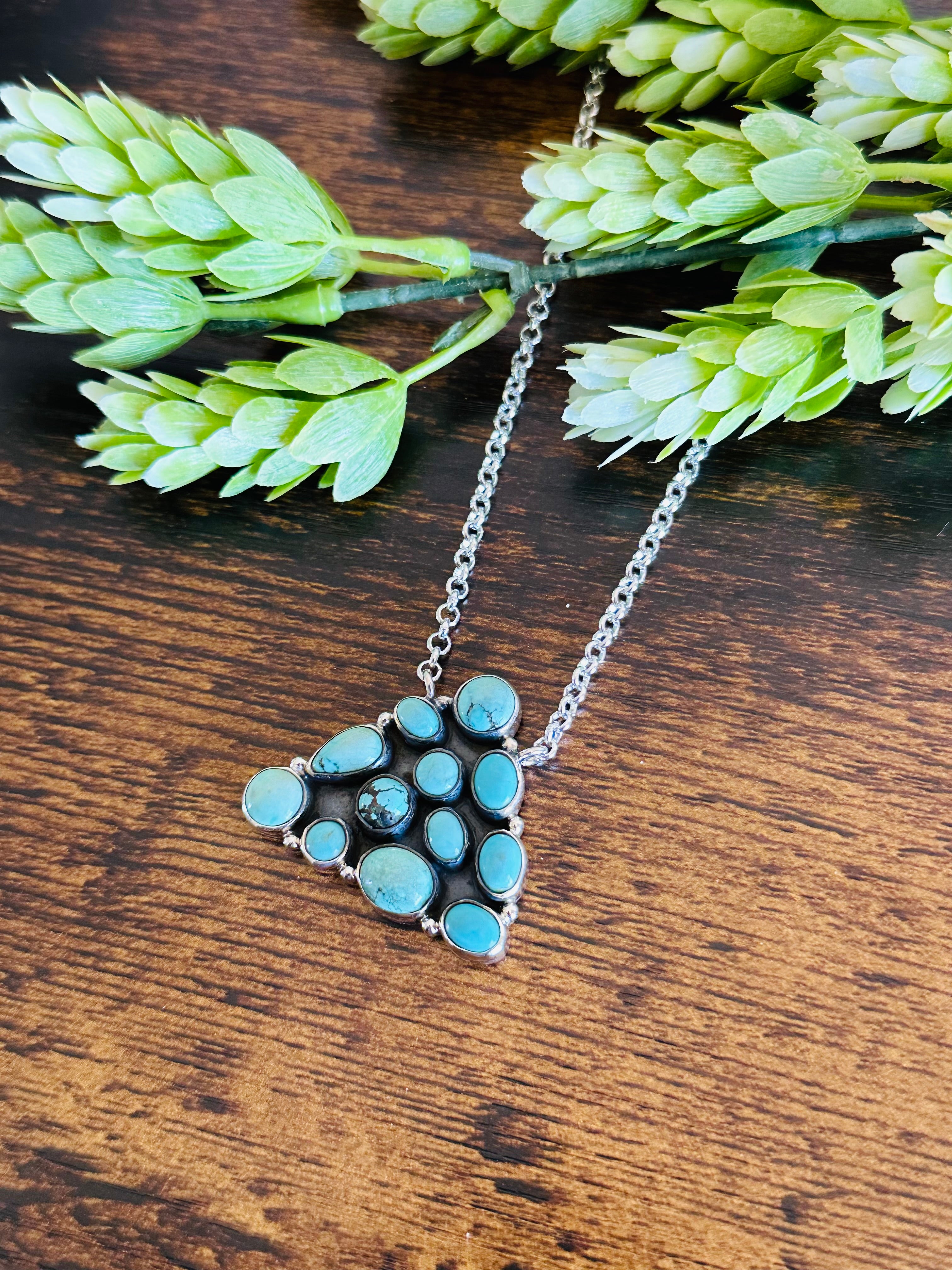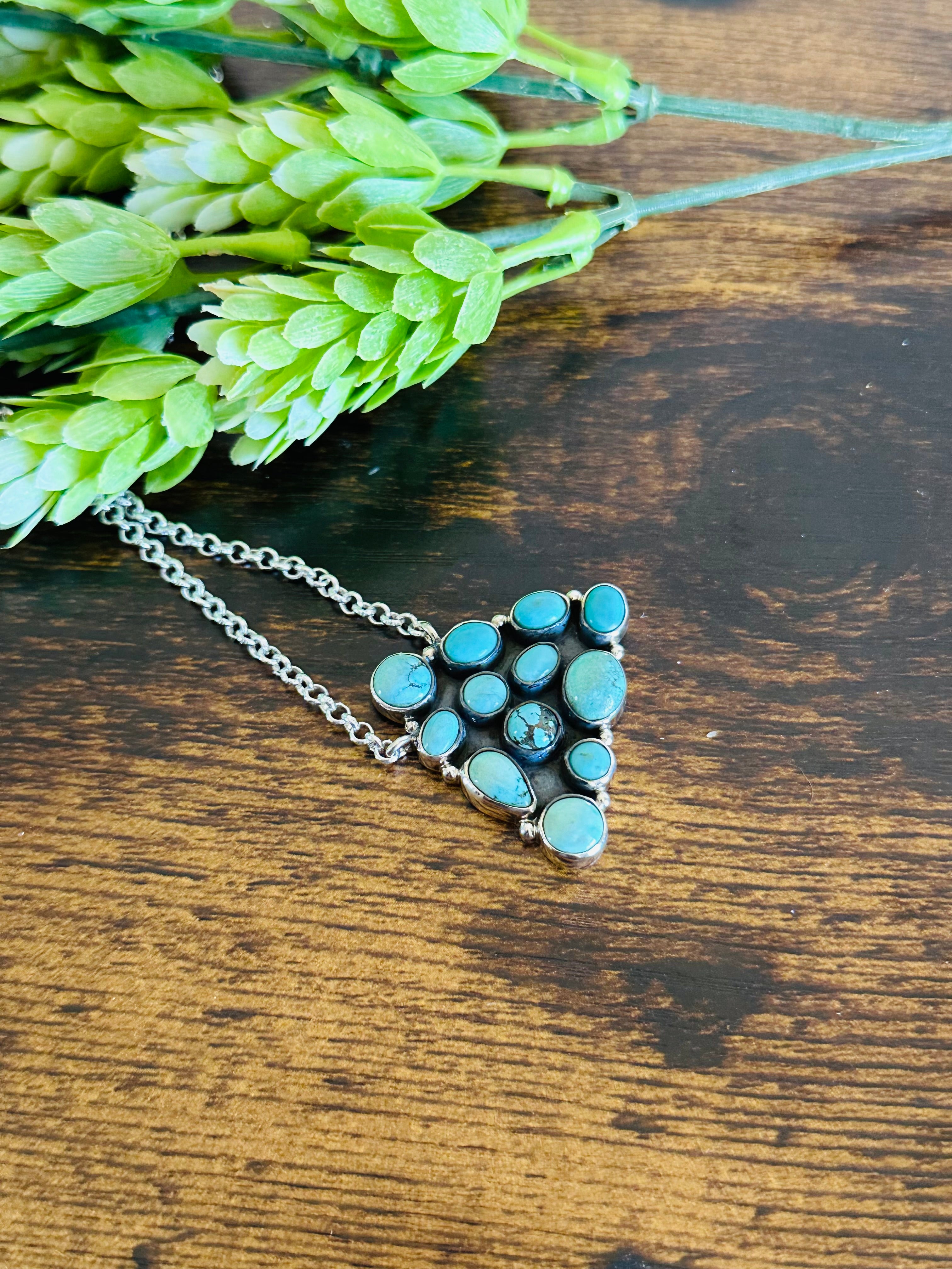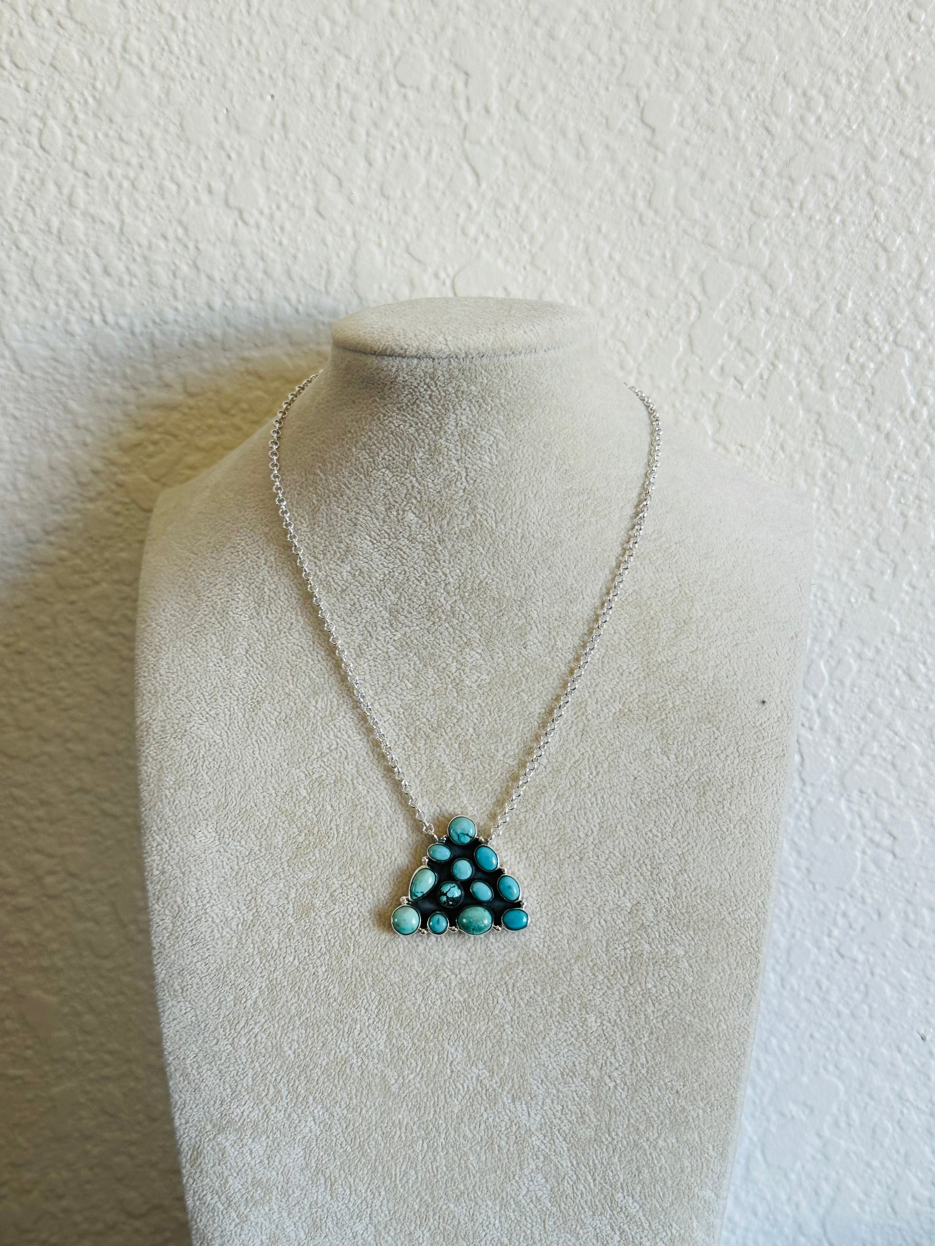 Beautiful necklace, great sterling around stone. Southwest Handmade Kingman Turquoise & Sterling Silver Cluster Necklace. It measures 20 inches long with hang while the chain by itself measures 17 inches long but can adjust down to 15 inches long. Signed by the artist and stamped sterling silver. Stones will differ in shape and color due to natural stones.