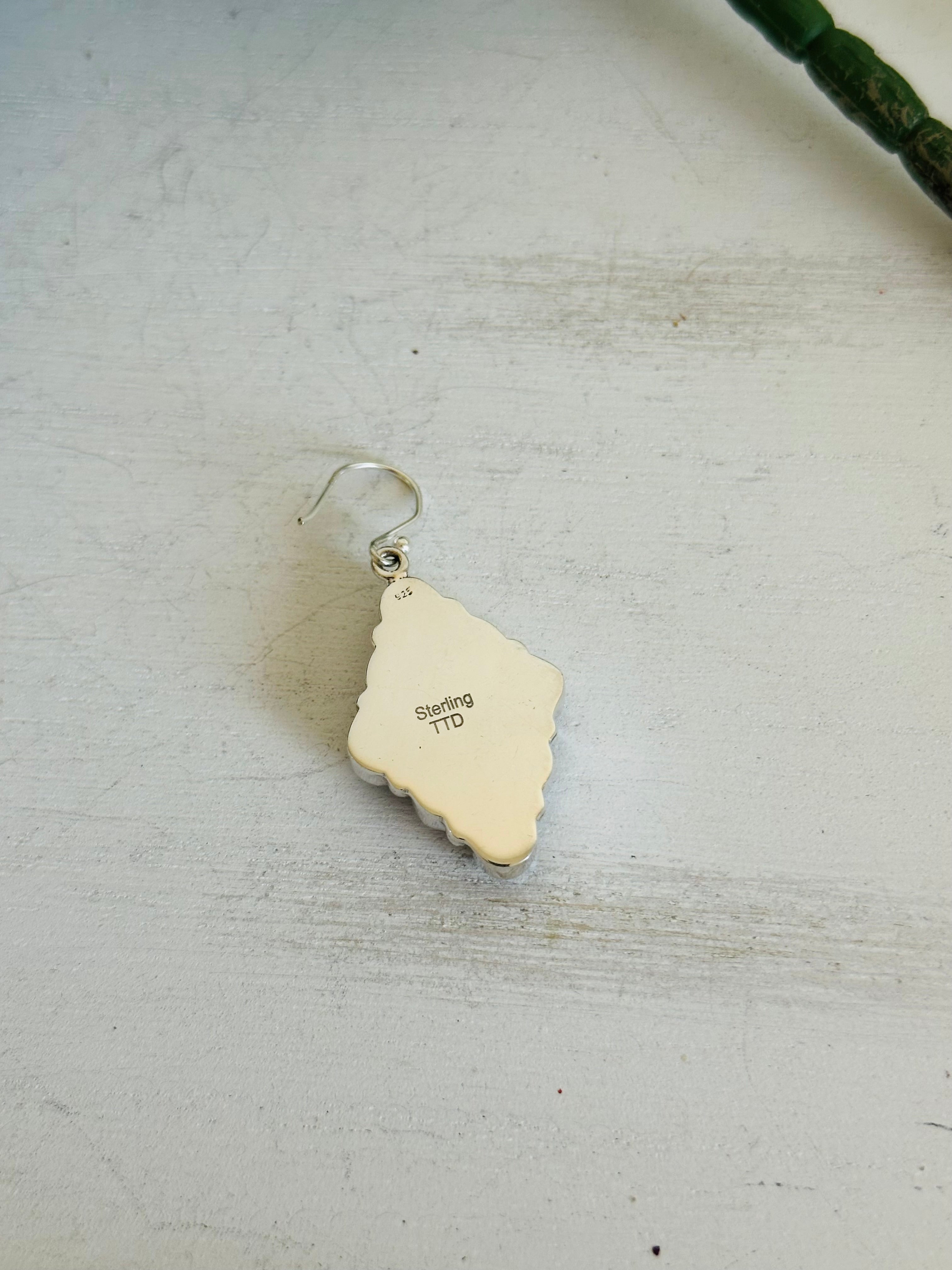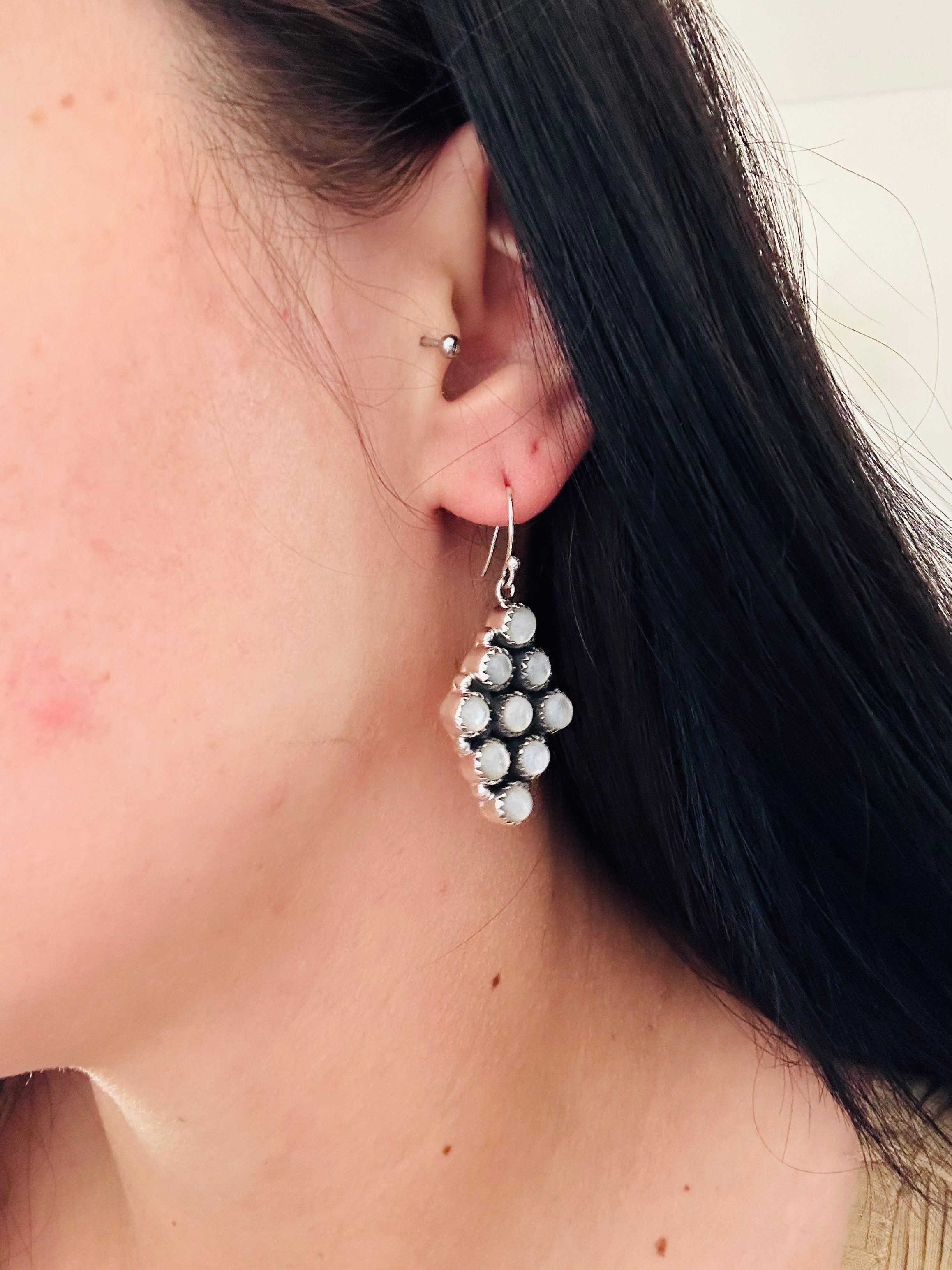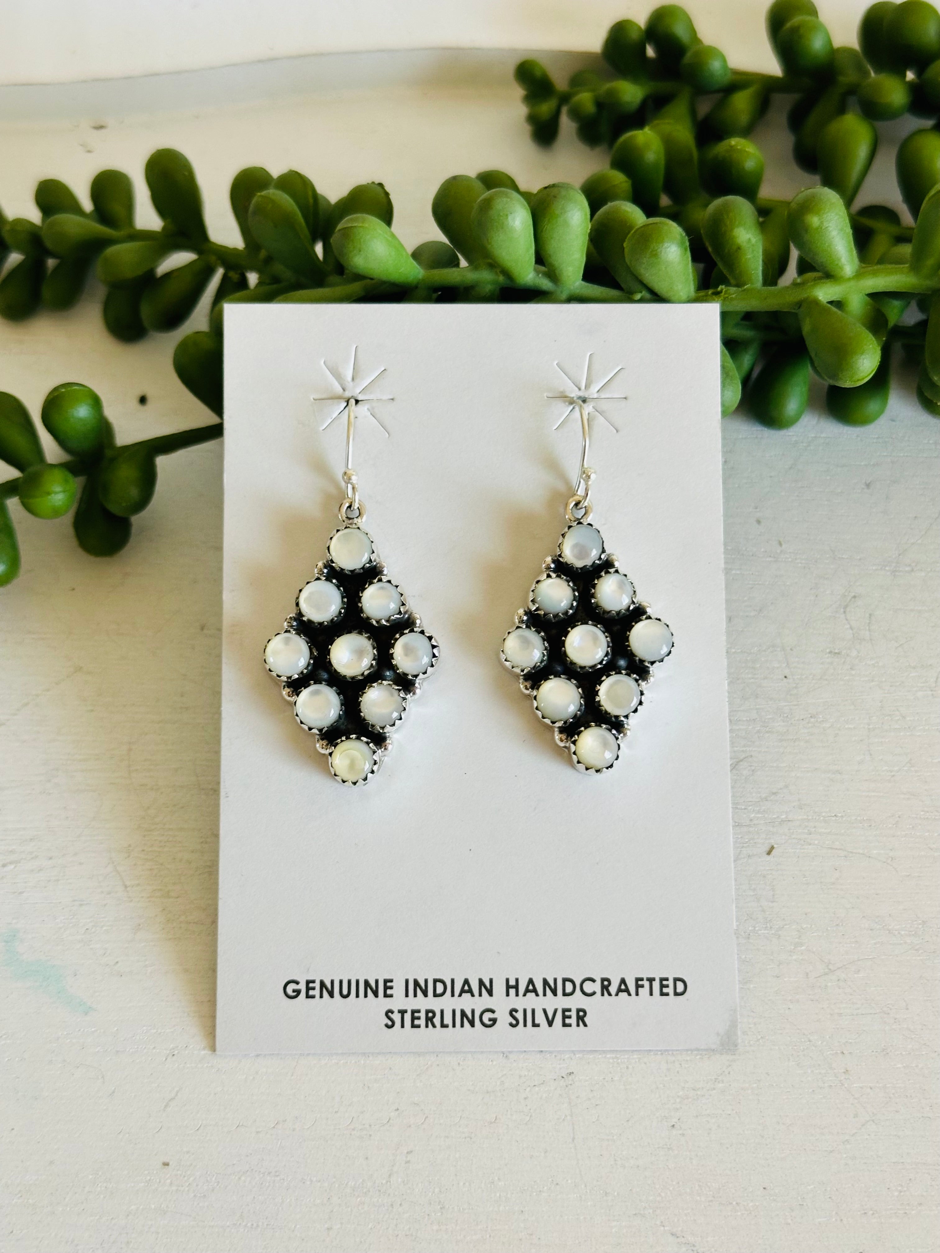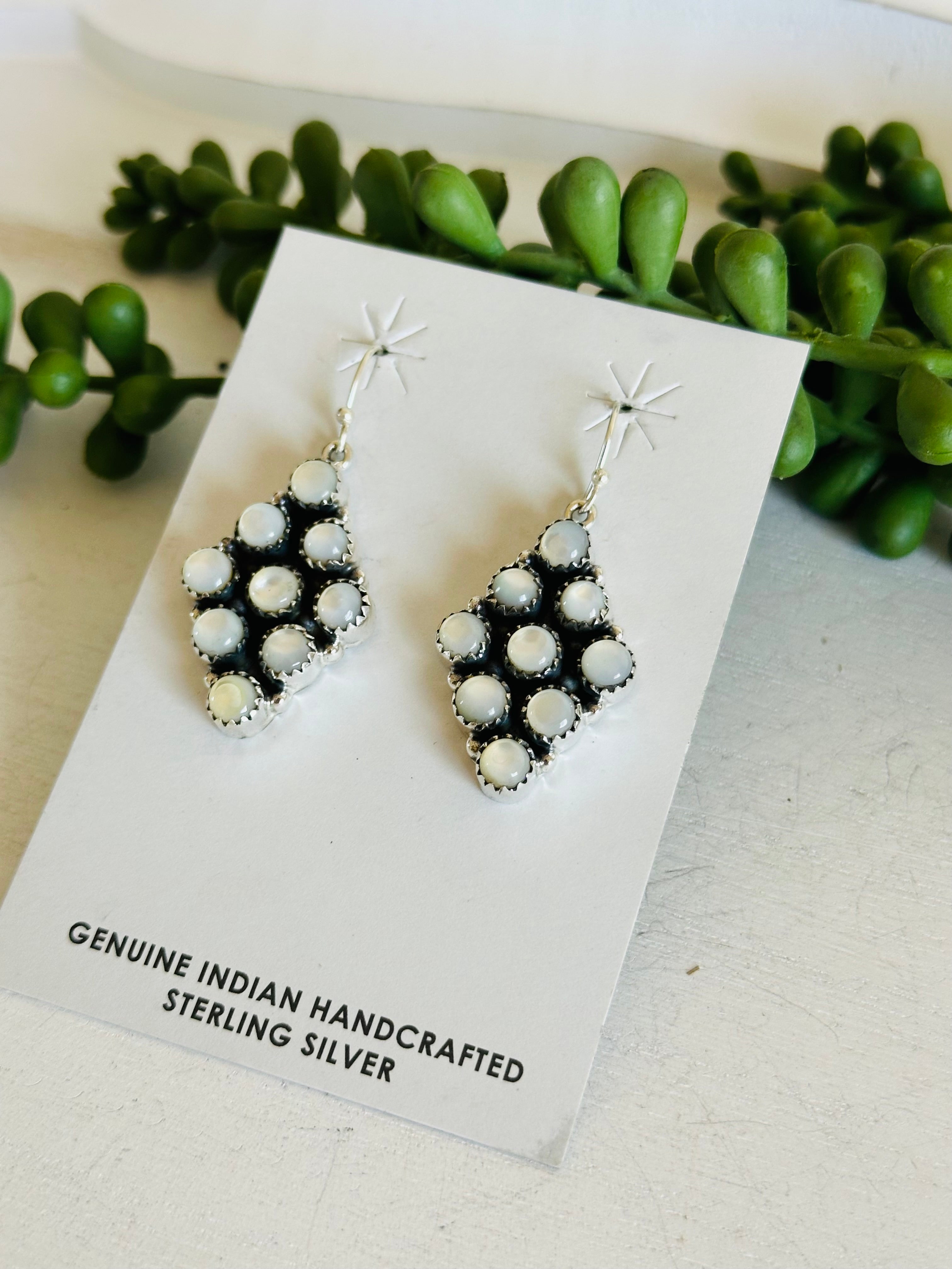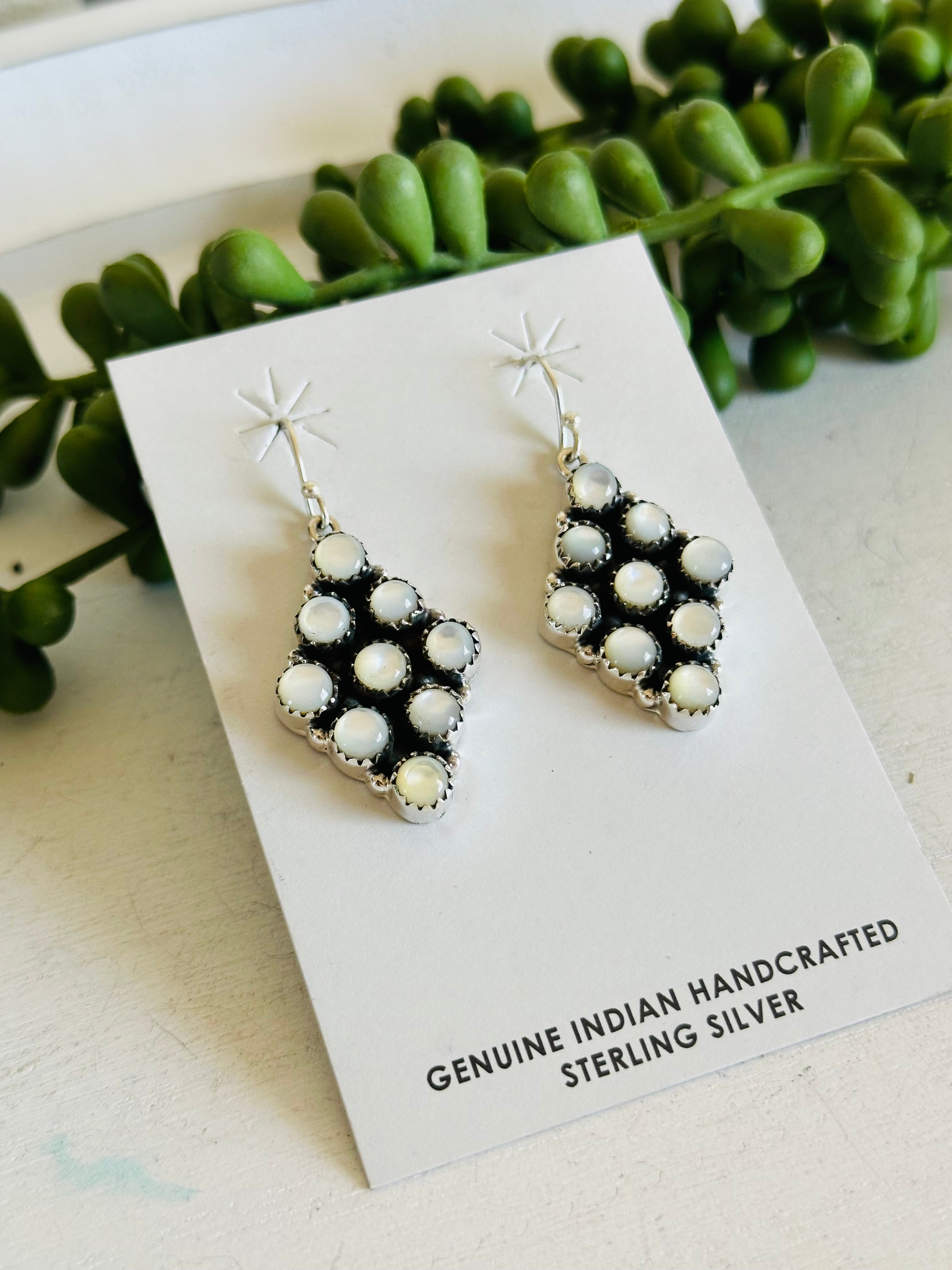 Adorable earrings. Southwest Handmade Mother of Pearl & Sterling Silver Dangle Cluster Earrings. It measures 1 5/8 inches long and 1 inch wide. Signed by the artist and stamped sterling silver. Stones will differ due to natural stones.