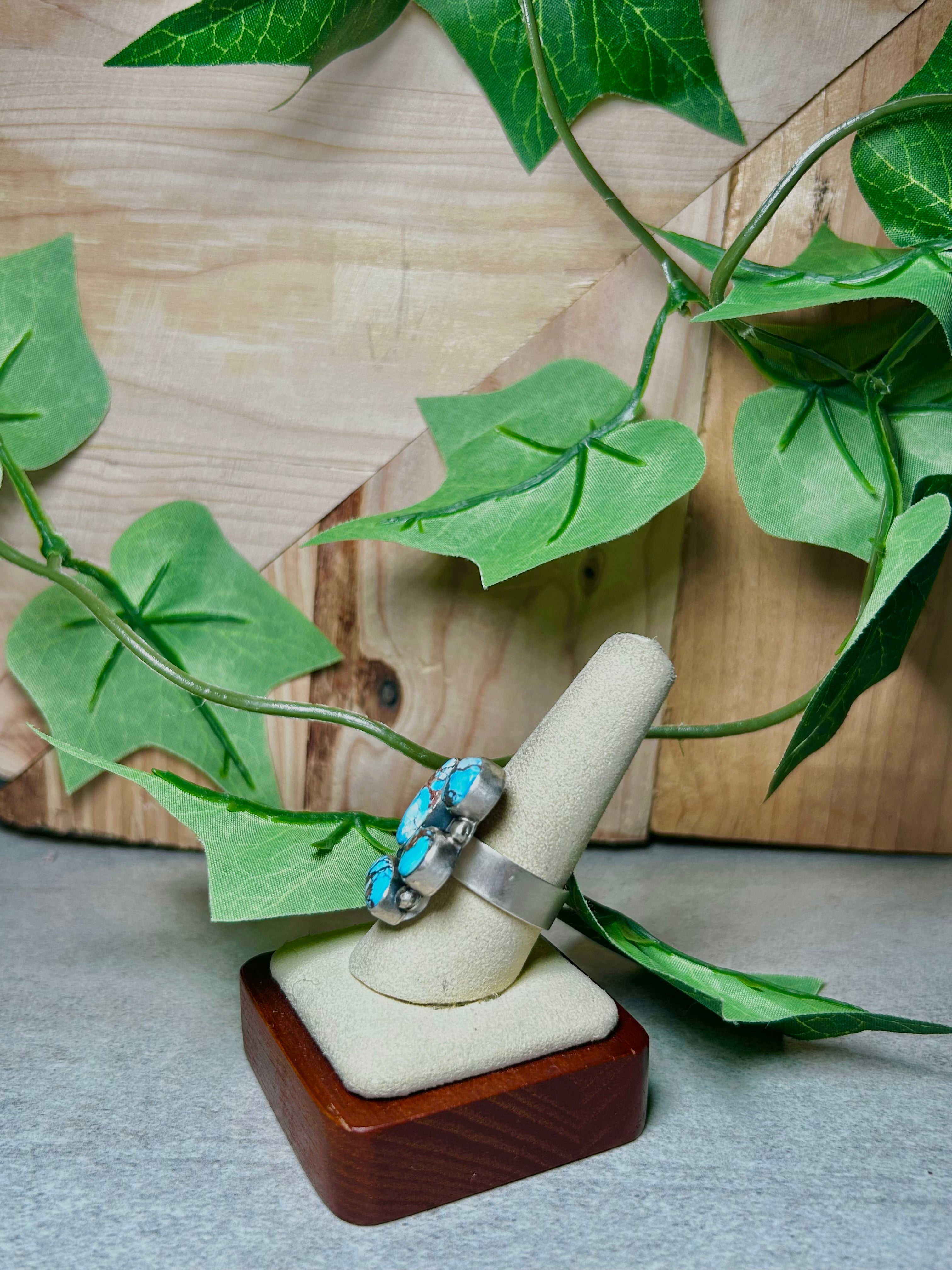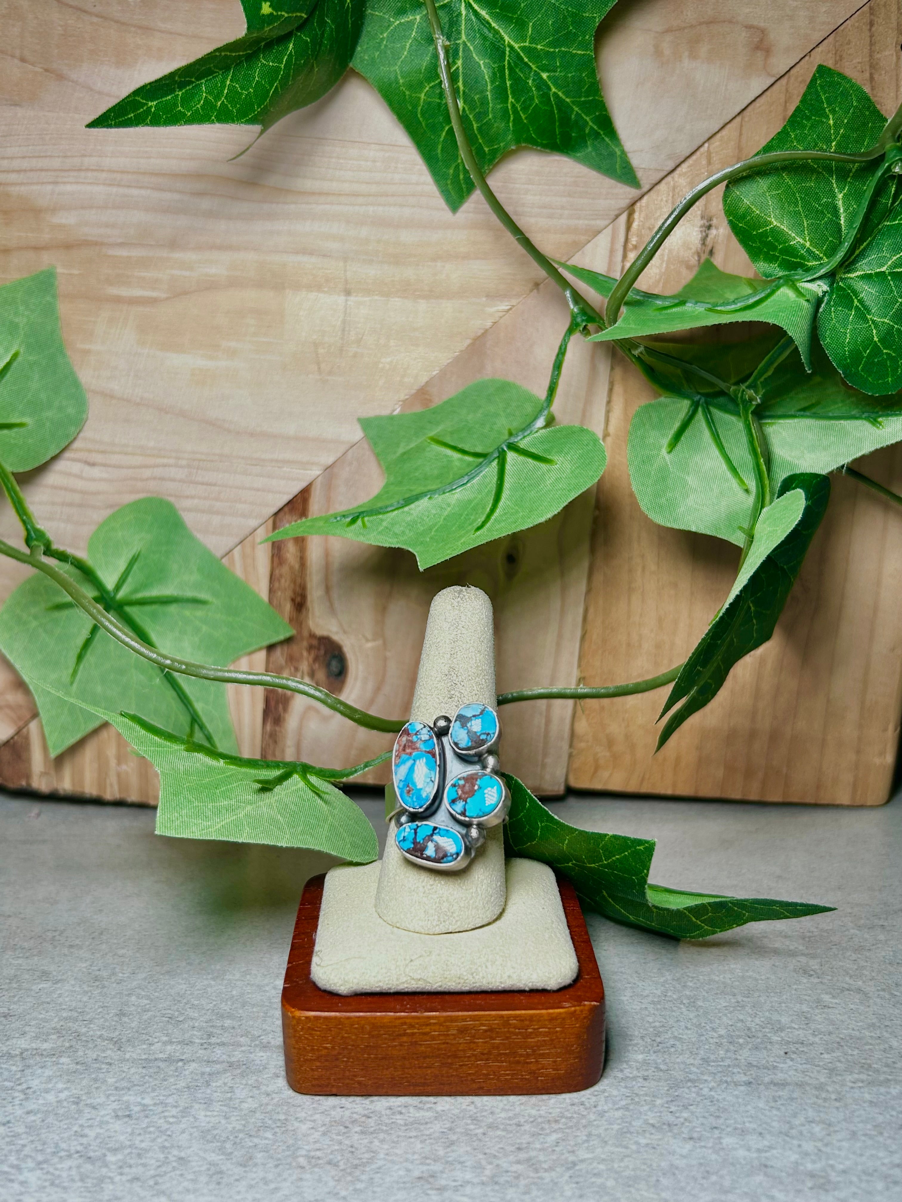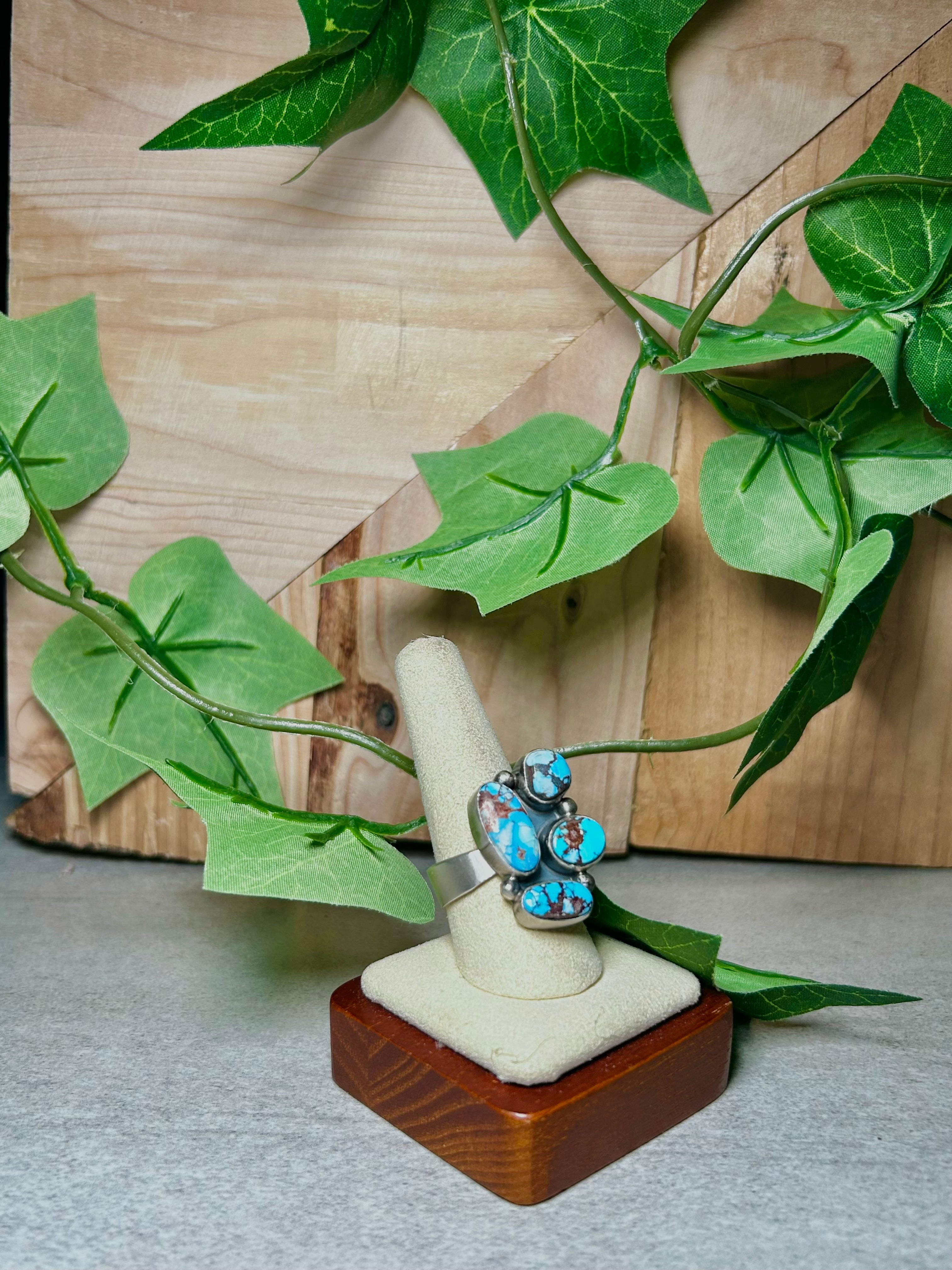 Jameson Garcia Golden Hill’s Turquoise & Sterling Silver Adjustable Ring. It measures 1 1/8 inches long and 3/4 of an inch wide. Signed by the artist and stamped sterling silver.