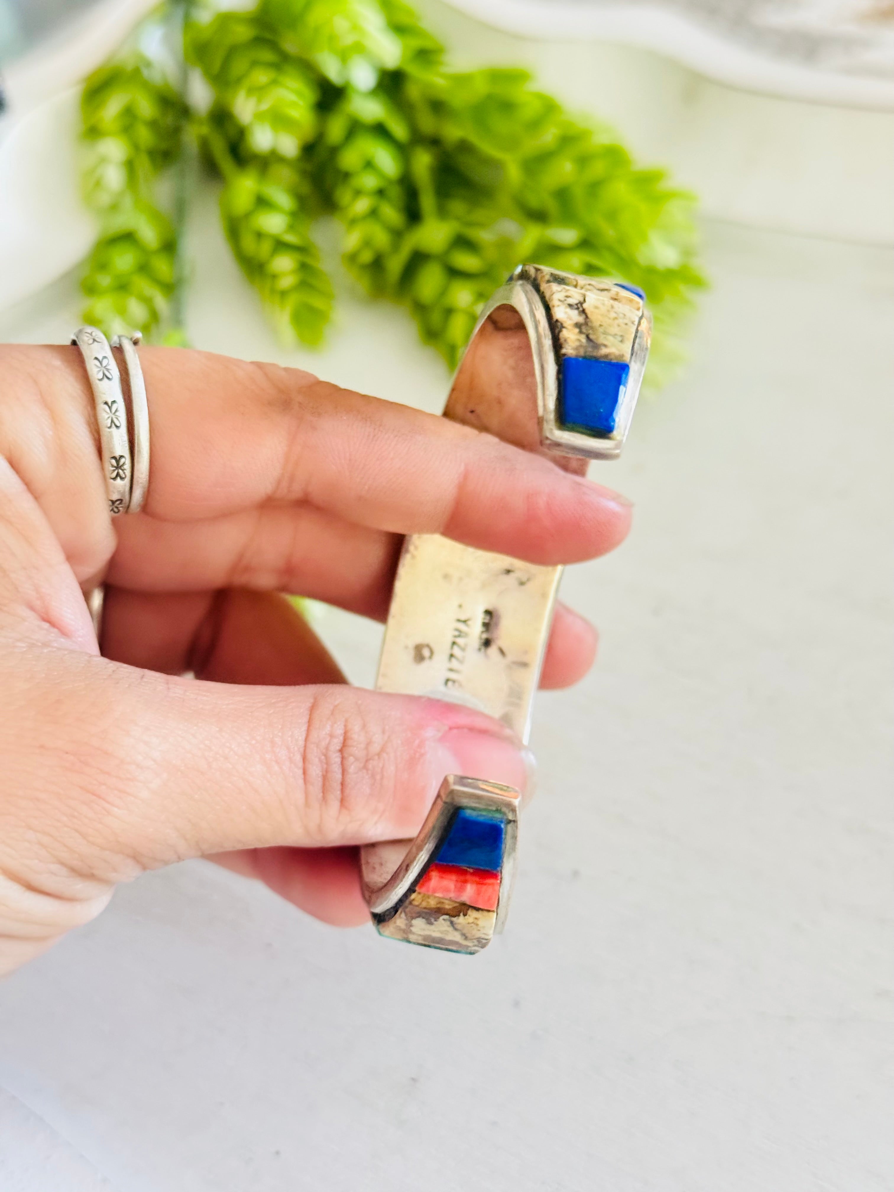 Vintage Edison Yazzie Multi Stone & Sterling Silver Cobblestone Cuff Bracelet. It measures 3/4 of an inch wide with an inside circumference of 5 3/4 inches and a gap of 1 3/8 inches. Signed by artist and stamped sterling silver.