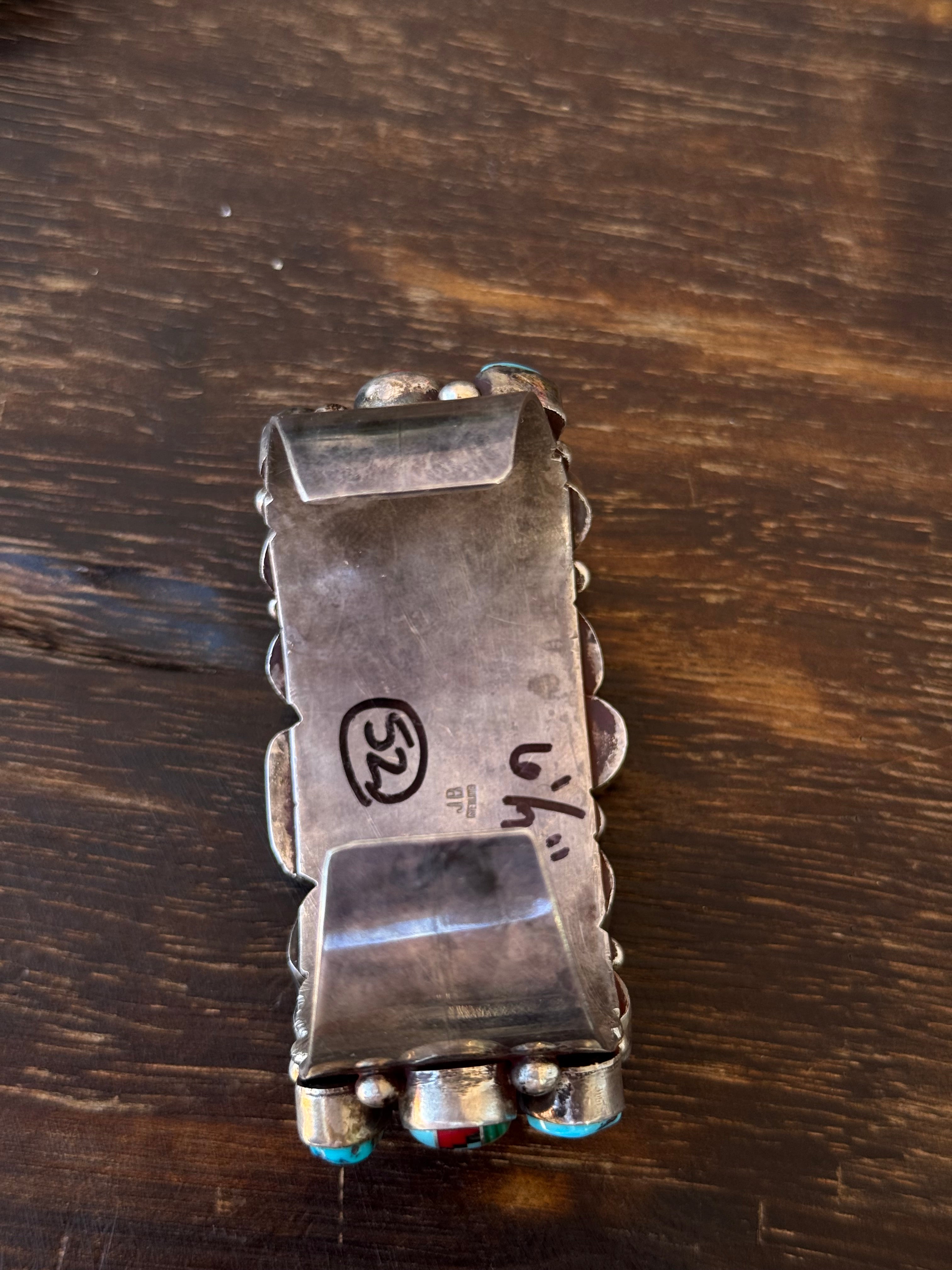 Vintage Jack Bly Multi Stone & Sterling Silver Inlay Cuff Bracelet. It measures 1 5/8 inches wide with an inside circumference of 5 1/2 inches and a gap of 1 1/4 inches. Signed by artist and stamped sterling silver.