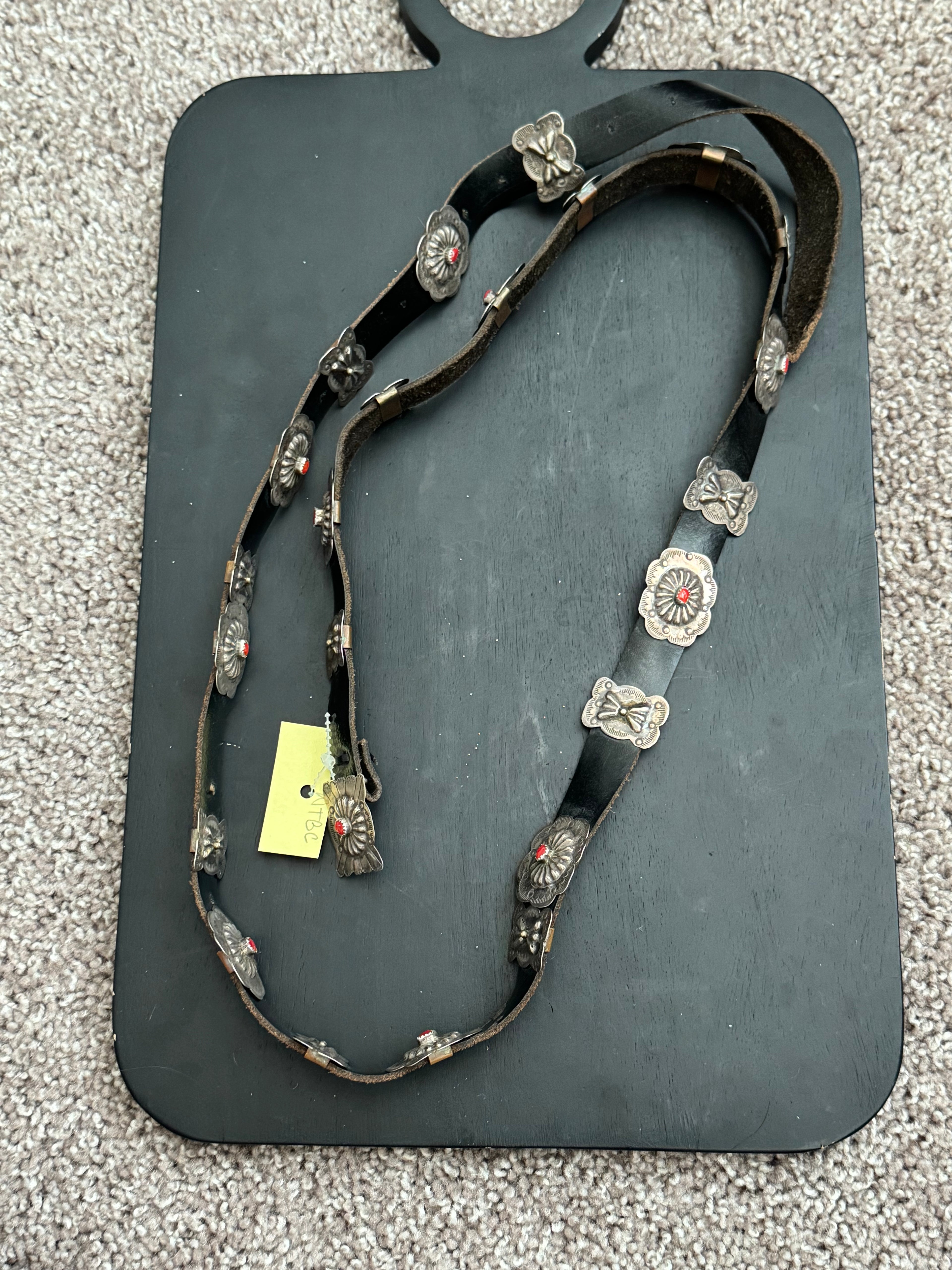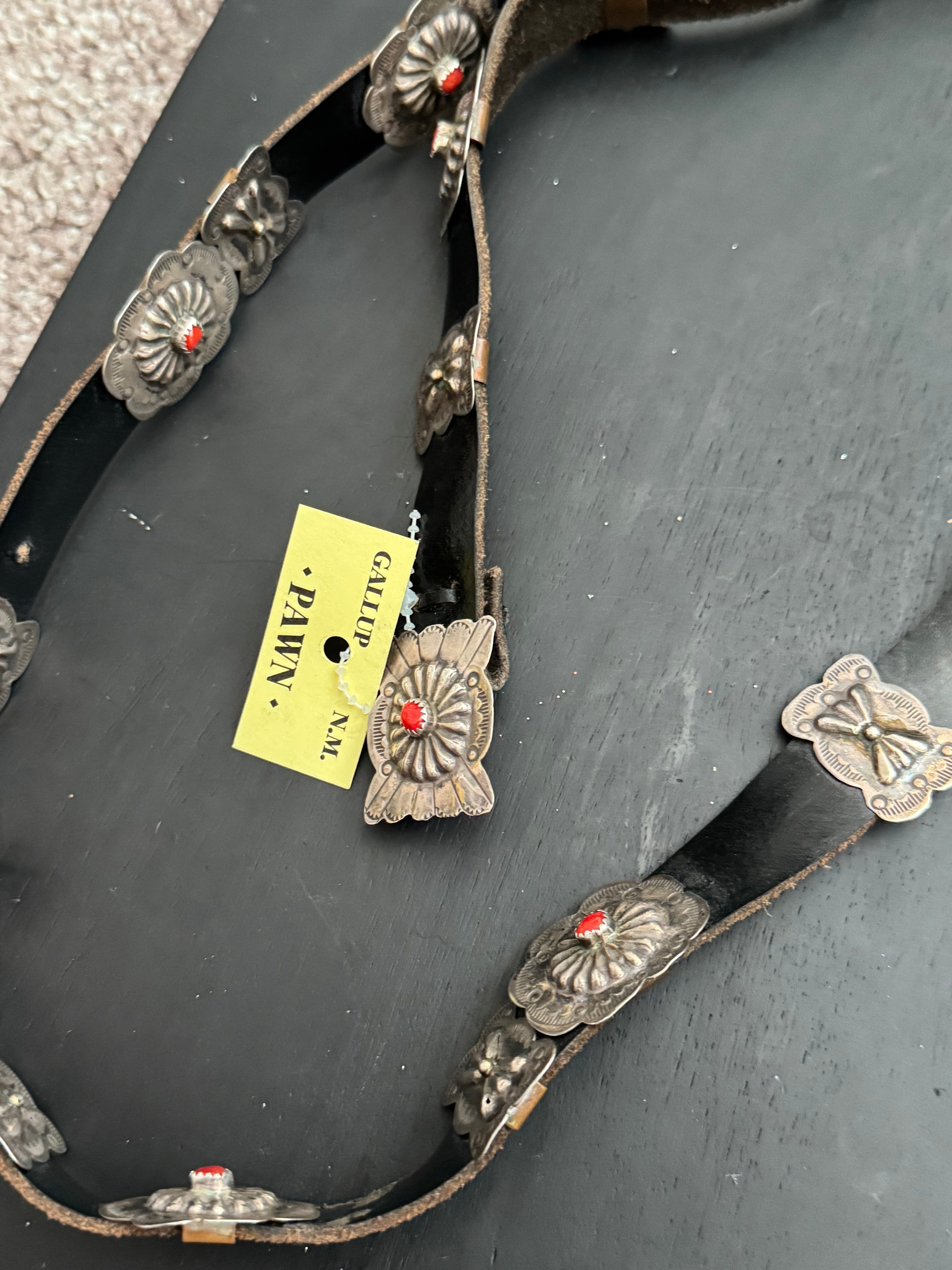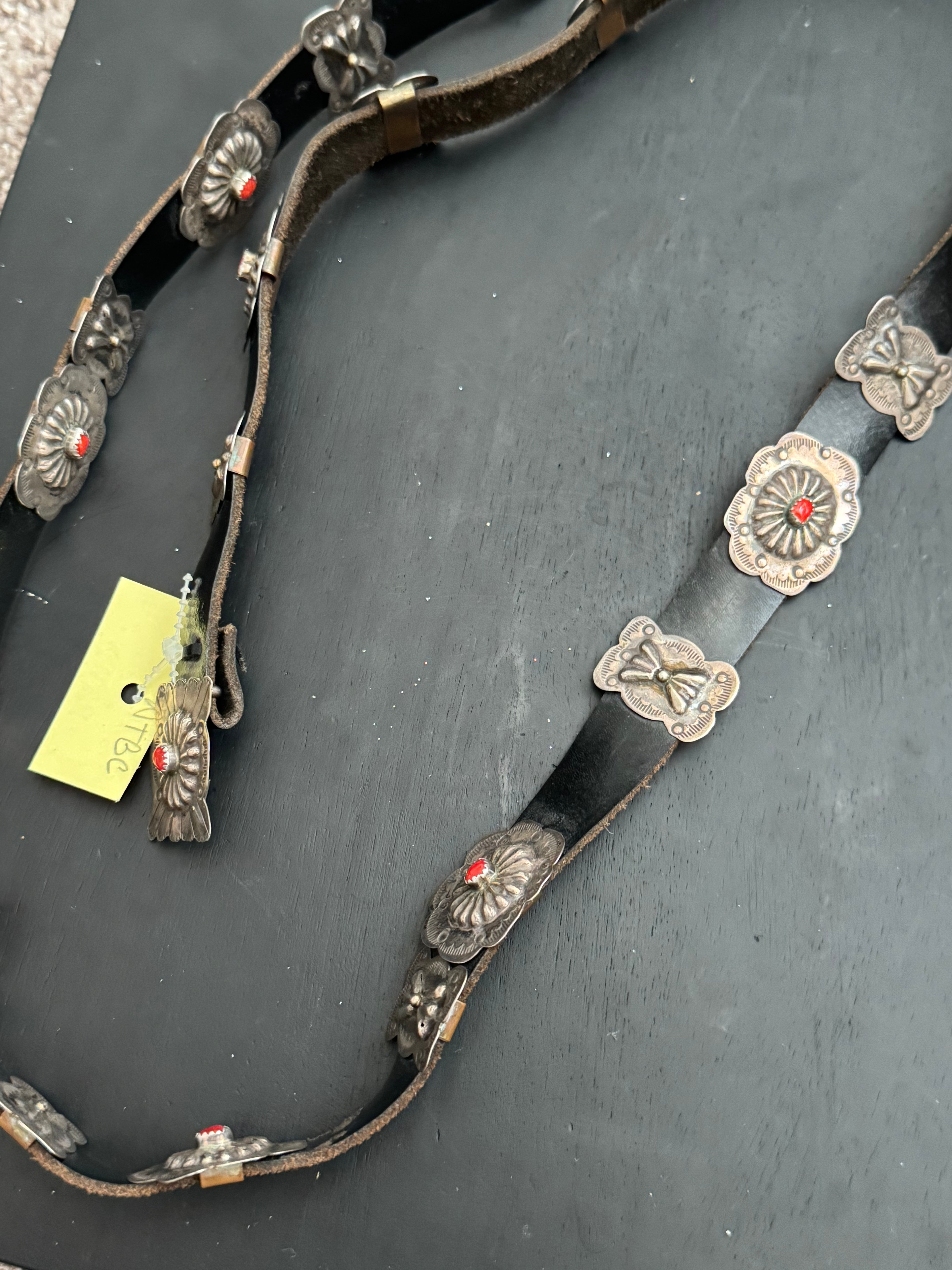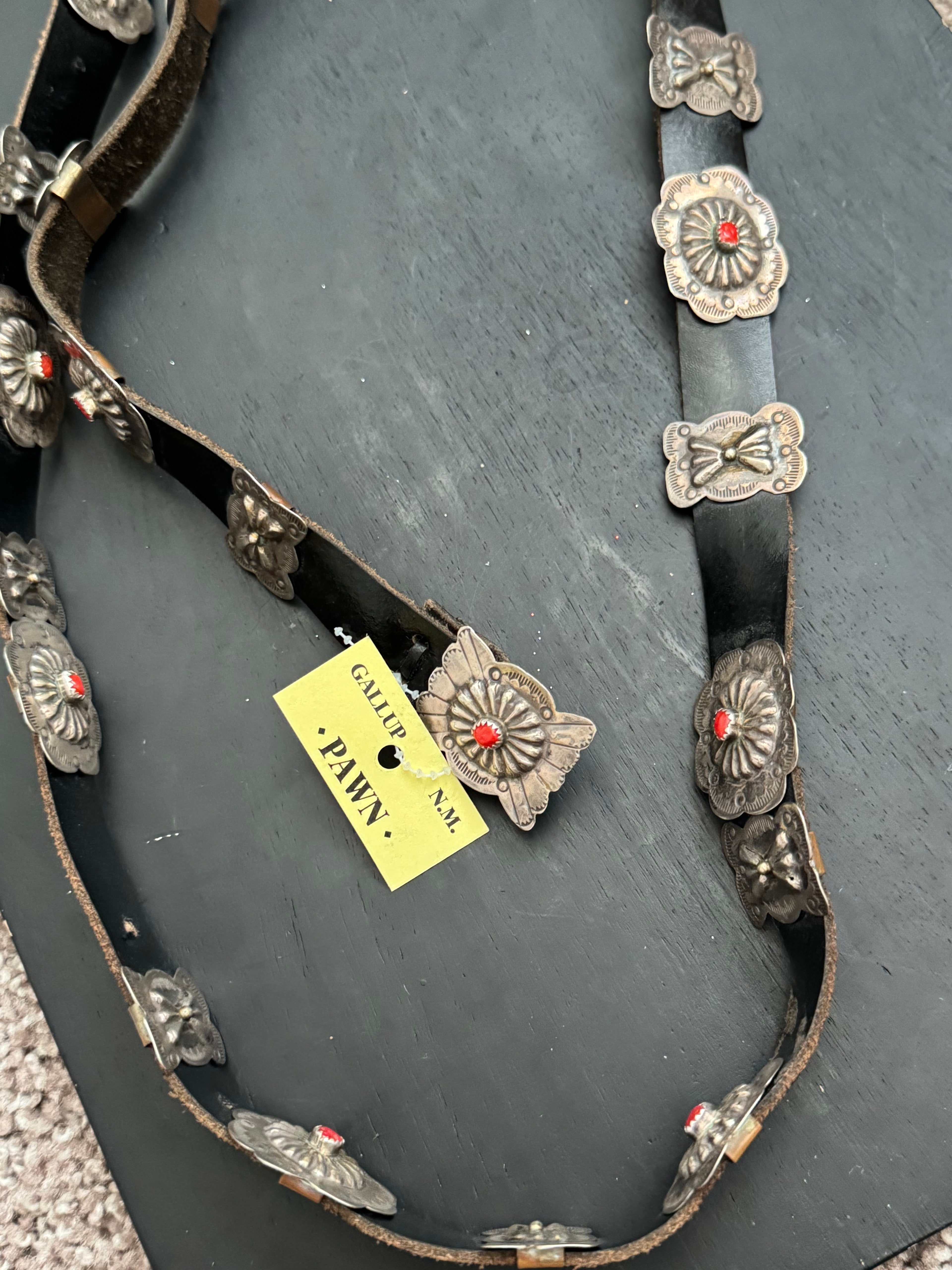 OLD PAWN Vintage Navajo Made Coral & Sterling Silver Concho Belt. It measures 50 inches long while the conchos are 1 1/2 inches long and 1 1/8 inches wide.