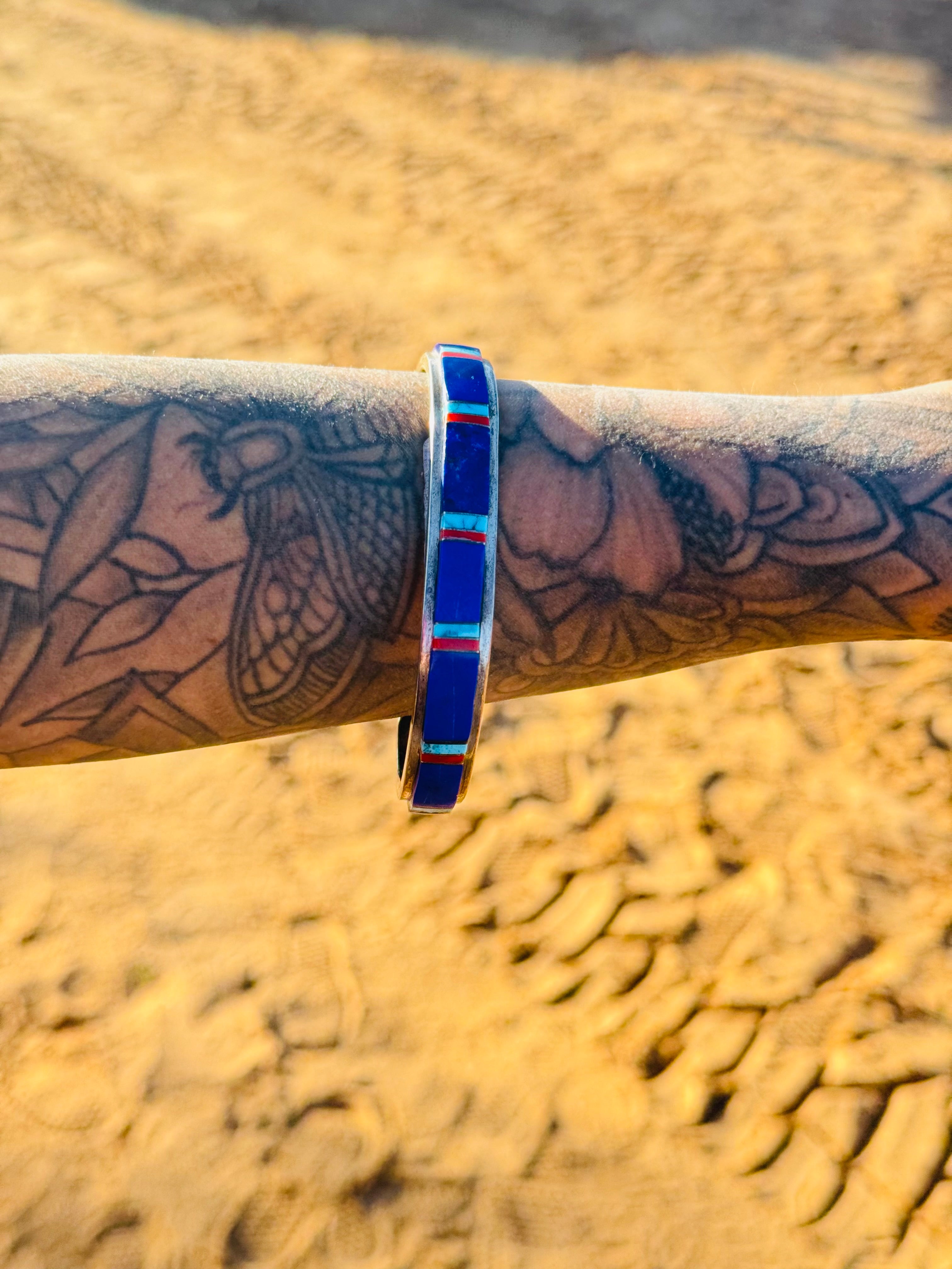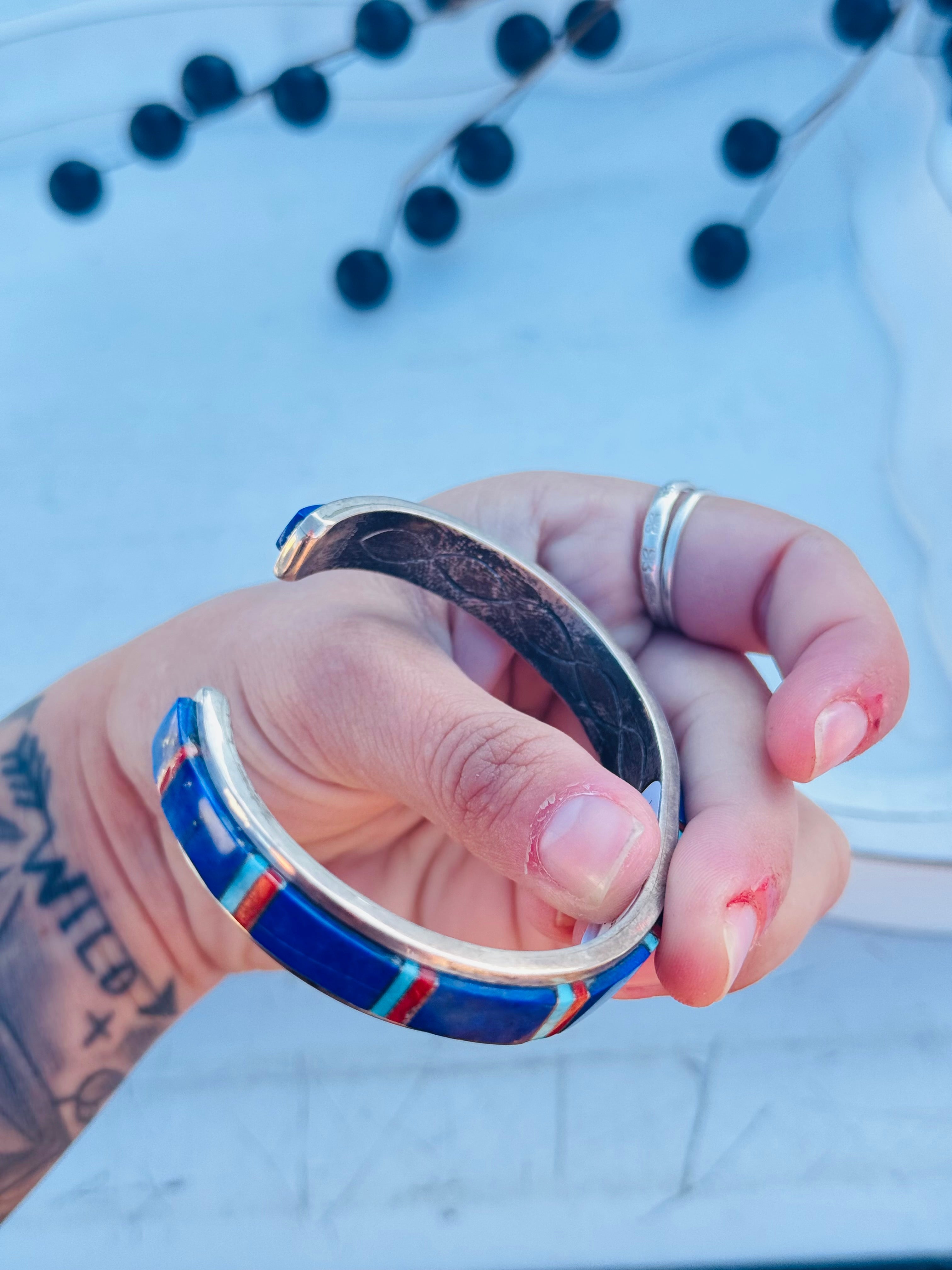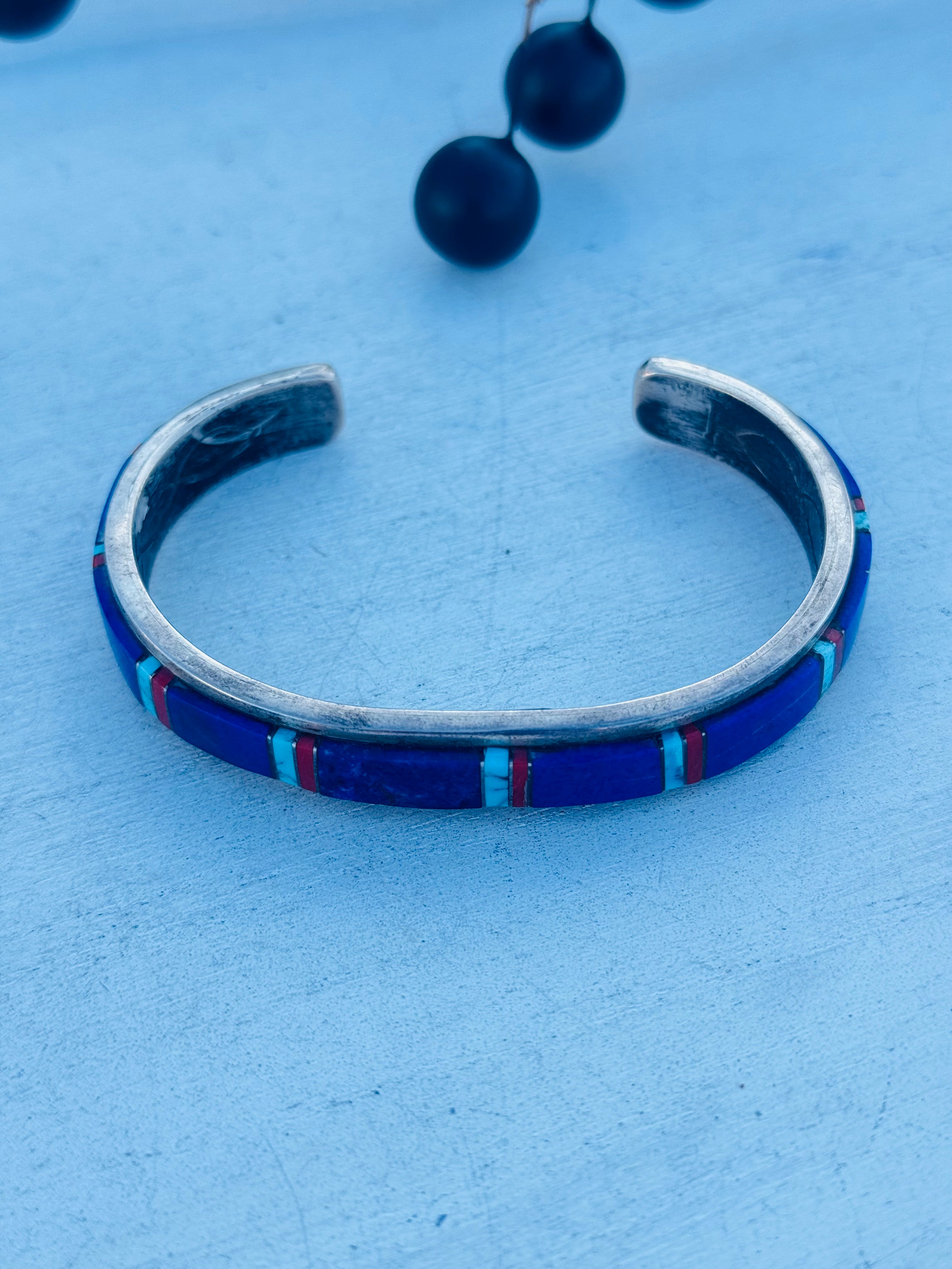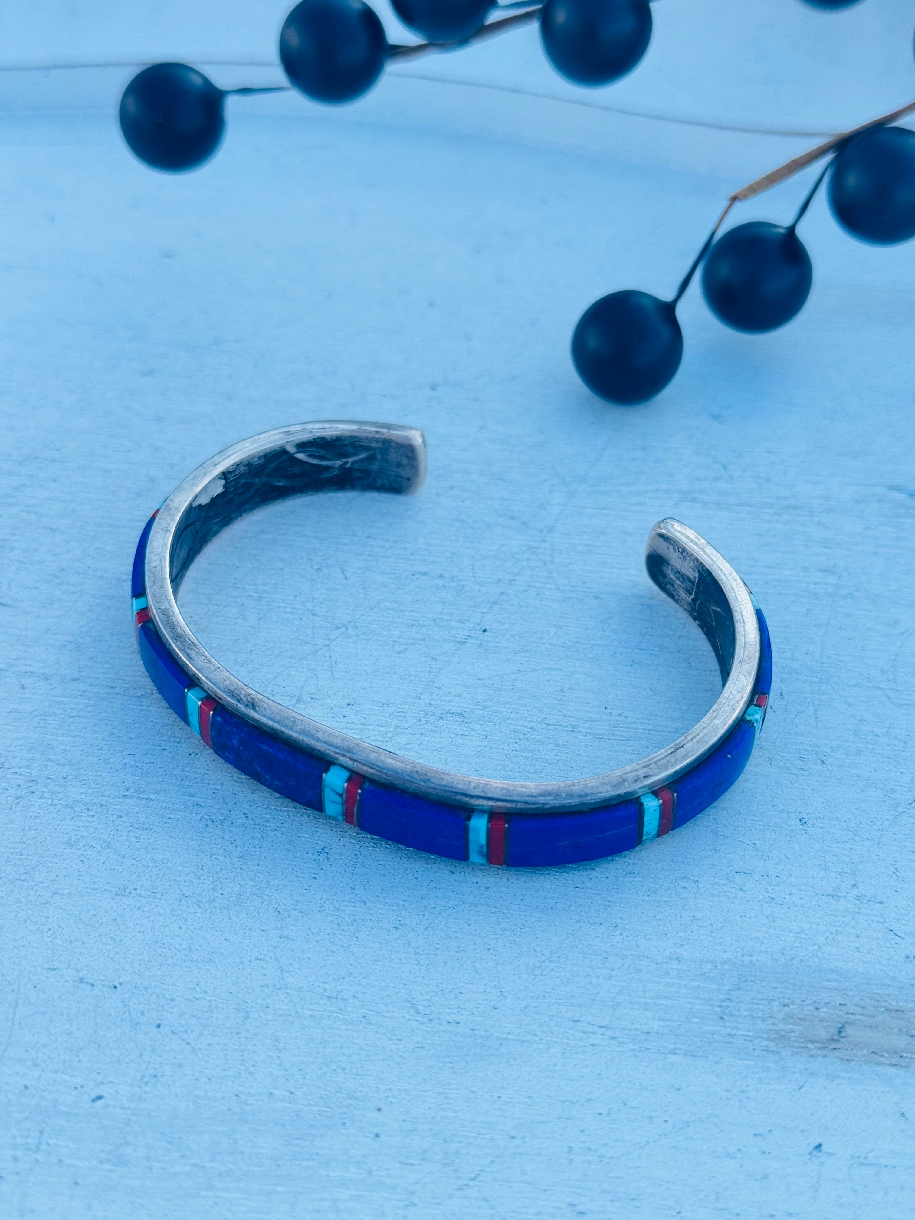 Wilson Daves Multi Stone & Sterling Silver Inlay Cuff Bracelet. It measures just over 3/8 of an inch wide with an inside circumference of 6 5/8 inches and a gap of 1 3/8 inches. Signed by artist and stamped sterling silver.