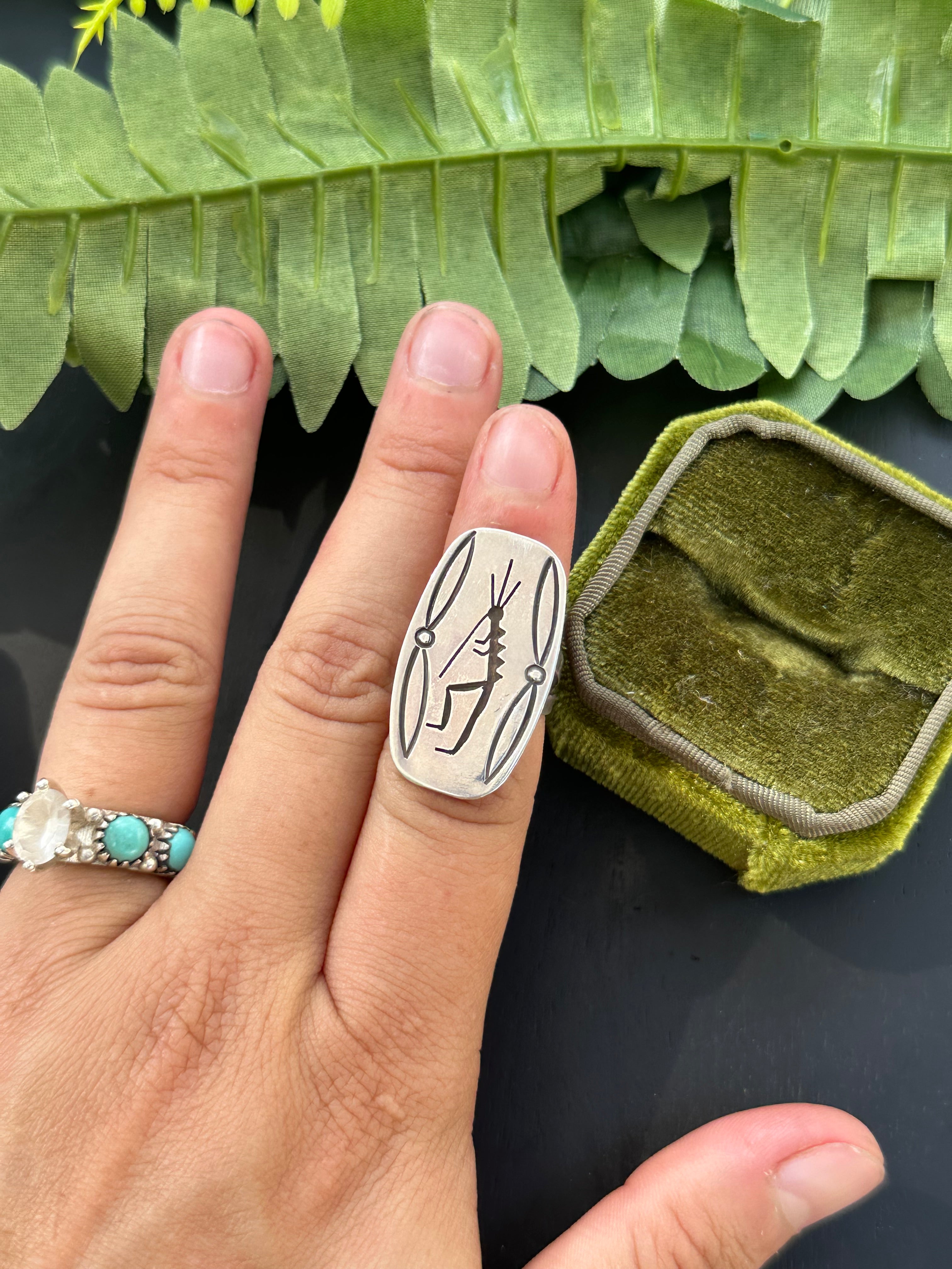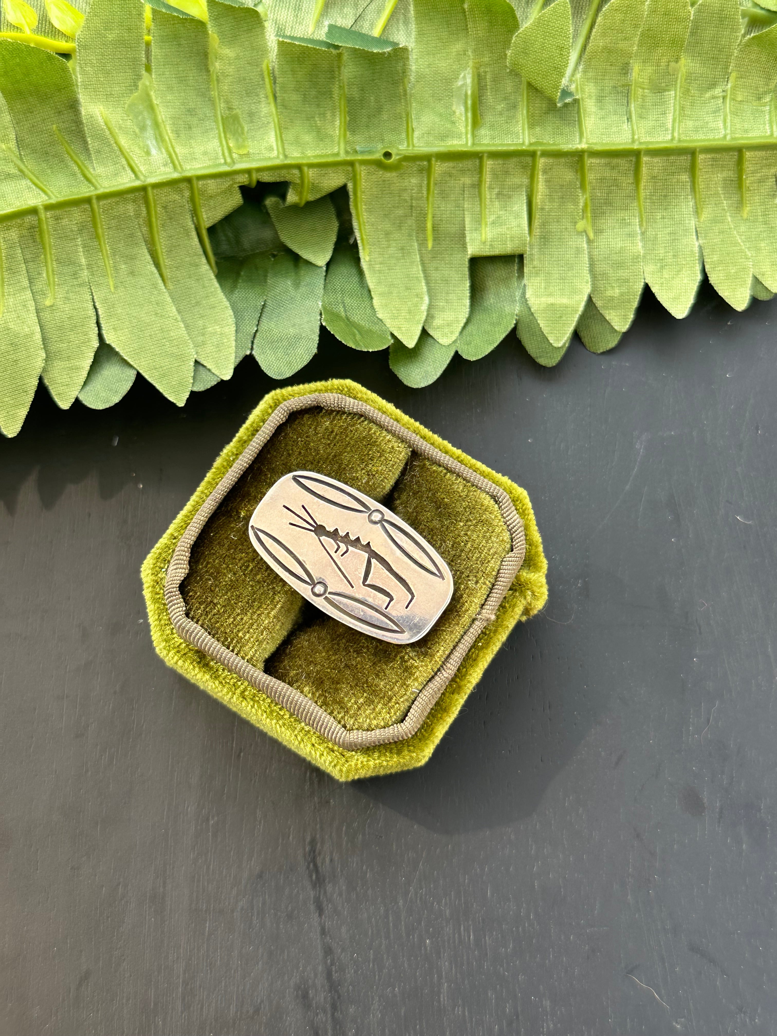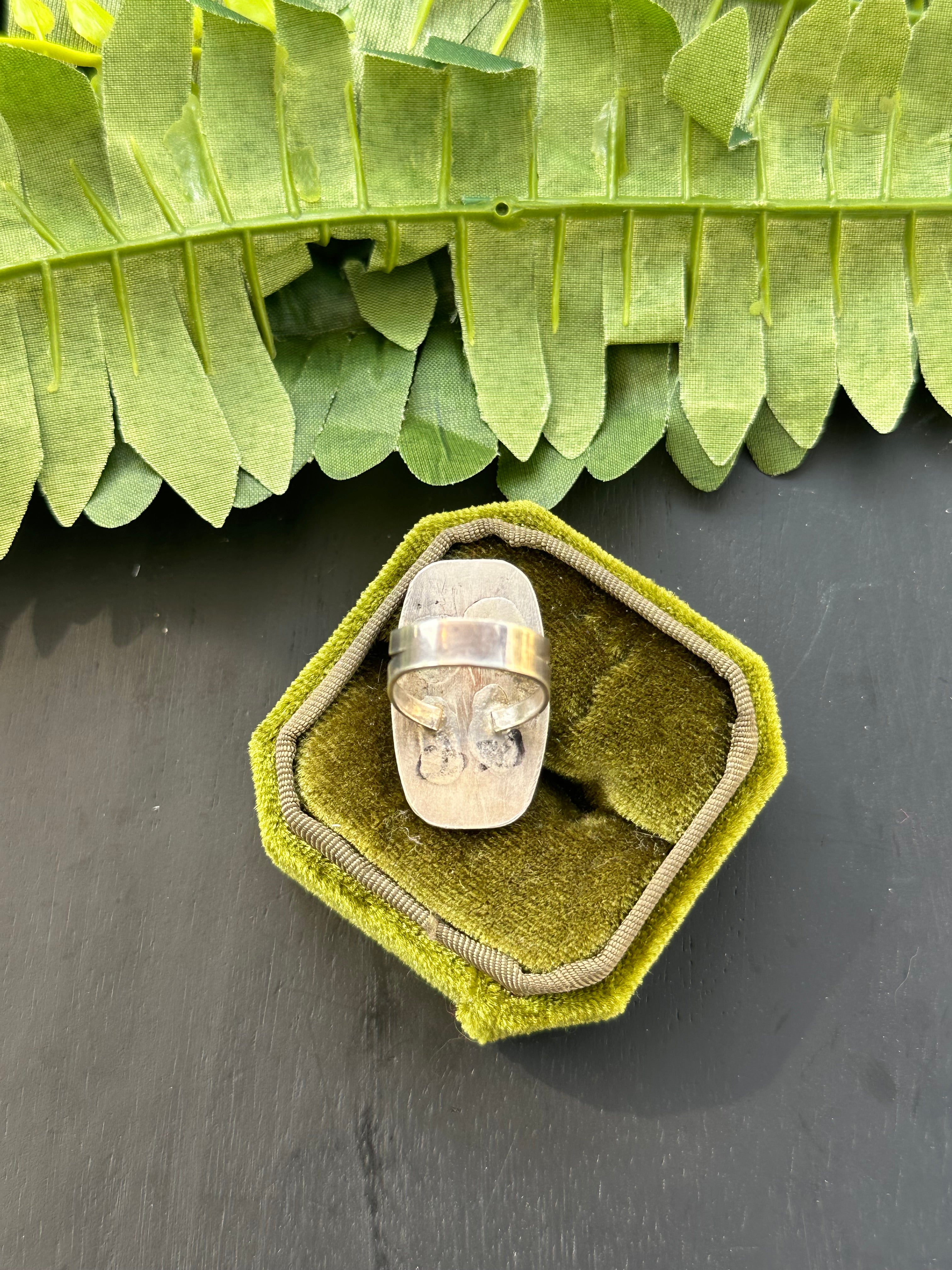 Vintage Navajo Made Sterling Silver Ring Size 4. It measures 1 1/4 inches long and 5/8 of an inch wide.