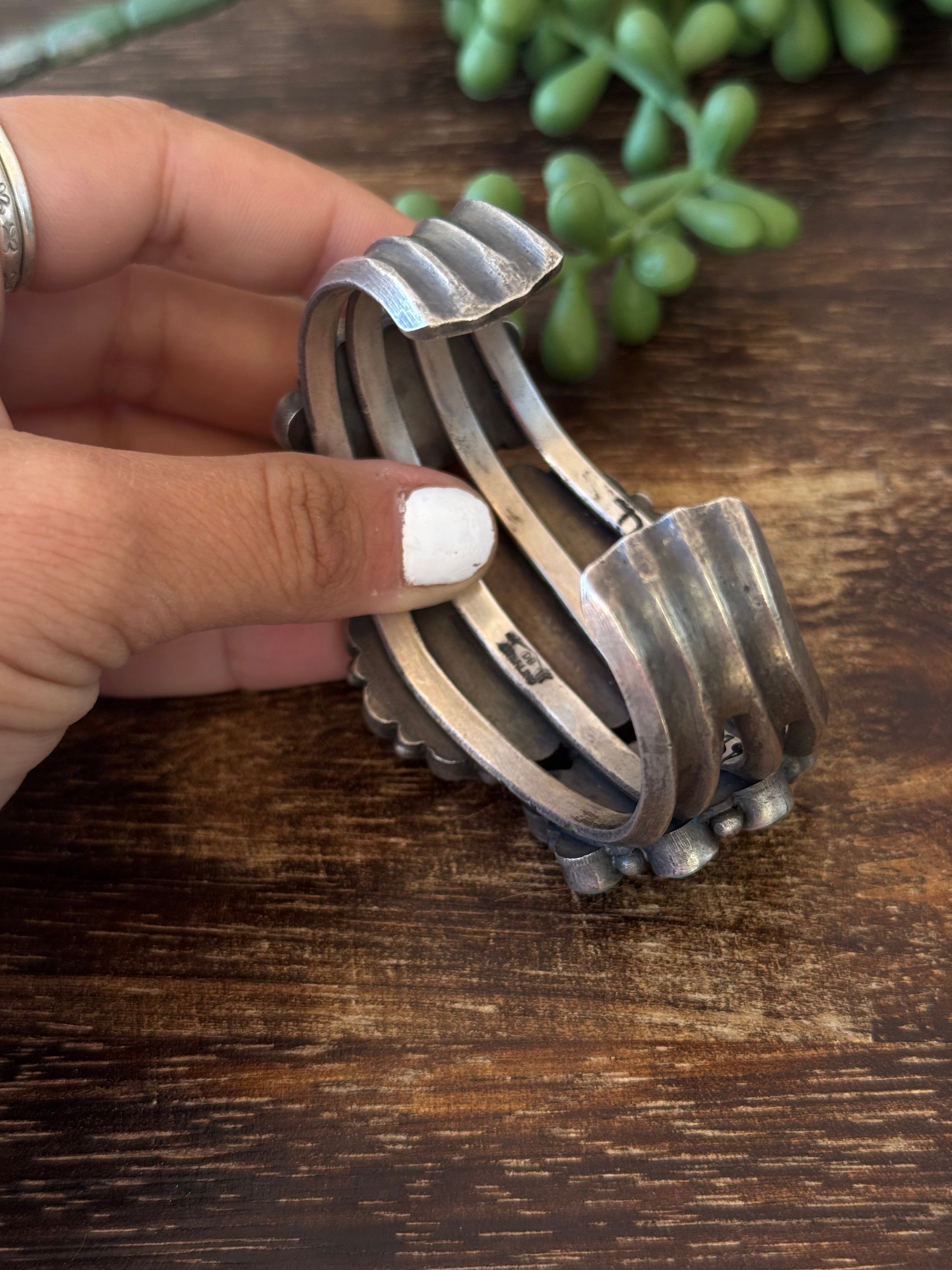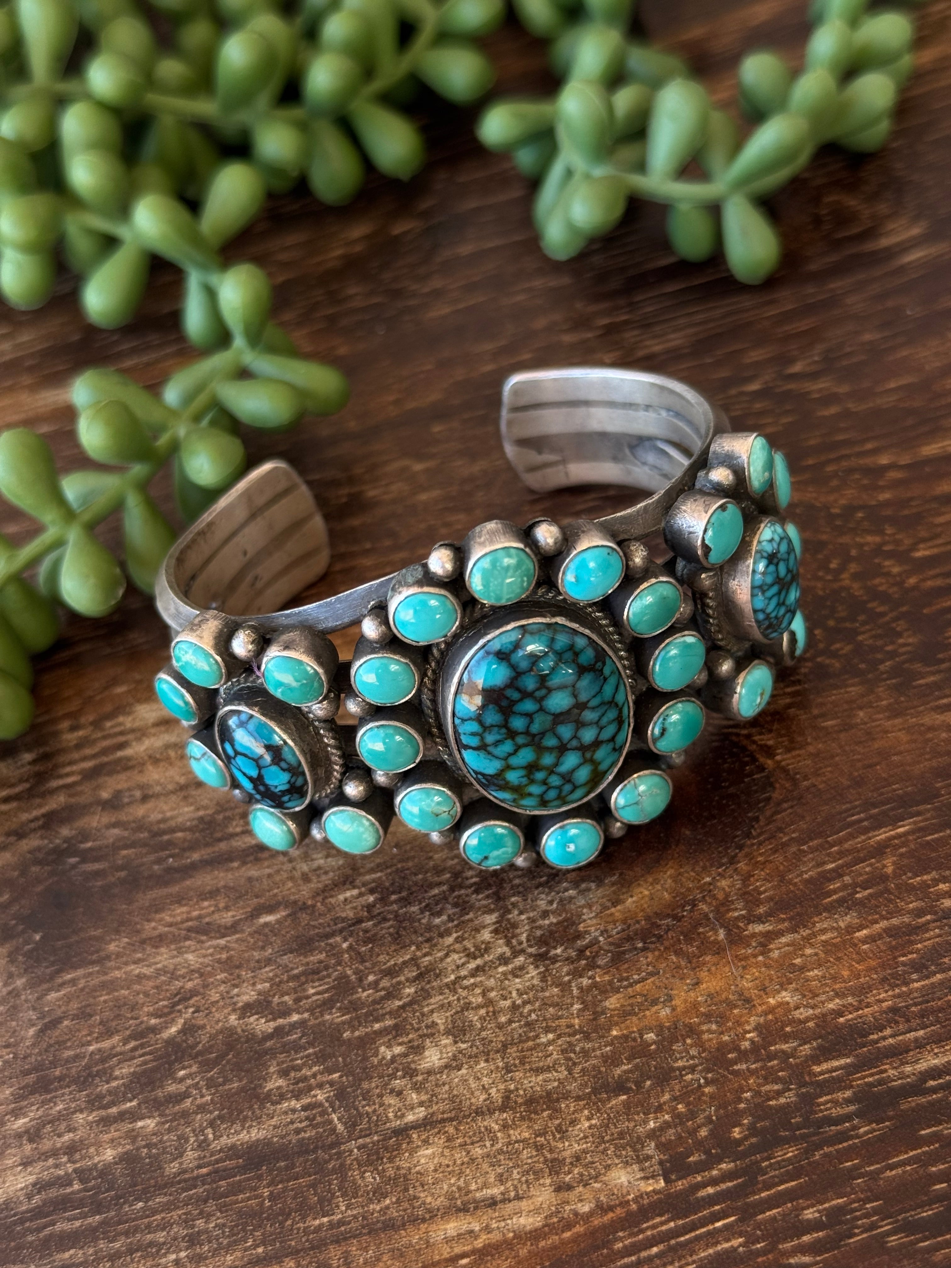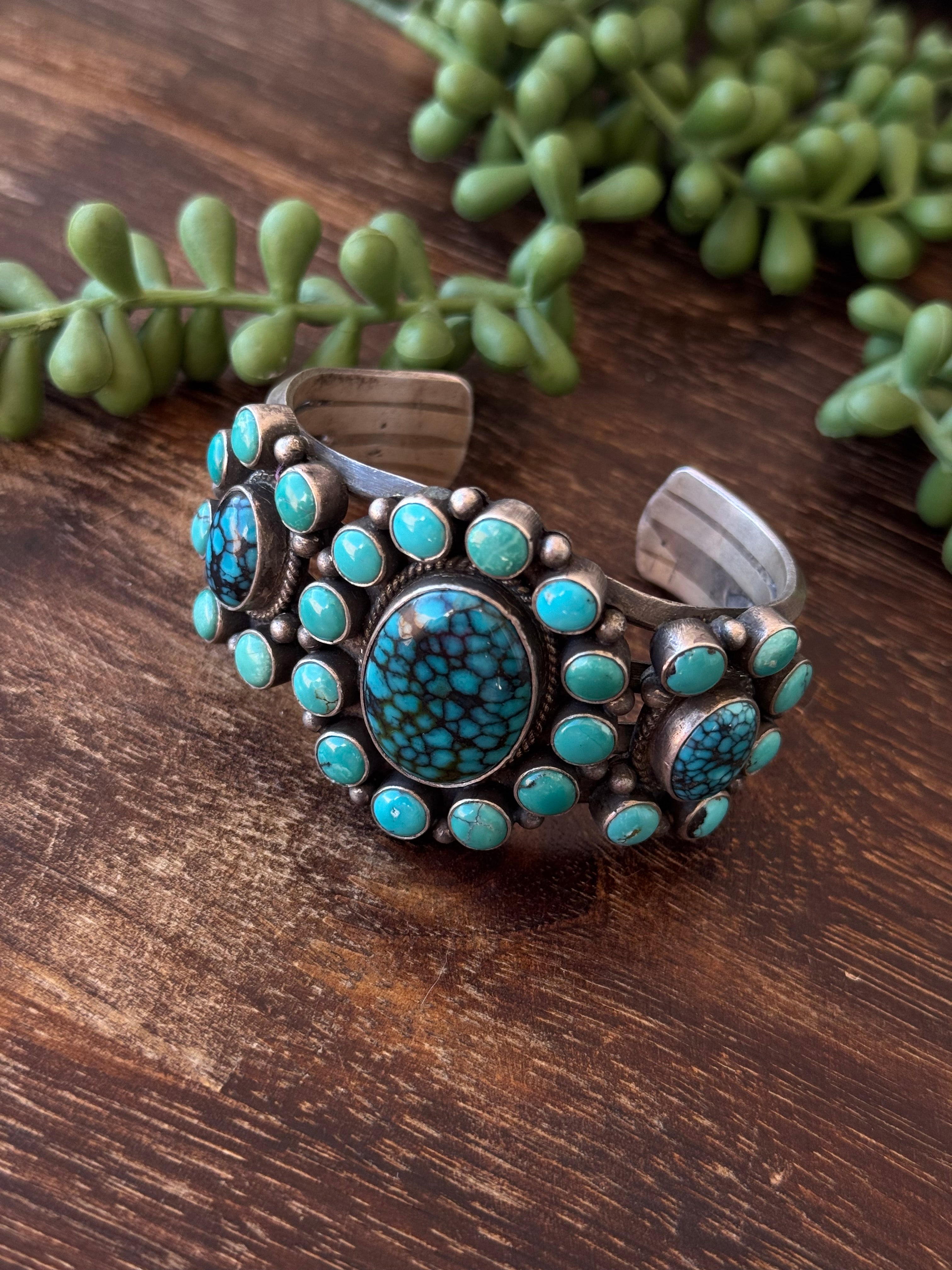 Vintage Navajo Made Mixed Turquoise Sterling Silver Cluster Cuff Bracelet