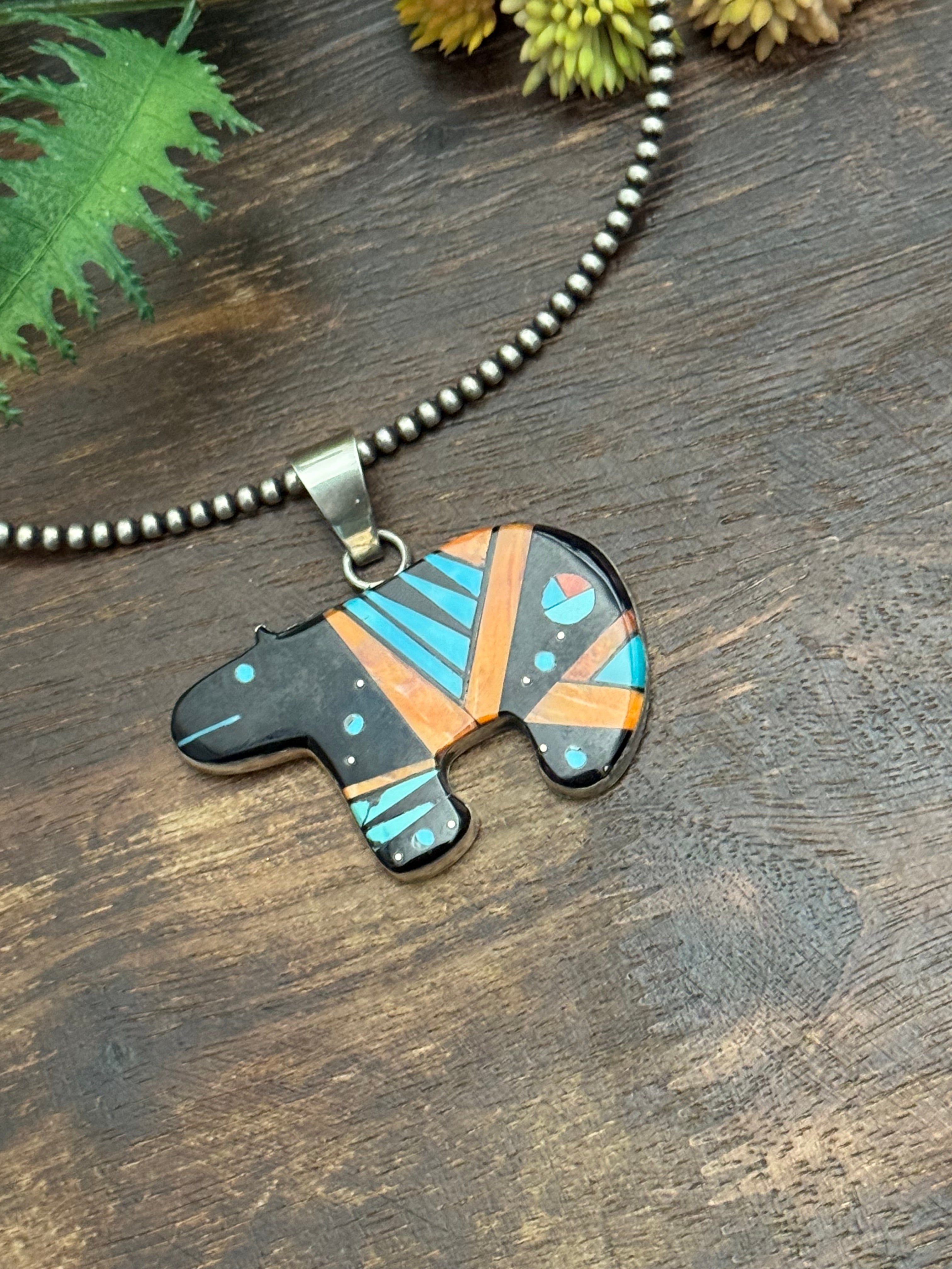 Vintage Zuni Made Multi Stone & Sterling Silver Inlay Bear Pendant