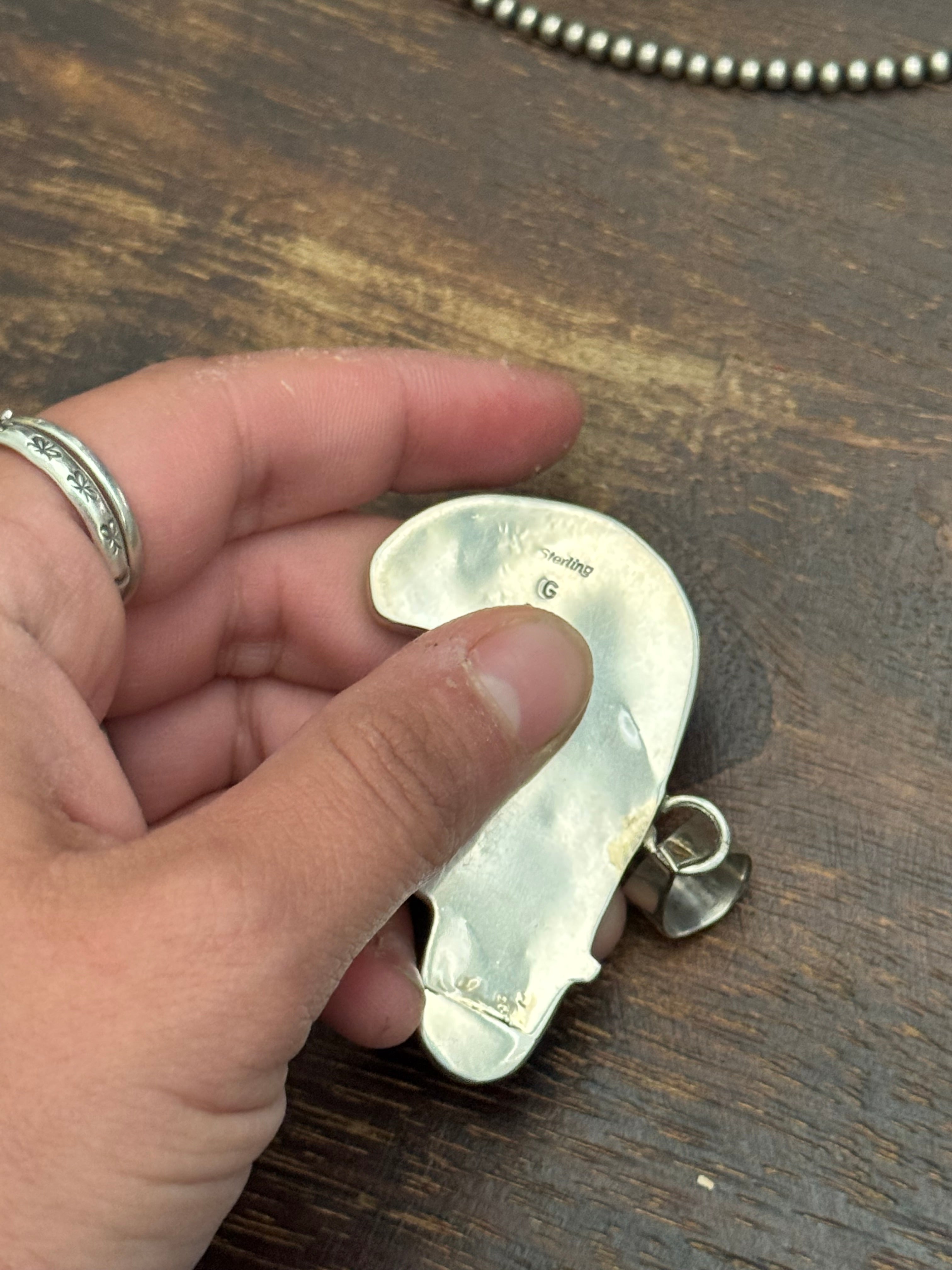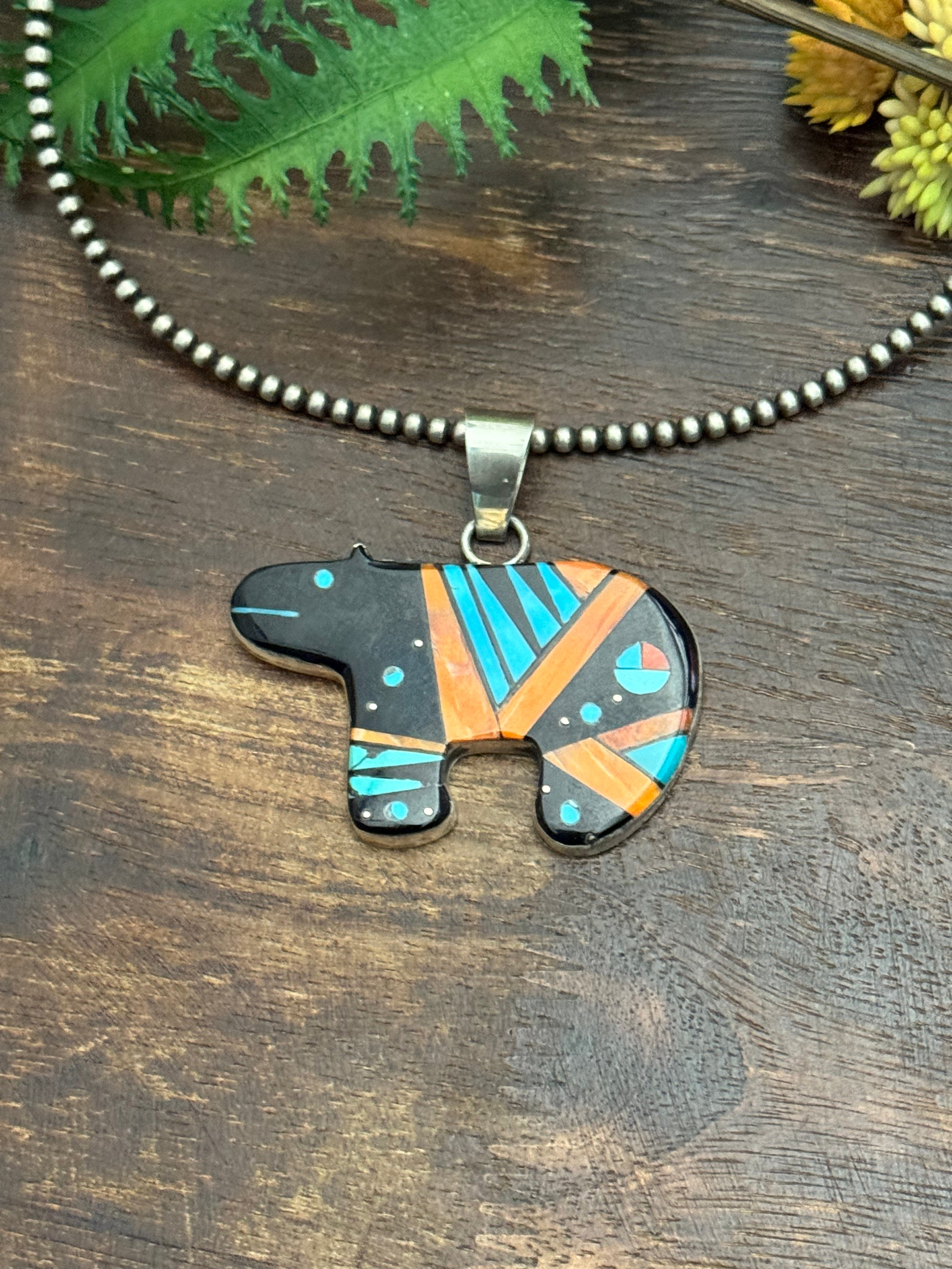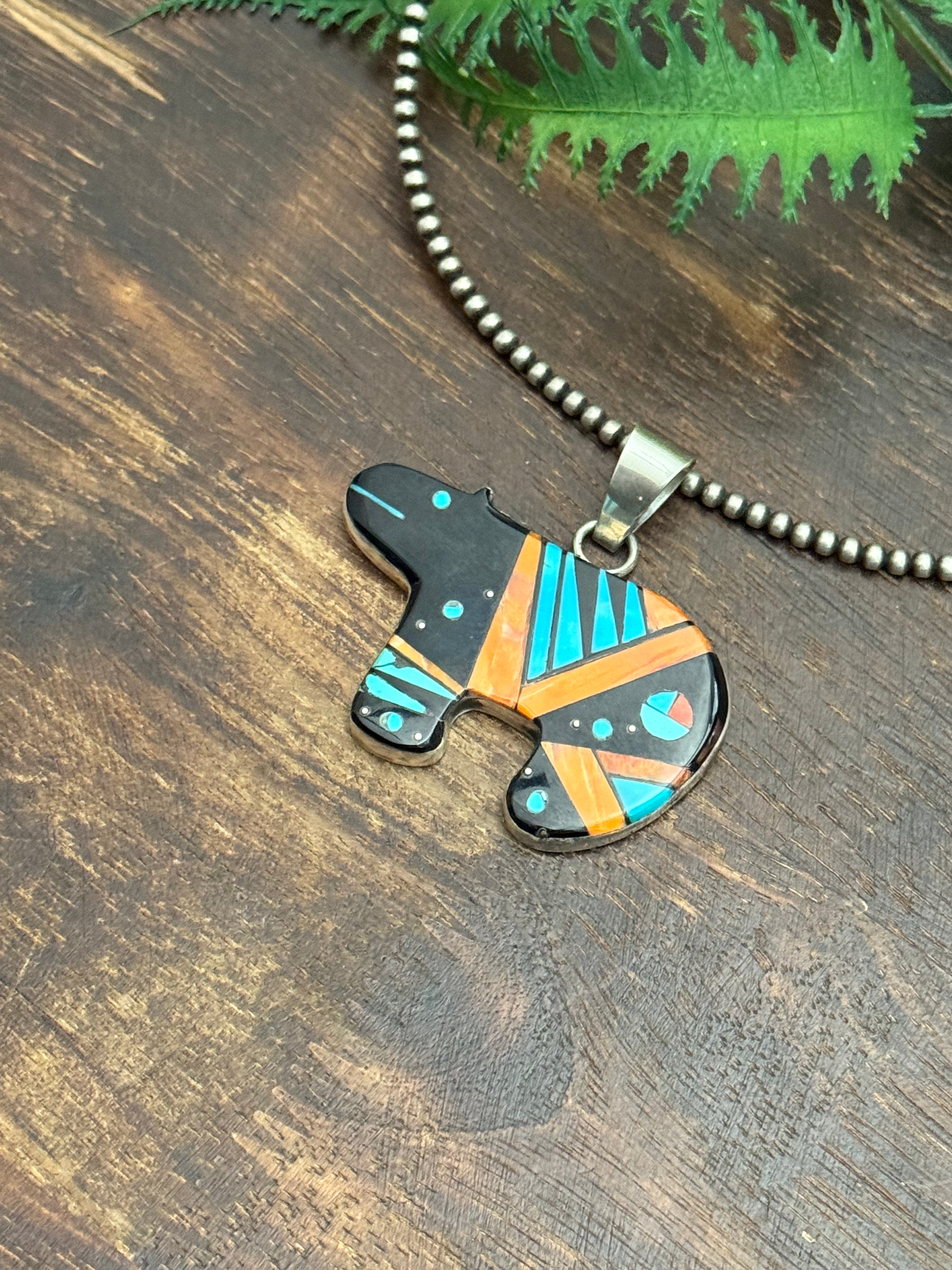 Vintage Zuni Made Multi Stone & Sterling Silver Inlay Bear Pendant. It measures 2 1/8 inches long and 2 1/8 inches wide. Pendant Only!! Signed by the artist and stamped sterling silver.
